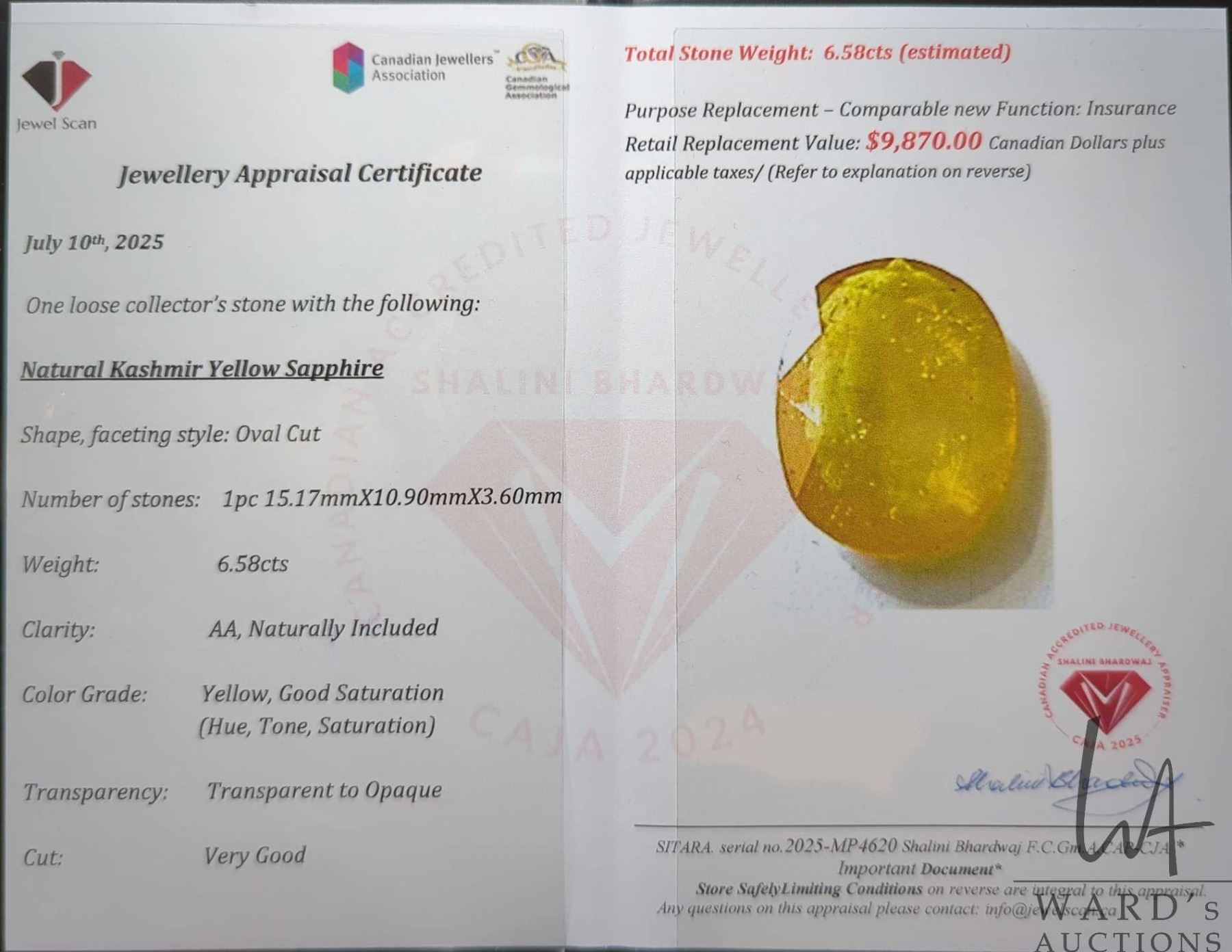 6.58 ct certified Yellow Sapphire gemstone, Certificate provided by consignor