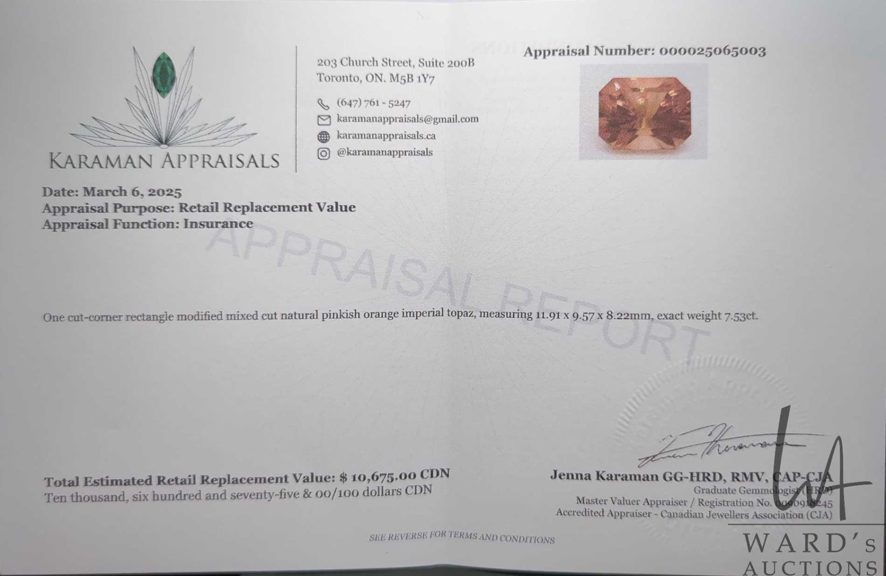 7.53 ct Certified Untreated Imperial Topaz Gemstoe with certificate provided by consignor