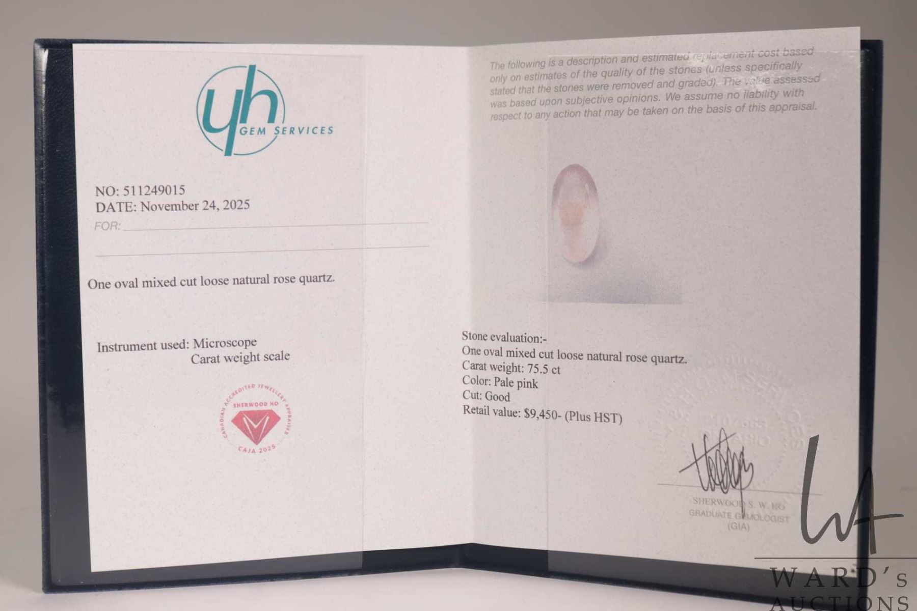 75.5ct oval natural rose quartz gemstone with certificate provided by consignor