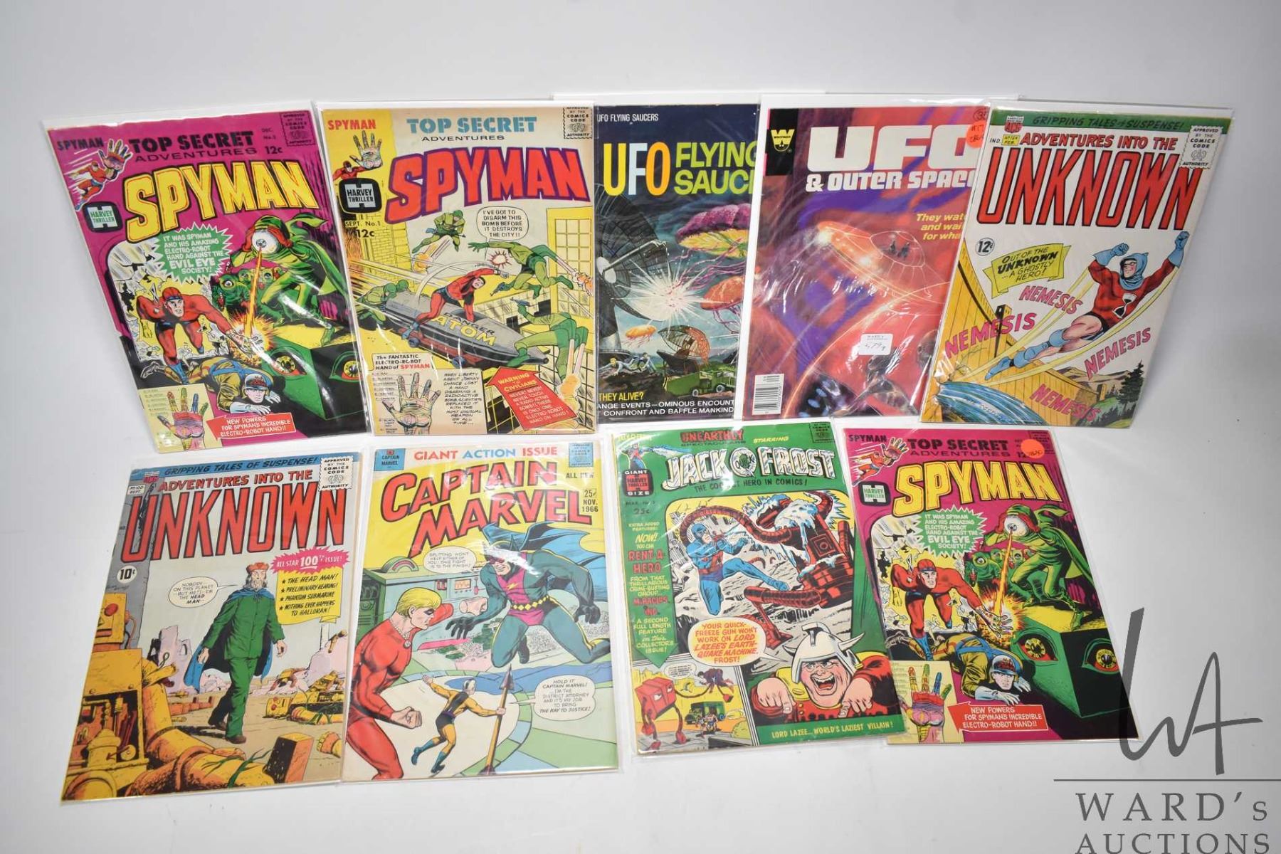 9 assorted comics including 4 Harvey Thriller; 3 Spyman & 1 Jack Quickfrost, 2 ACG; Adventures into the Unknown, 1 Captain Marvel, 1 Goldkey UFO Flying Saucer & 1 Whitman UFO & Outer Space