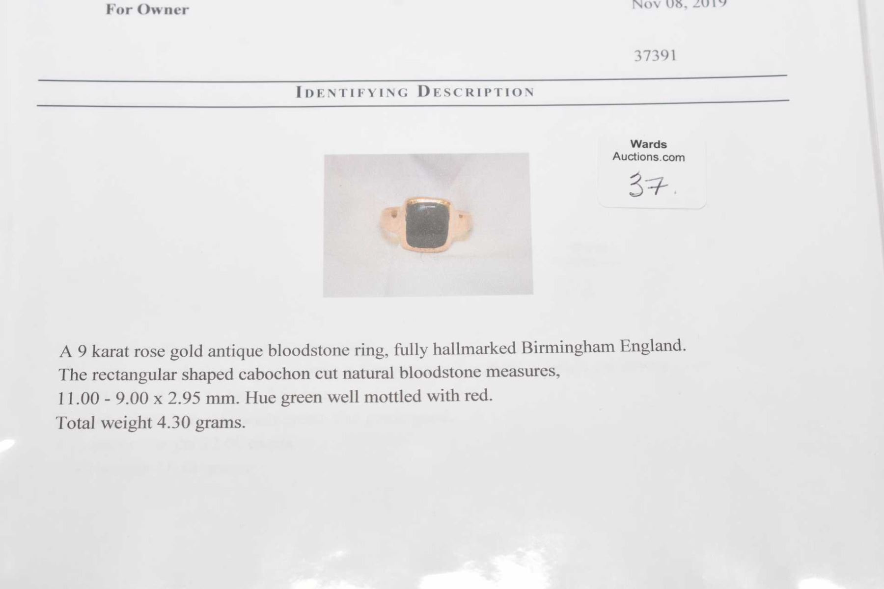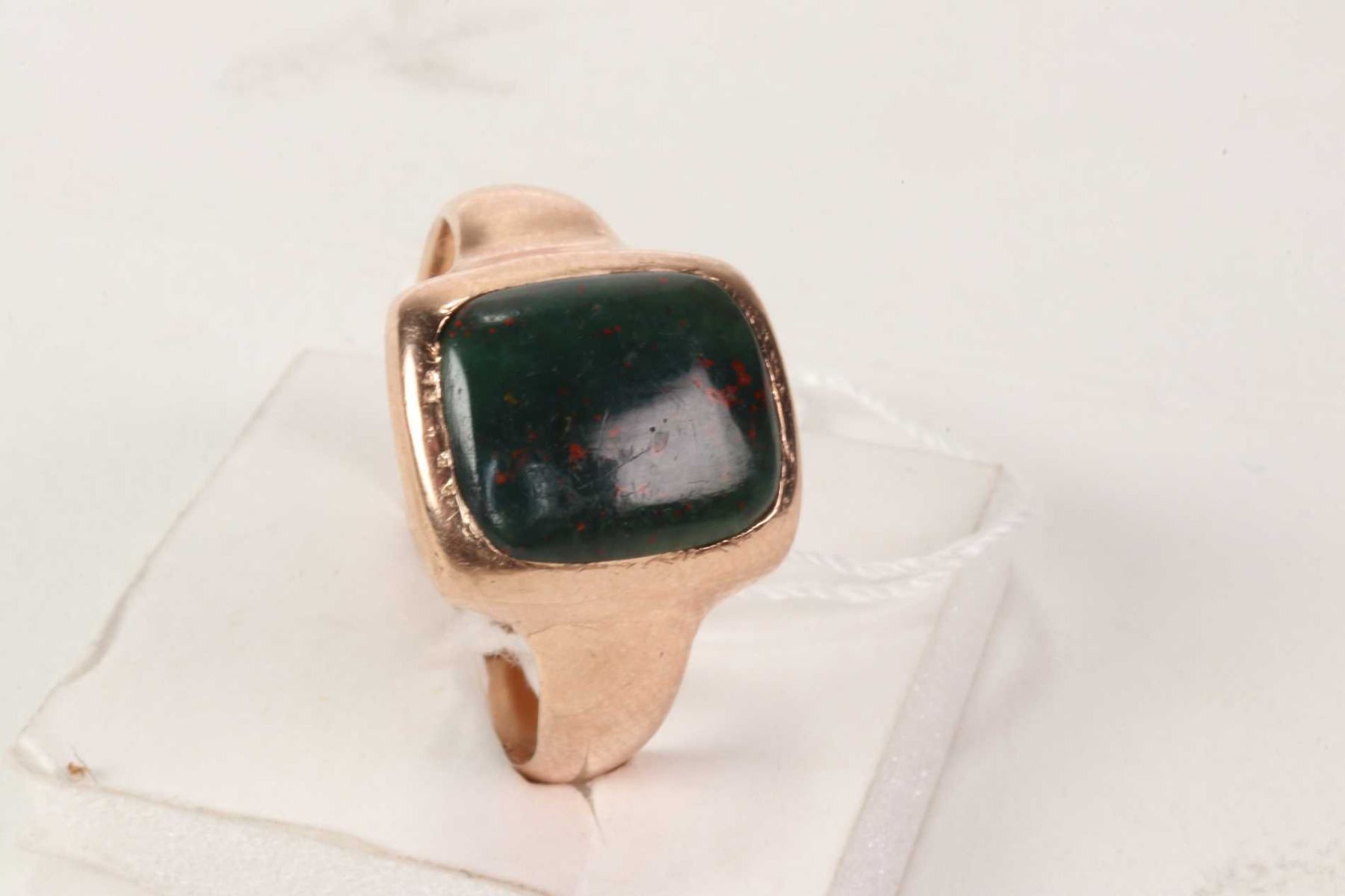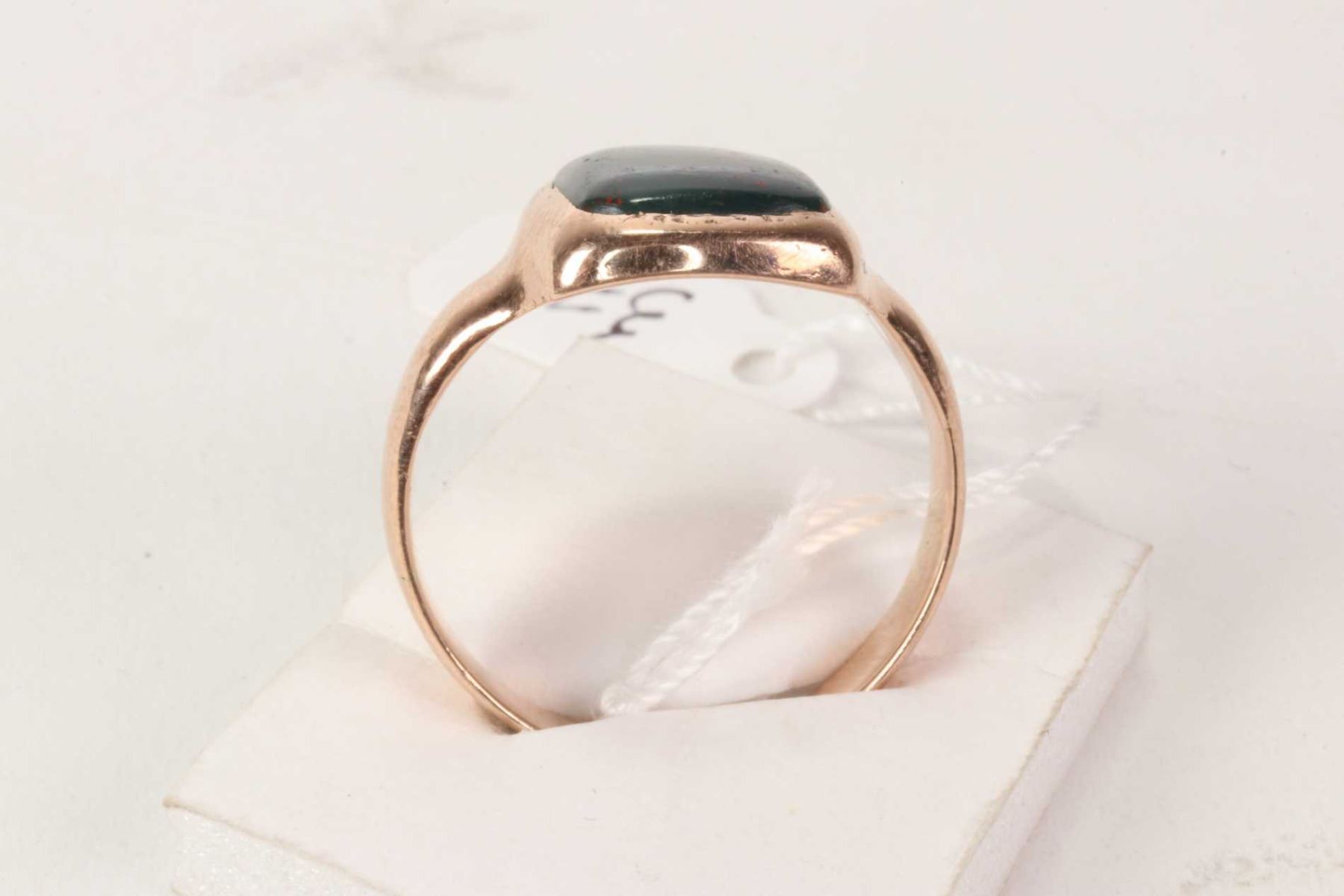 9ct rose gold and antique blood stone ring with English Birmingham hallmarks. Retail replacement value $600.00