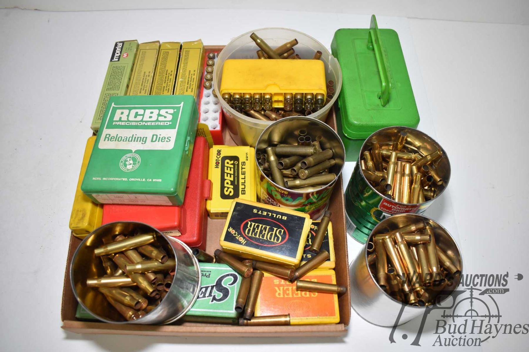 A Bonanza .30-06 bench rest die set, a Lee .30-06 Springfield die set, an RCBS .30-30 WCF die set, plus brass and lead for said dies