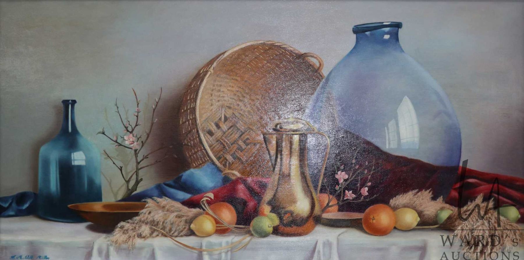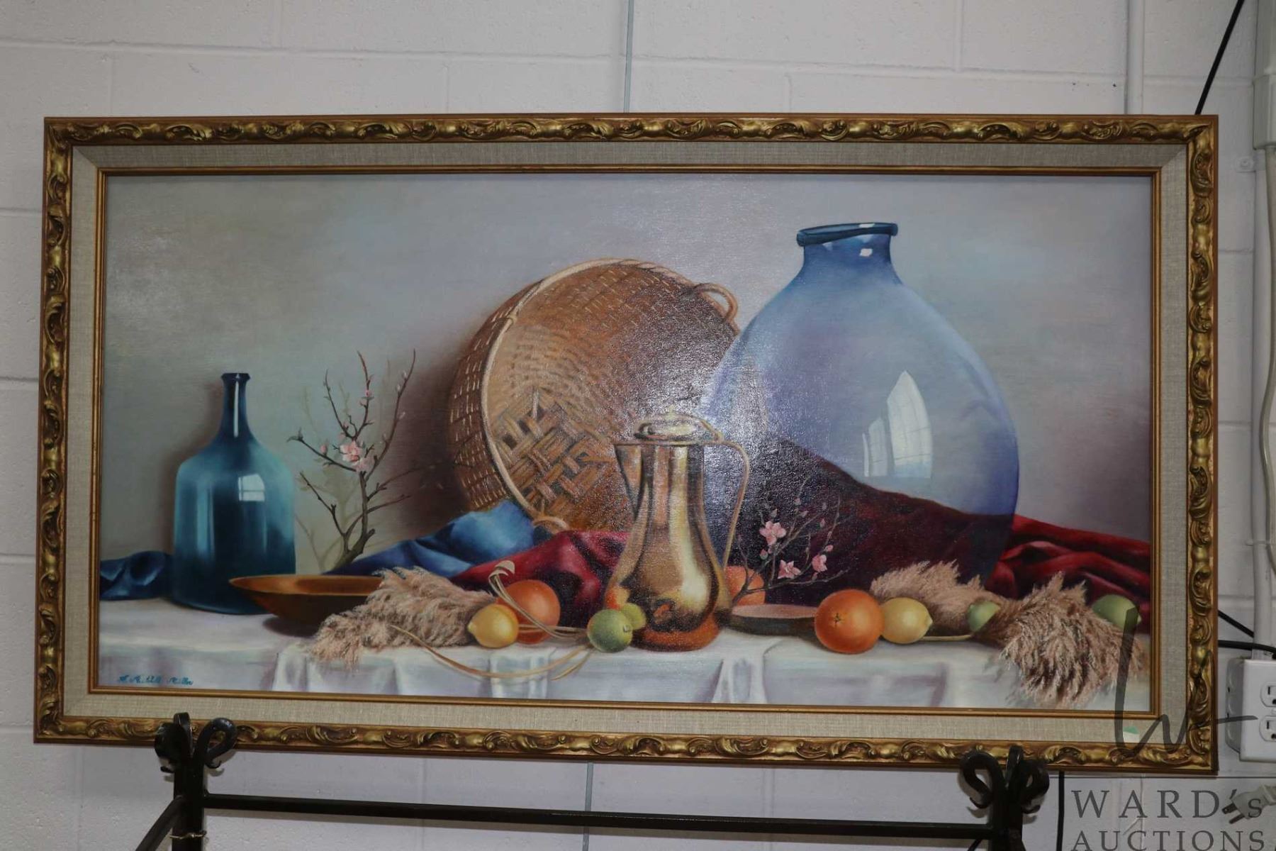 A. Mitchell Miller, framed oil on board still-life painting of fruits, flowers and vessels, signed by artist, 23 1/2" X 47 3/4"