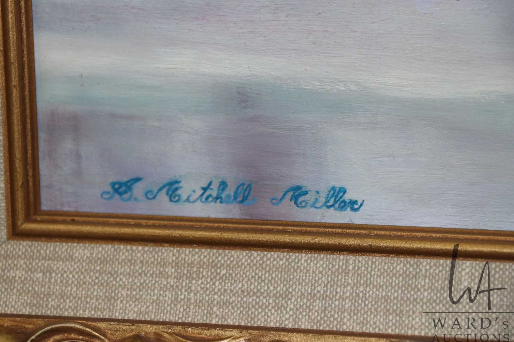 A. Mitchell Miller, framed oil on board still-life painting of fruits, flowers and vessels, signed b