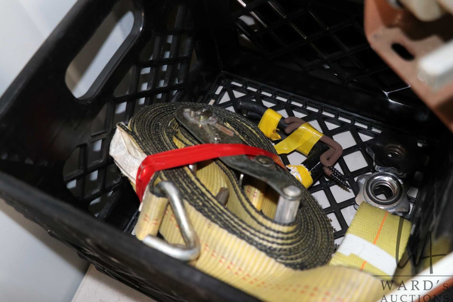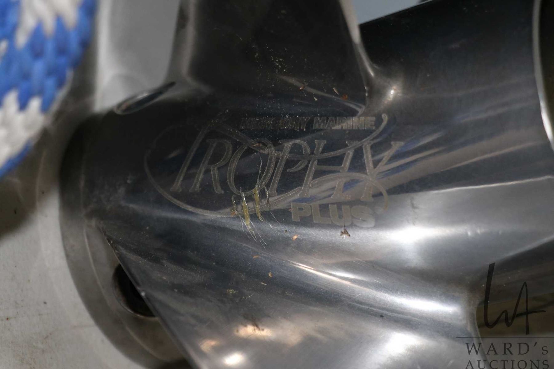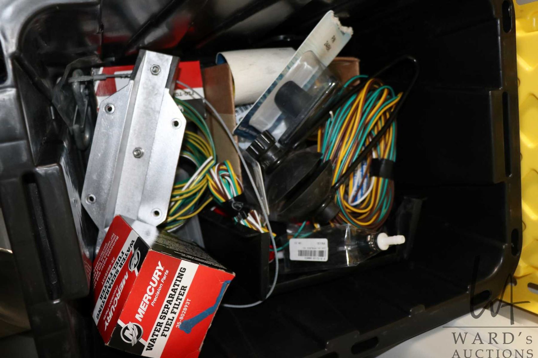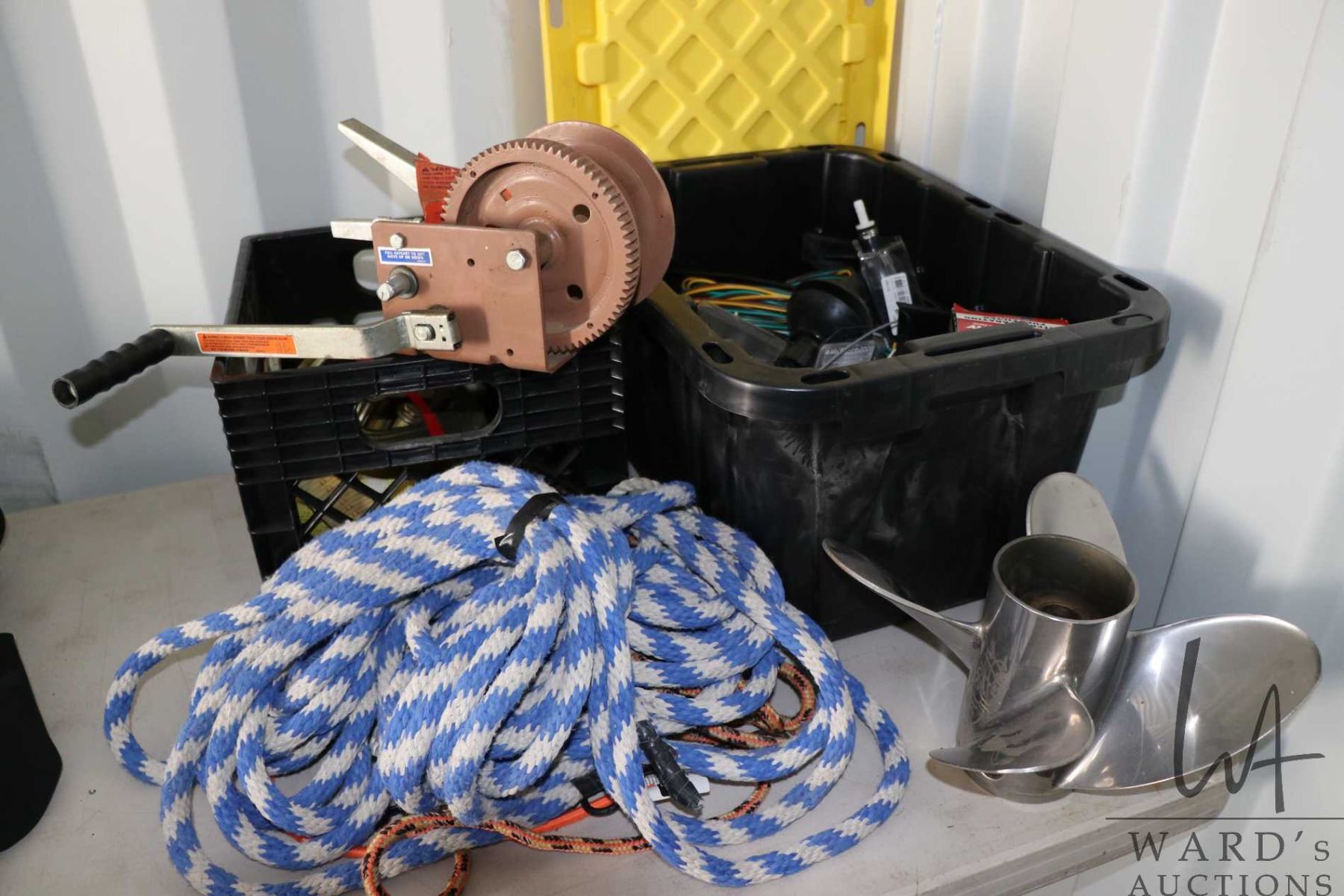 A black and yellow storage tote filled with boat and trailer repair supplies and a milk crate with a trailer winch, tow strap, and other assorted hardware. Also includes a Mercury Marine Trophy Plus propellor and bundles of rope
