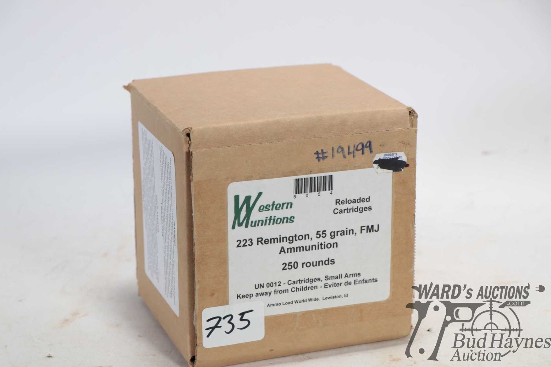 A box of 250 Western Munitions 223 Remington,55 Grain, FMJ Ammunition. Reloaded cartridges