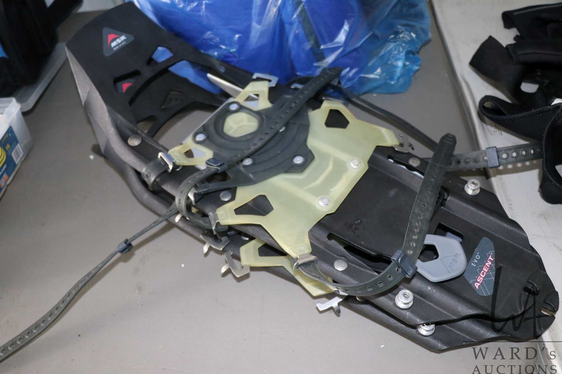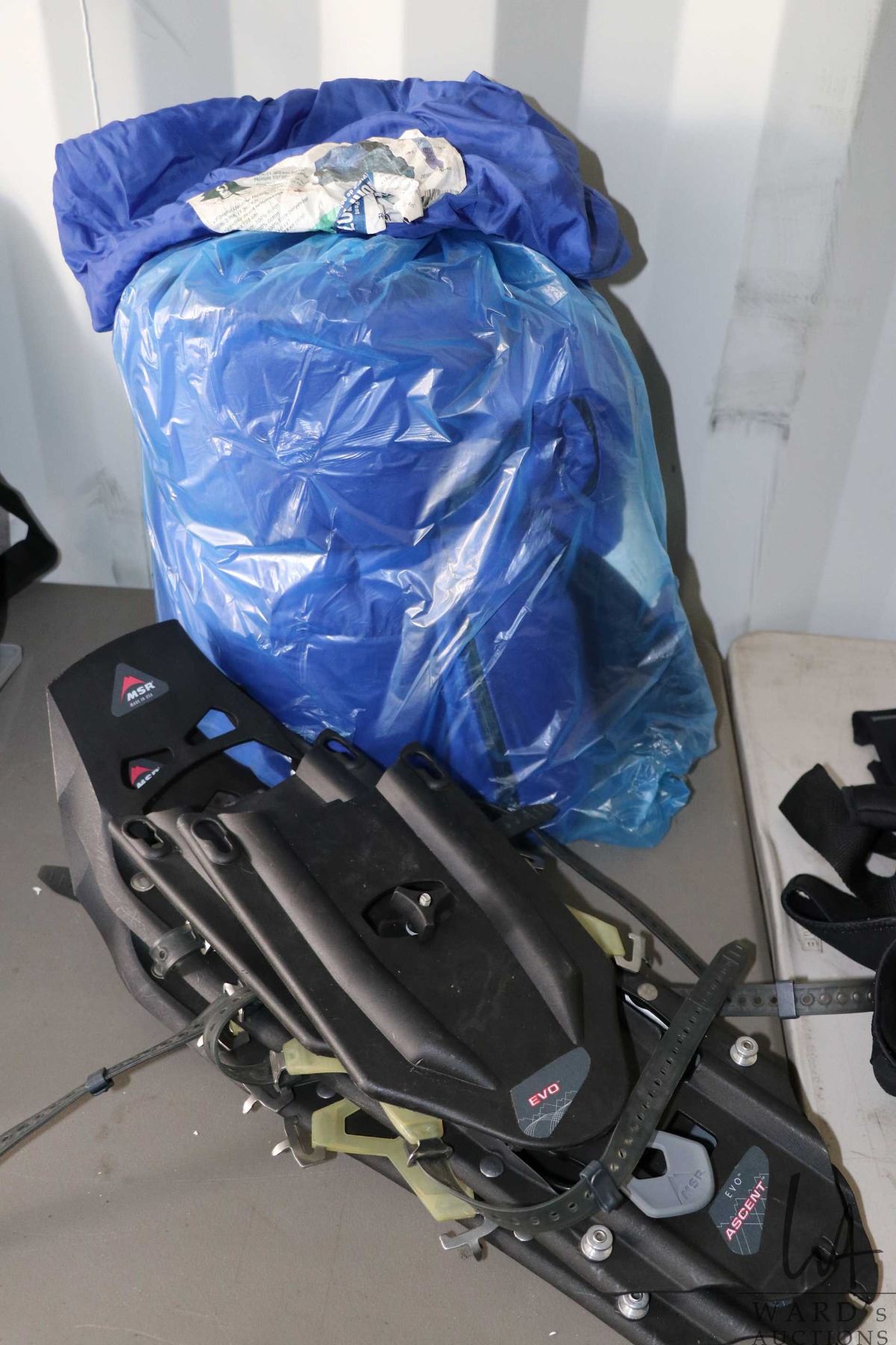 A pair of MSR EVO Ascent Snow shoes and a sleeping bag