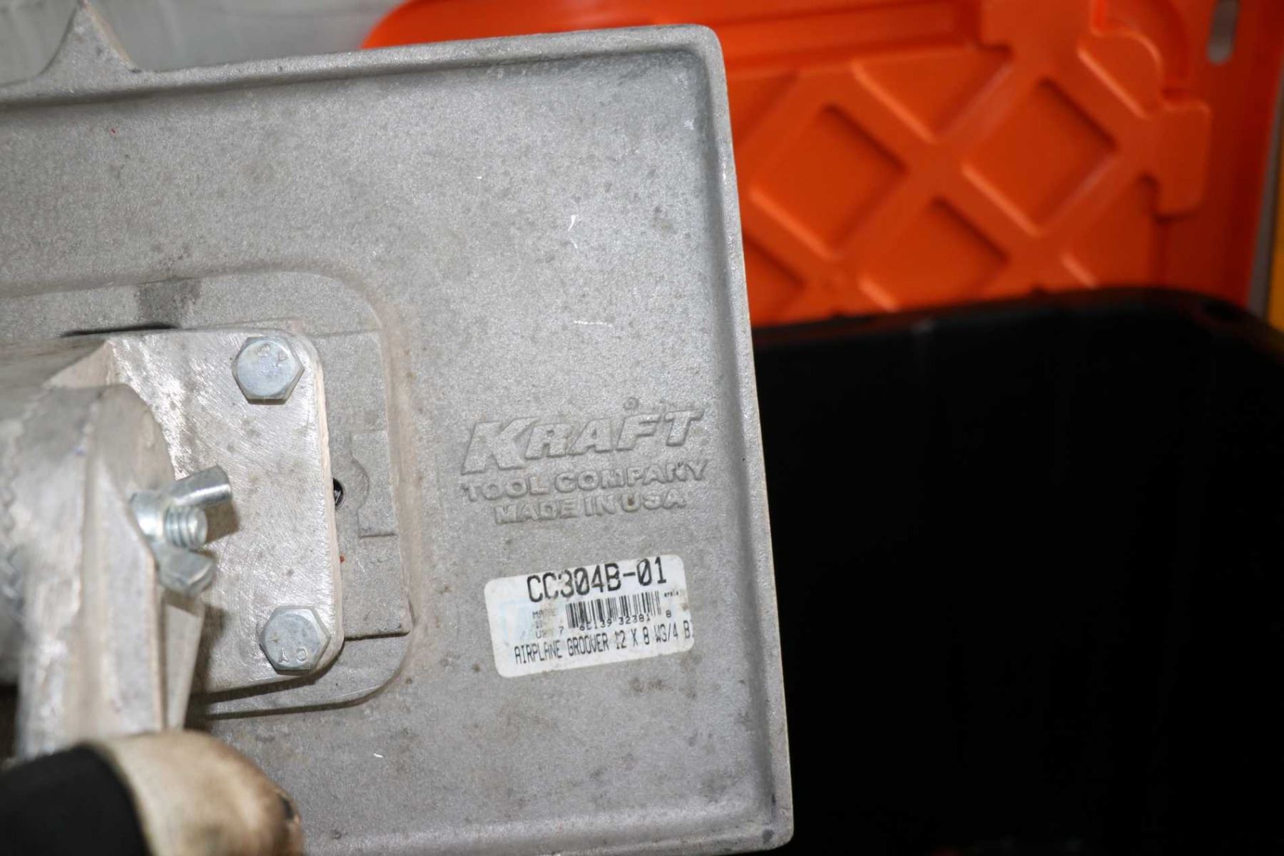 A selection of concrete finishing tools including floats, chisels, brushes, joint groover tools, and