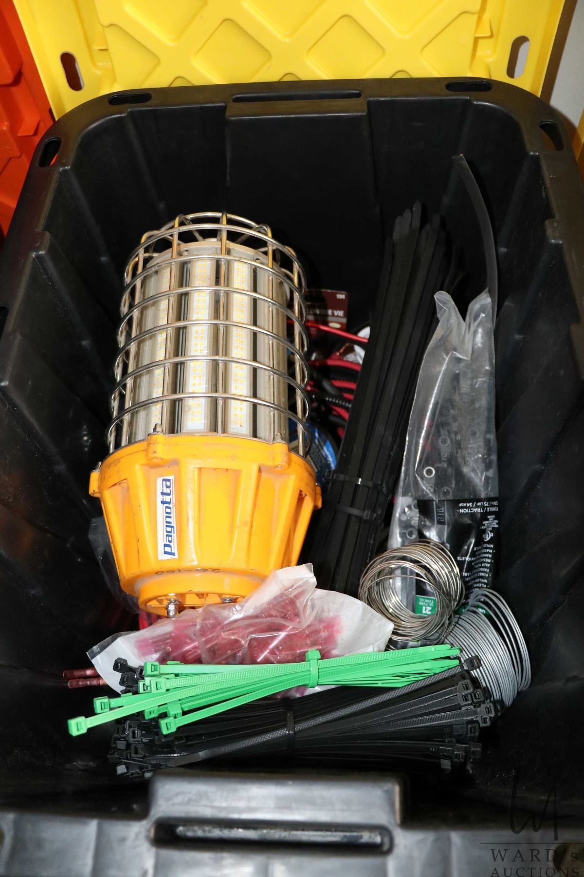 A selection of electrical supplies including solder, zipe ties, wire, lights, etc