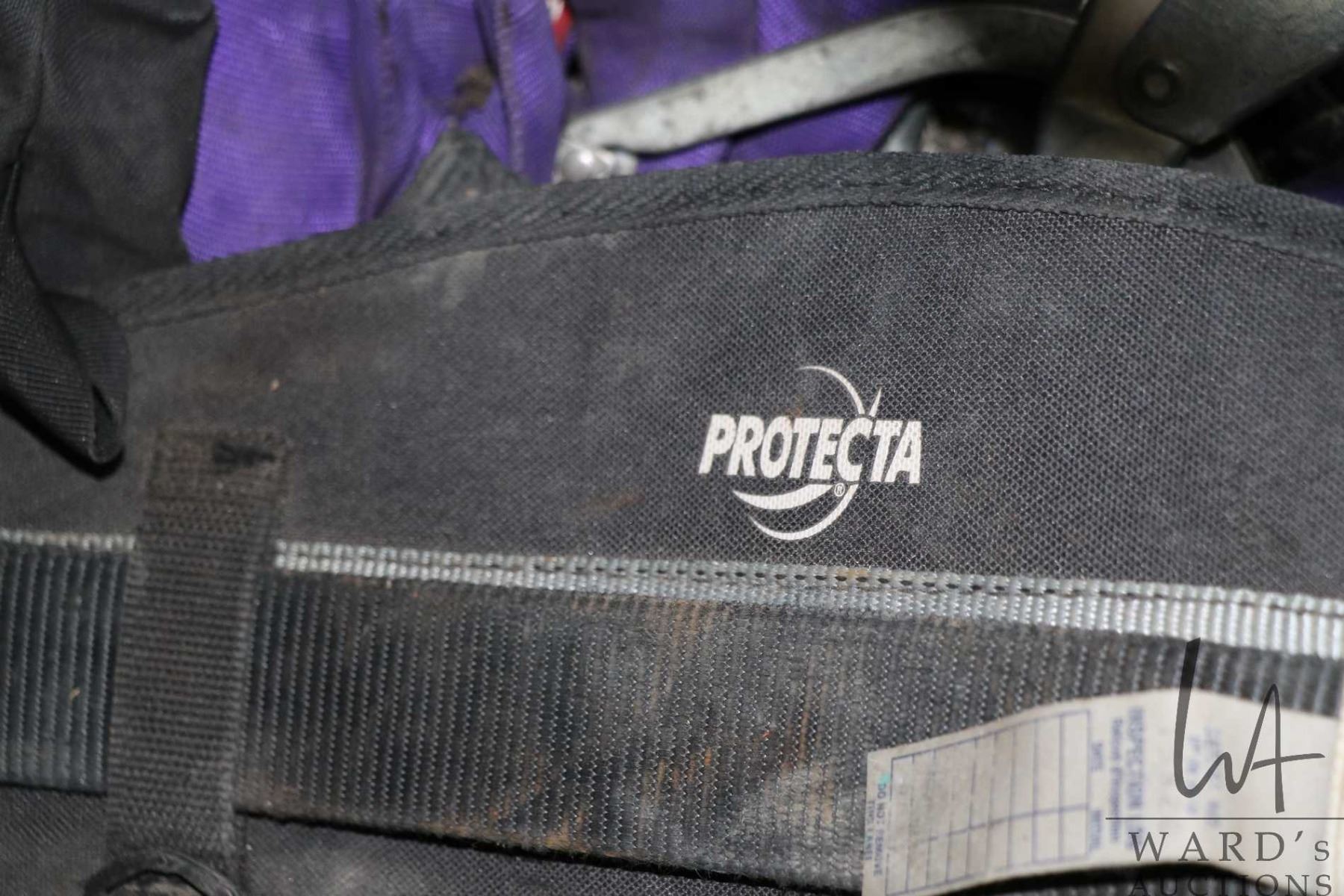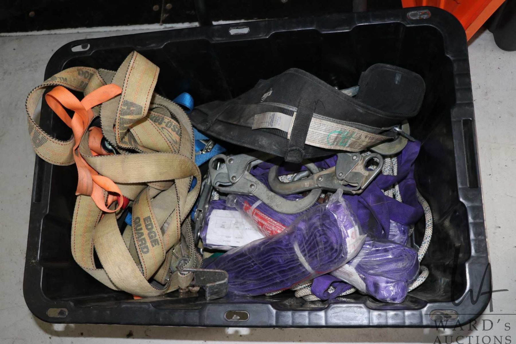 A selection of fall arrest equipment including ropes, caribiners, straps, and a black tote