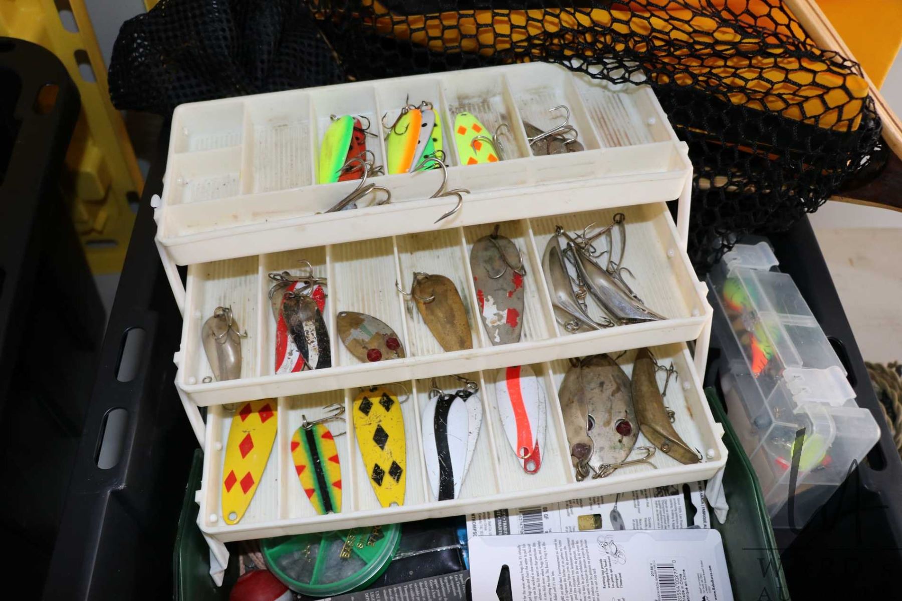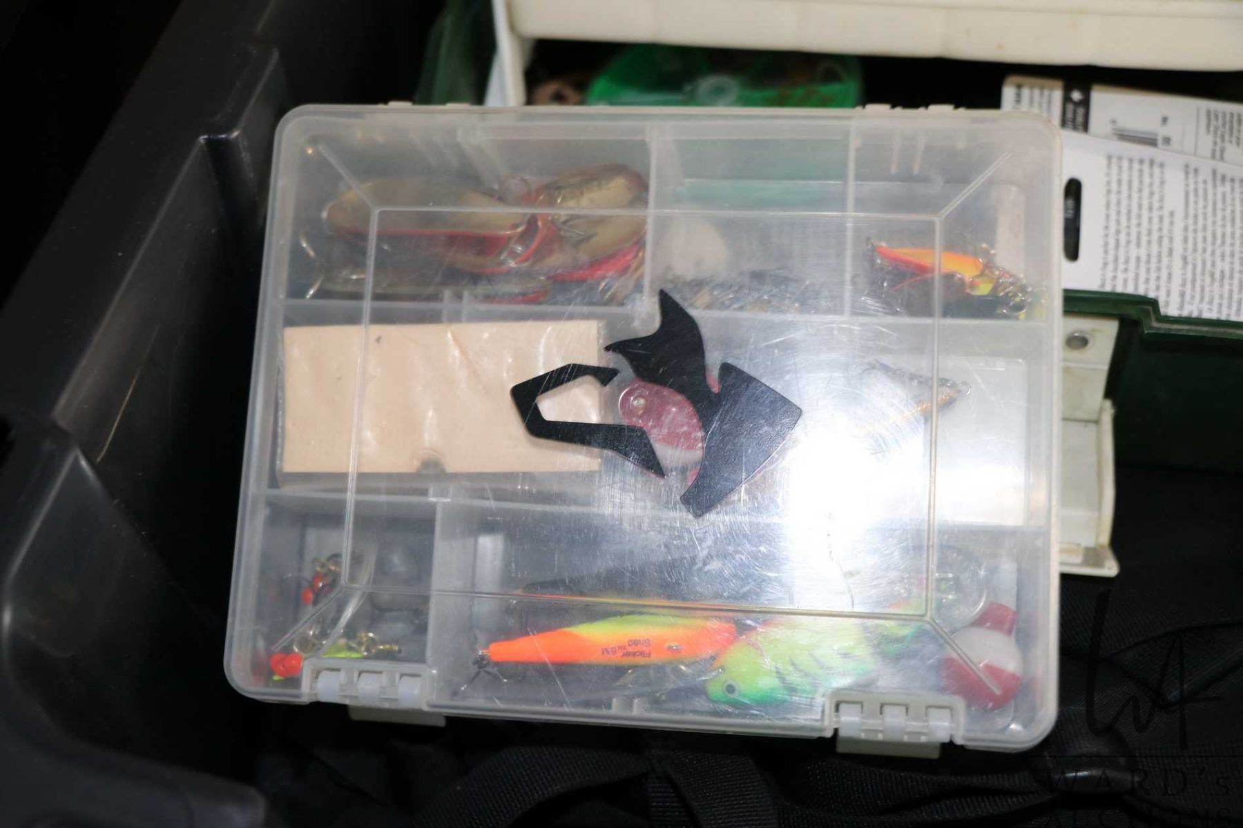 A selection of fishing supplies including green tacklebox with lures and weights, small case with ad