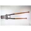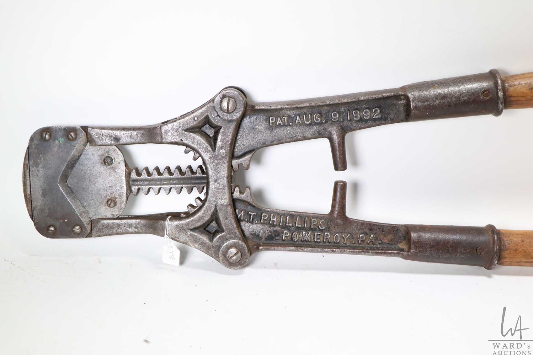 A set of vintage cattle dehorning shears marked M.T. Phillips, Pomeroy PA, 47" in length