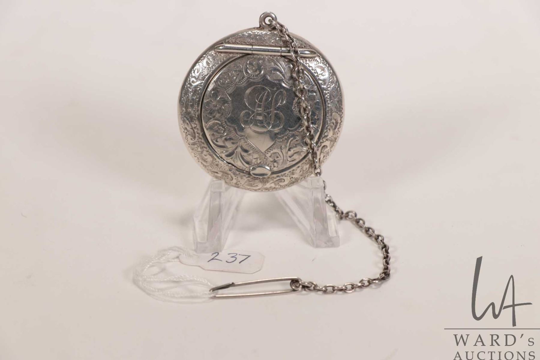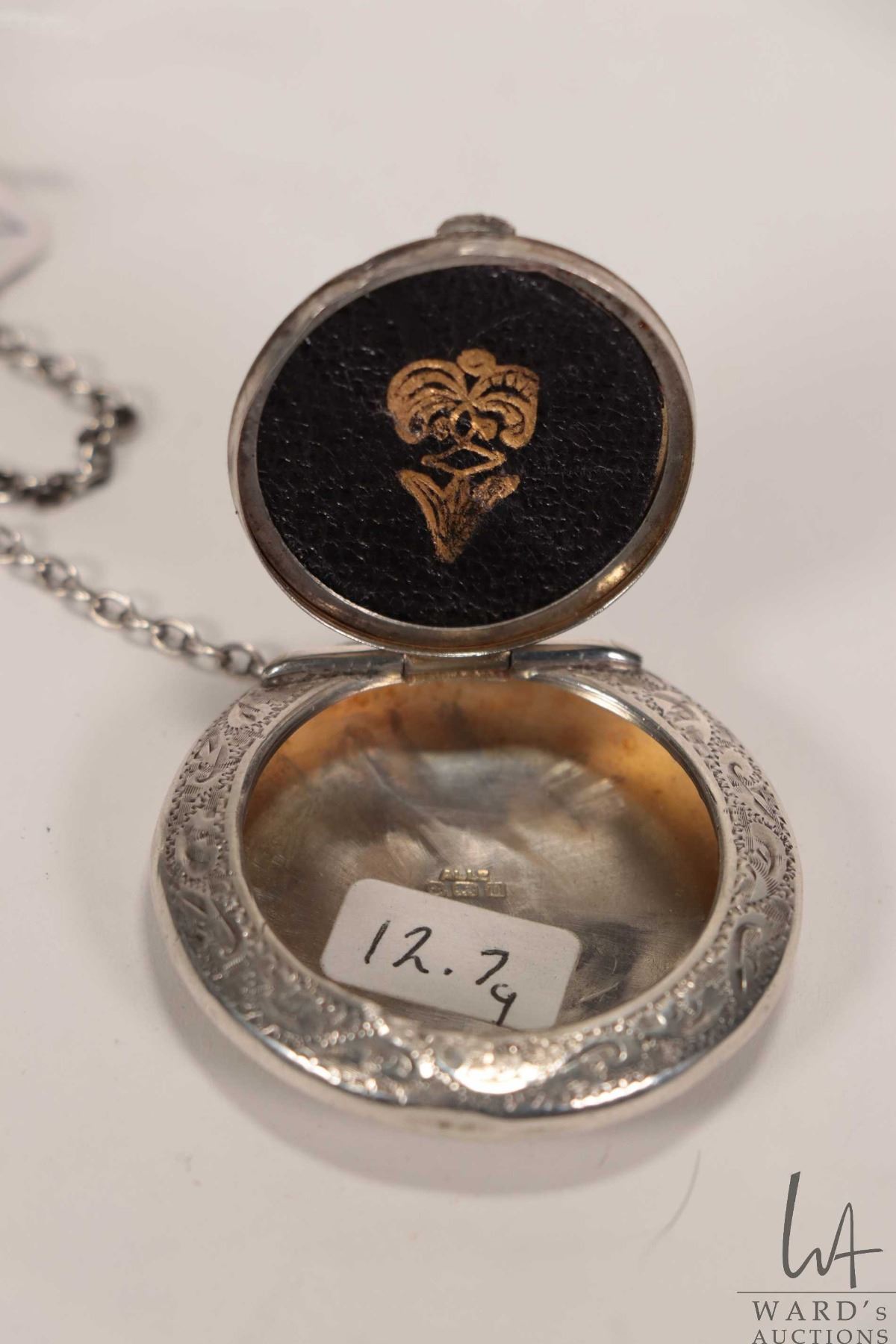 A small sterling silver Birmingham 1920 snuff case with chain and pin