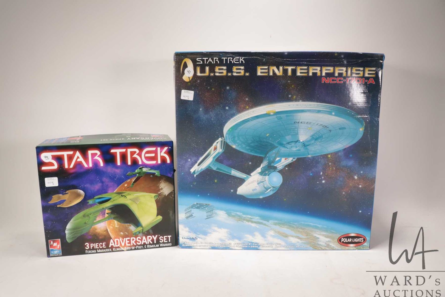 AMT Star Trek three piece Adversary set: Ferengi Marauder, Klingon Bird of Prey and Romulan War Bird model kit and 1:350 scale Polar Lights Star Trek USS Engerprice-NCC-1701A model kit