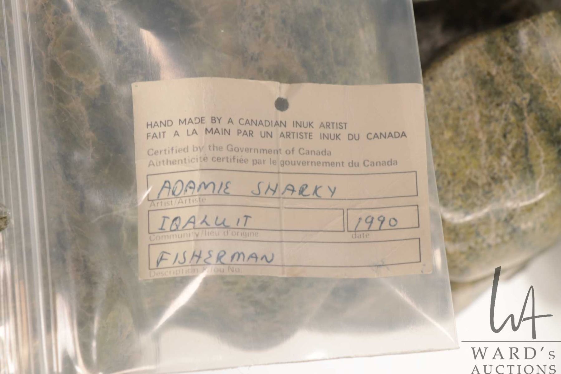 Adamie Sharky, Inuit carved soapstone "Fisherman" with original Eskimo Art hang tag, Iqaluit, 1990,