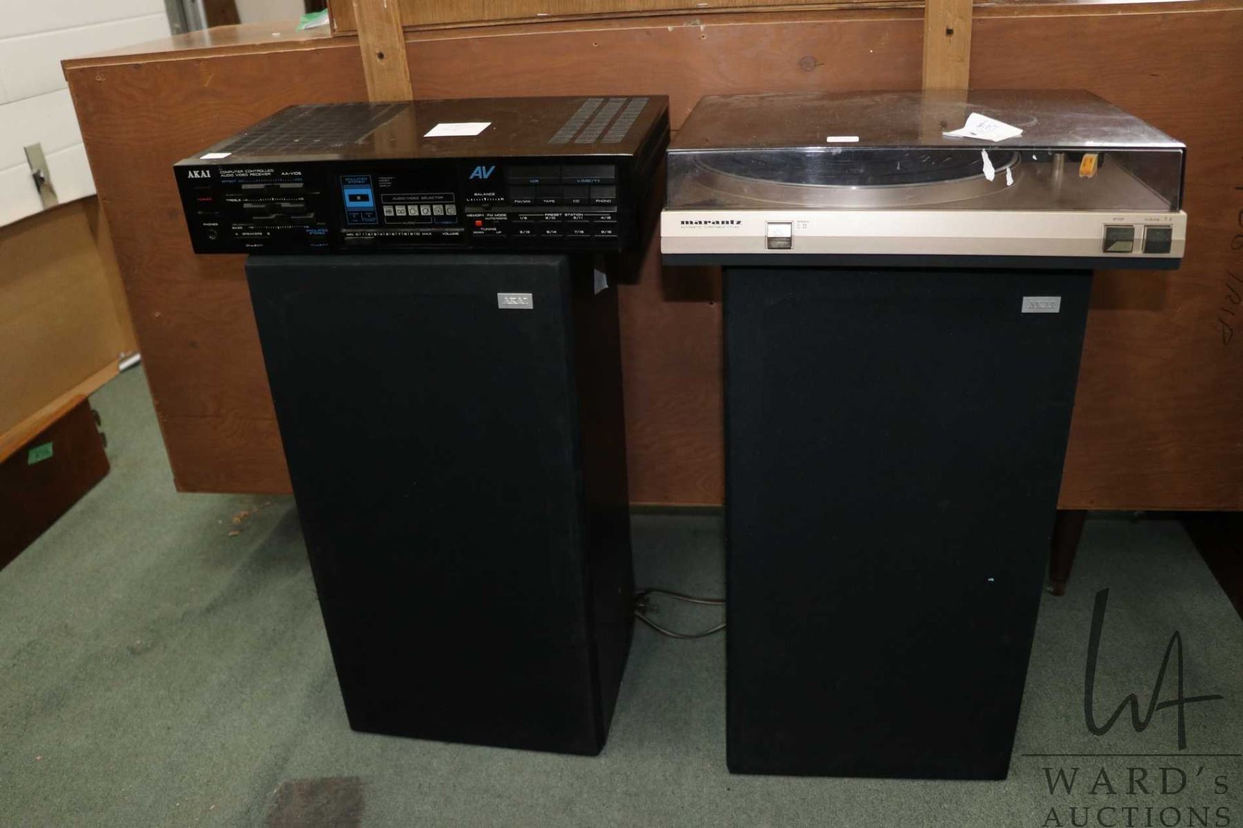 Akai computer control audio/ video receiver, model no. AA-V105, a Marantz automatic turn table model TT140, note: only works manually, plus two Akai SR-H50 two way speaker system