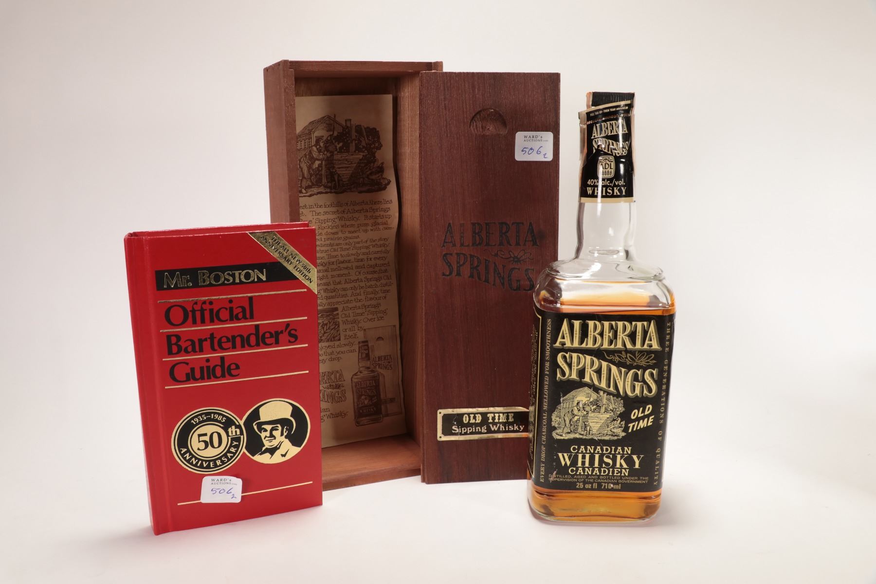 Alberta Springs / Old Time / Sipping Whisky / 710ml / 40% ABV retains original Excise label dated 1968, also includes a Mr. Boston Official Bartender's Guide 50th Anniversary, dated 1984 Note: Alcohol cannot be insured by any courier in Canada. Local pick up is recommended. Canadian bidders only
