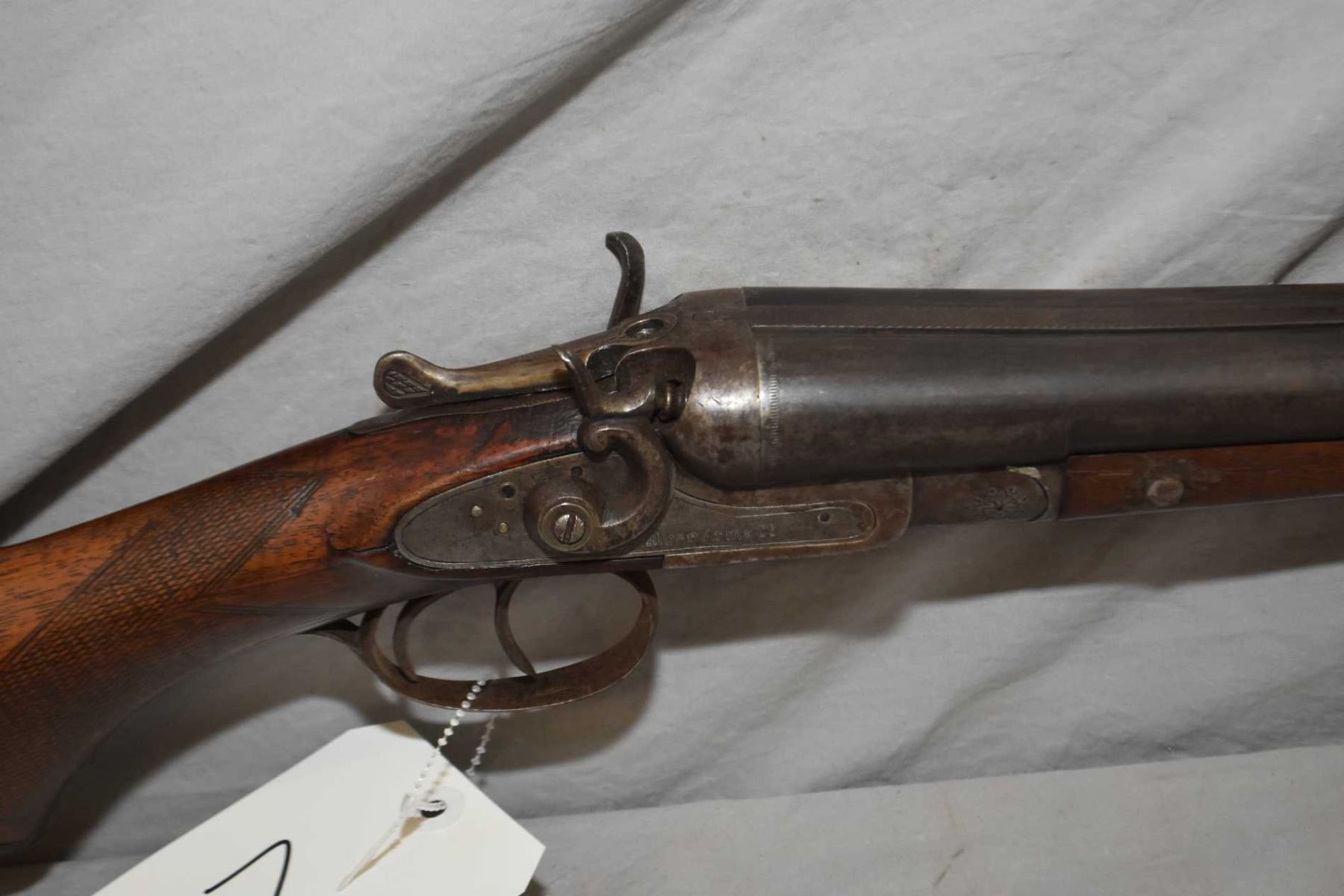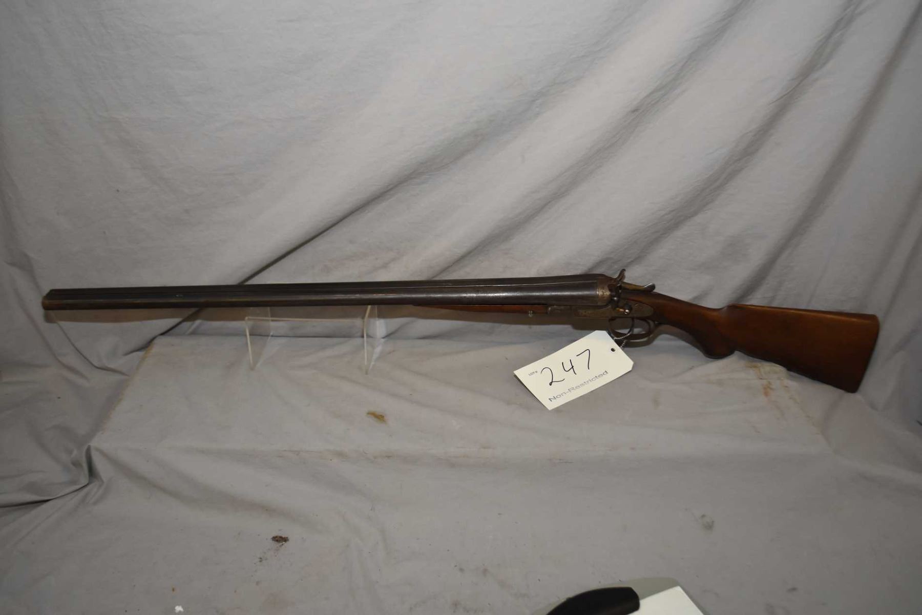 Alger Arms Co. double barrel side X side, hinge break shotgun w/ 30" bbl. [blued finish turning grey, external hammers, left side hammer has been grazed, screw replaced in forend, nick and bruises on wood and metal] Ser # 640