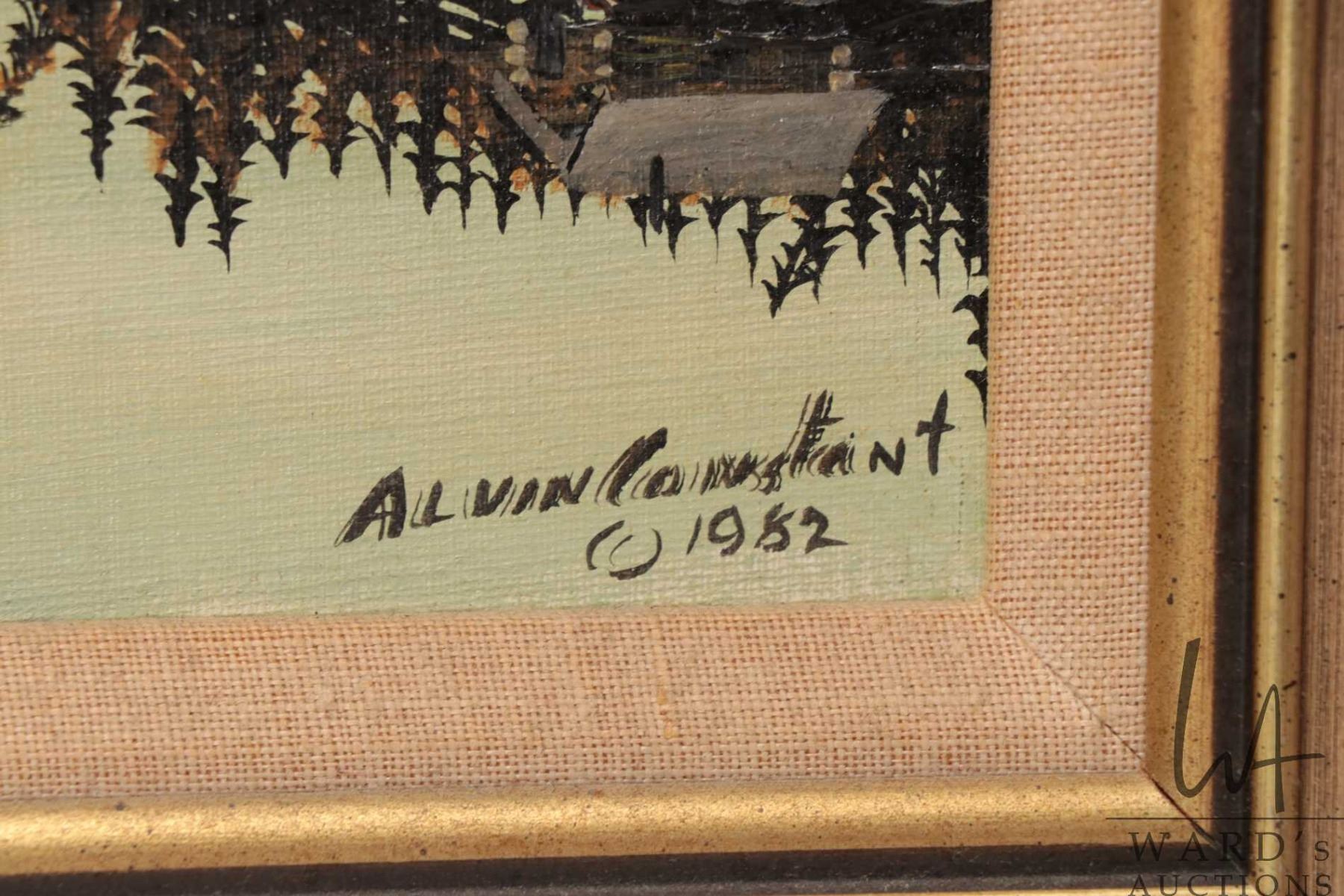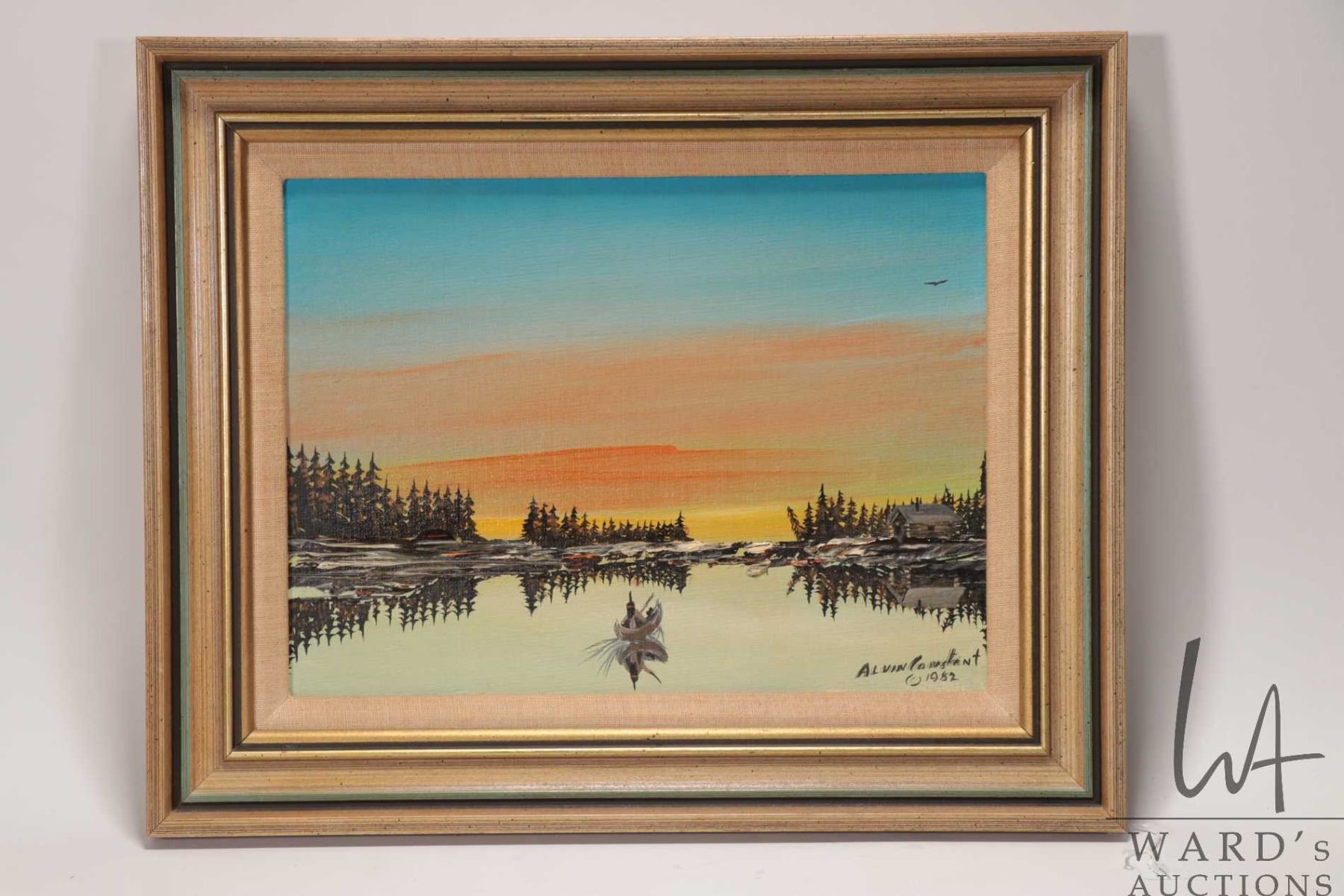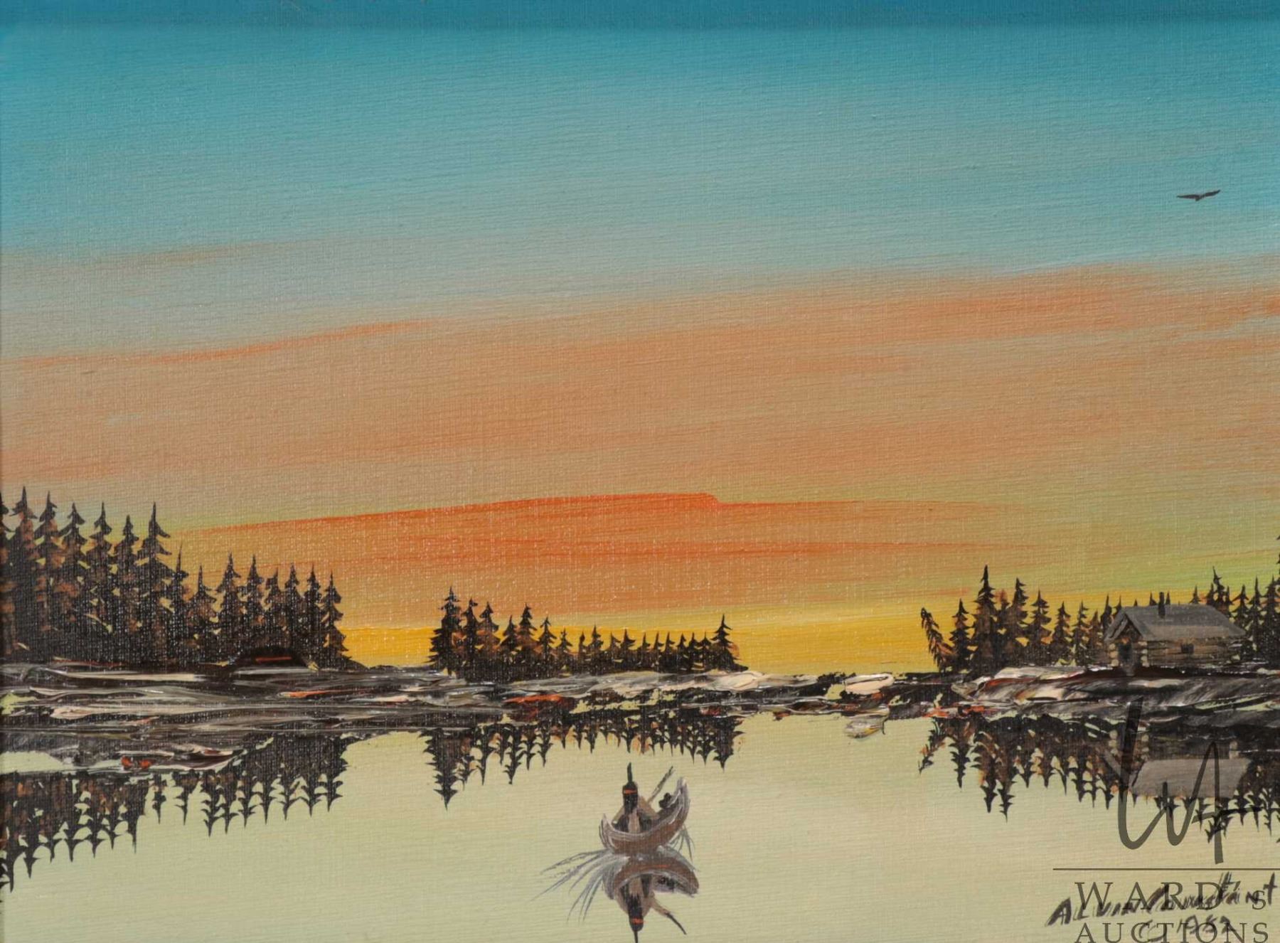 Alvin (Wandering Spirit) Elif Constant, acrylic on canvas painting of a figure canoeing at sunset, dated 1982, 8 1/2" X 11 1/2"