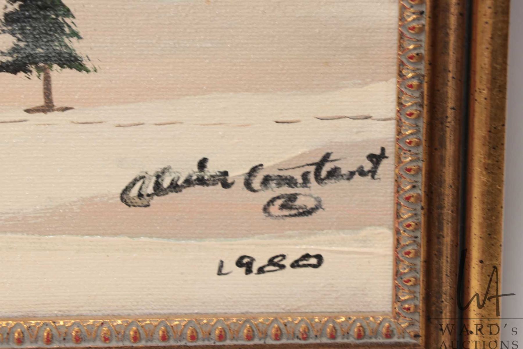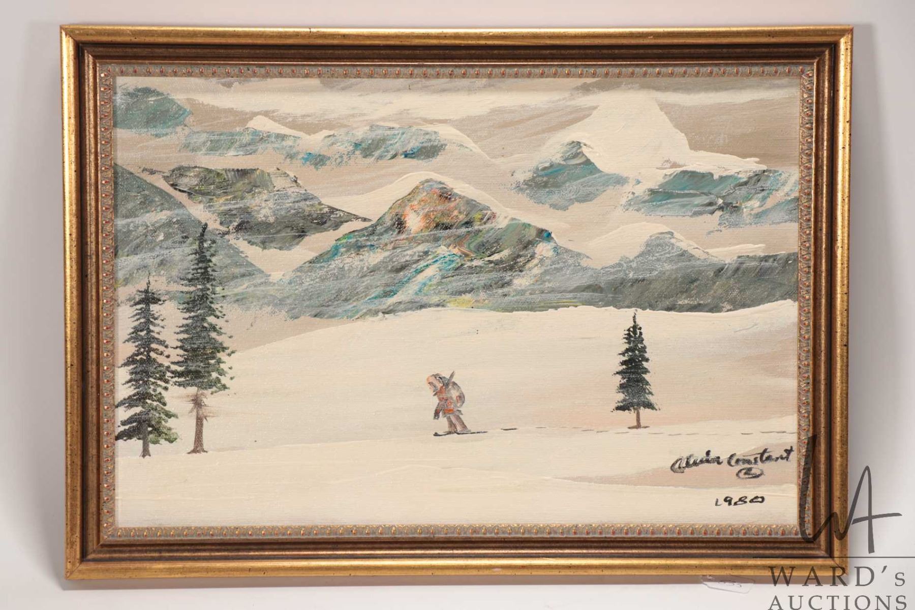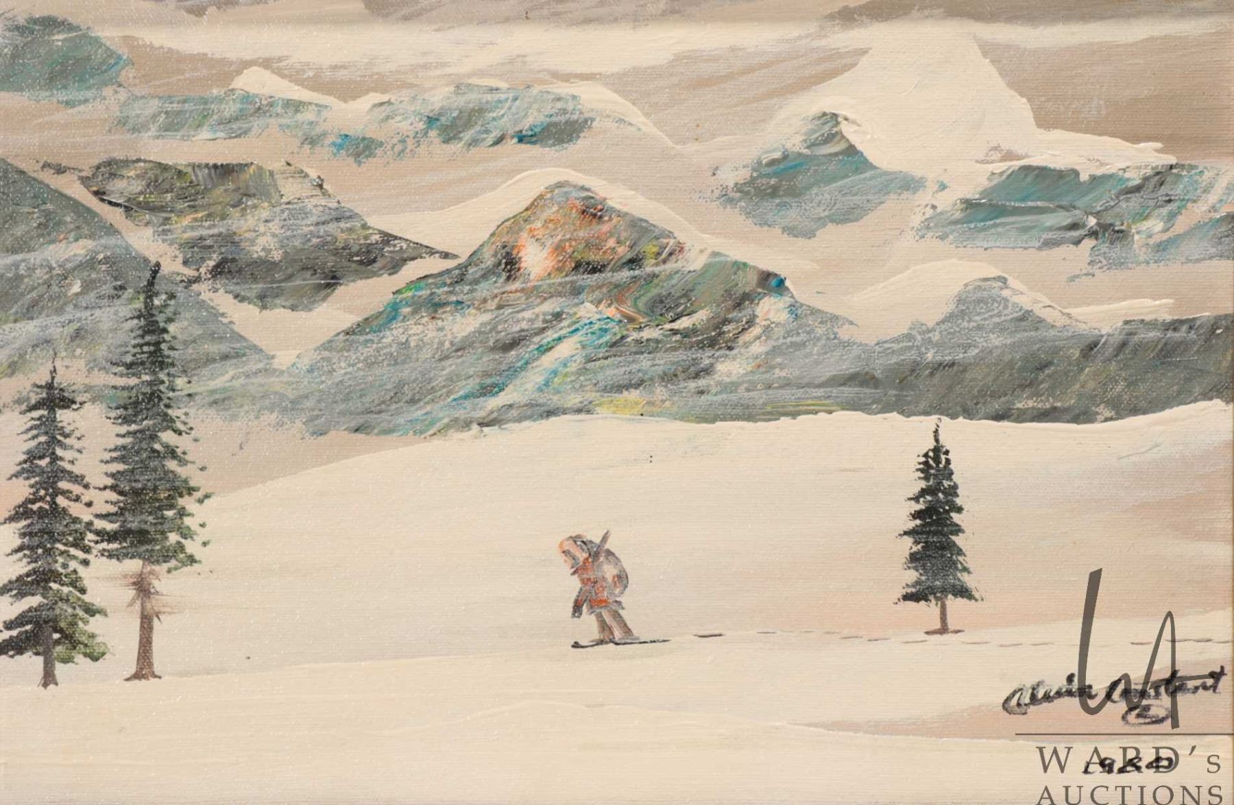 Alvin (Wandering Spirit) Elif Constant, acrylic on canvas painting of a snowshoeing hunter moving through the mountains, datred 1980, 9 1/2" X 14 1/2"