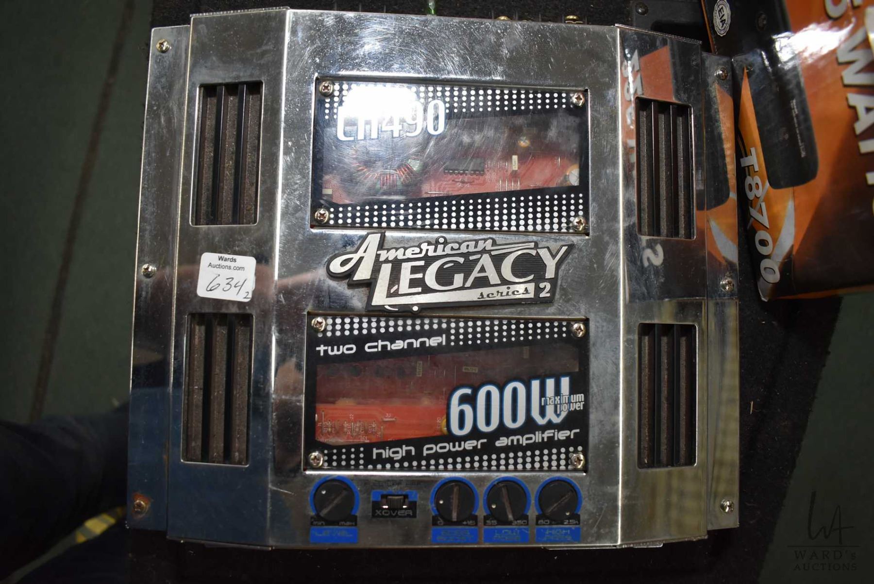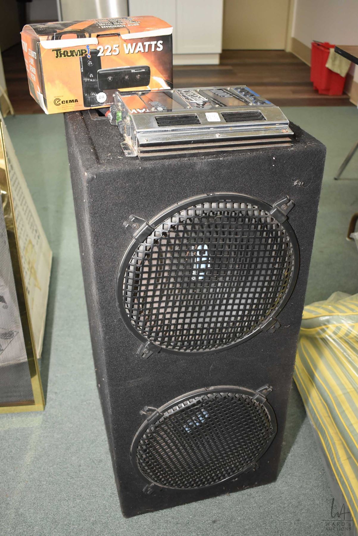 American Legacy Scrics 2, two channel 600 watt high power amplifier mounted on a Crossfire double sub, not tested at time of cataloguing plus a pair of Thump 225 watt speakers, appears new in box