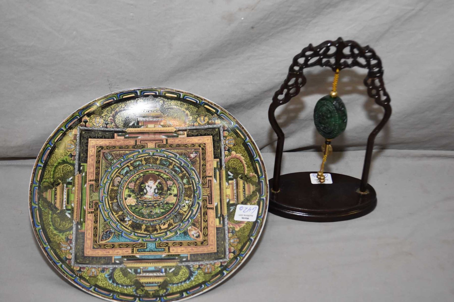 An Imperial reticulated green jade pendant and a Sino-Tibetan prayer plate