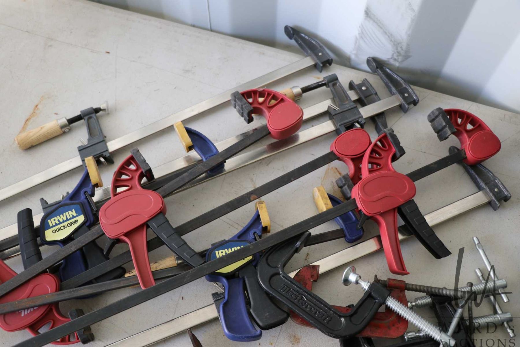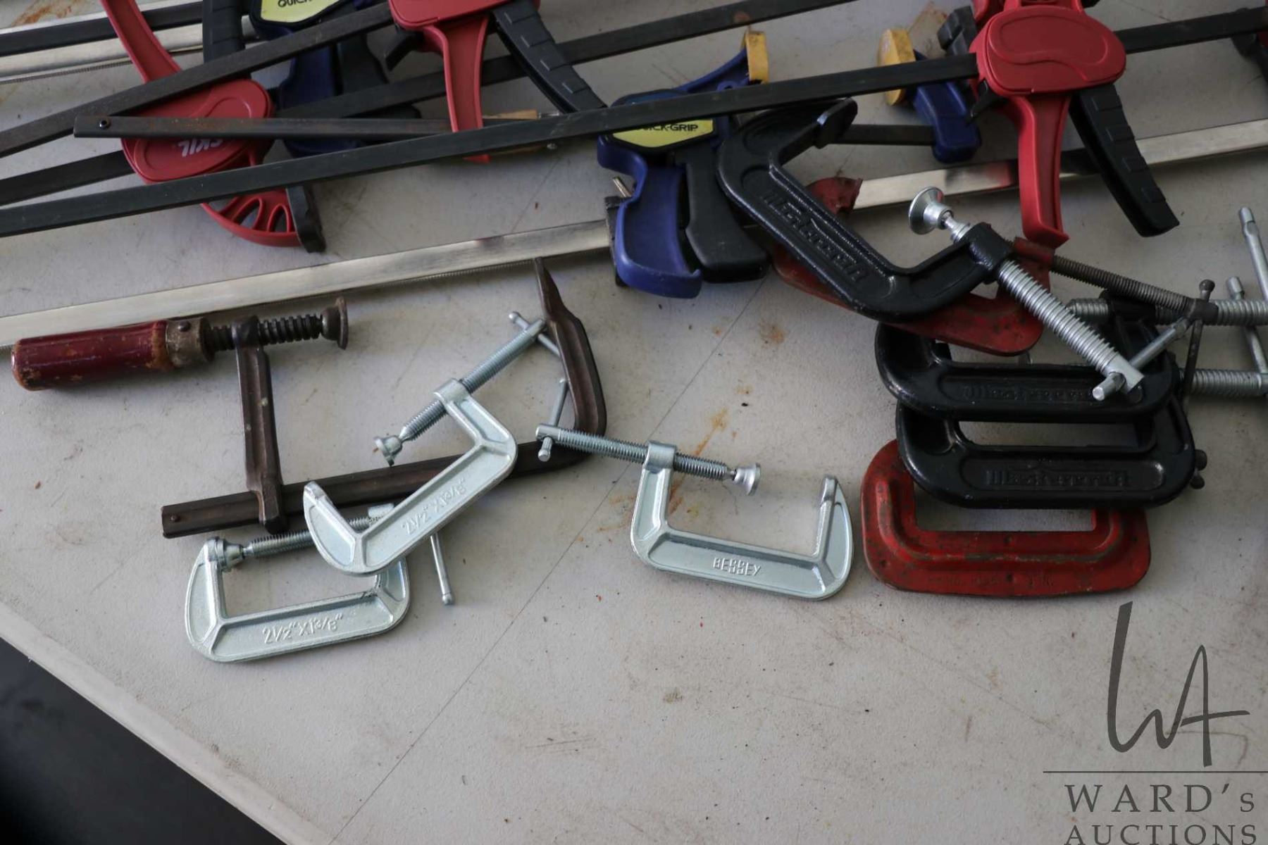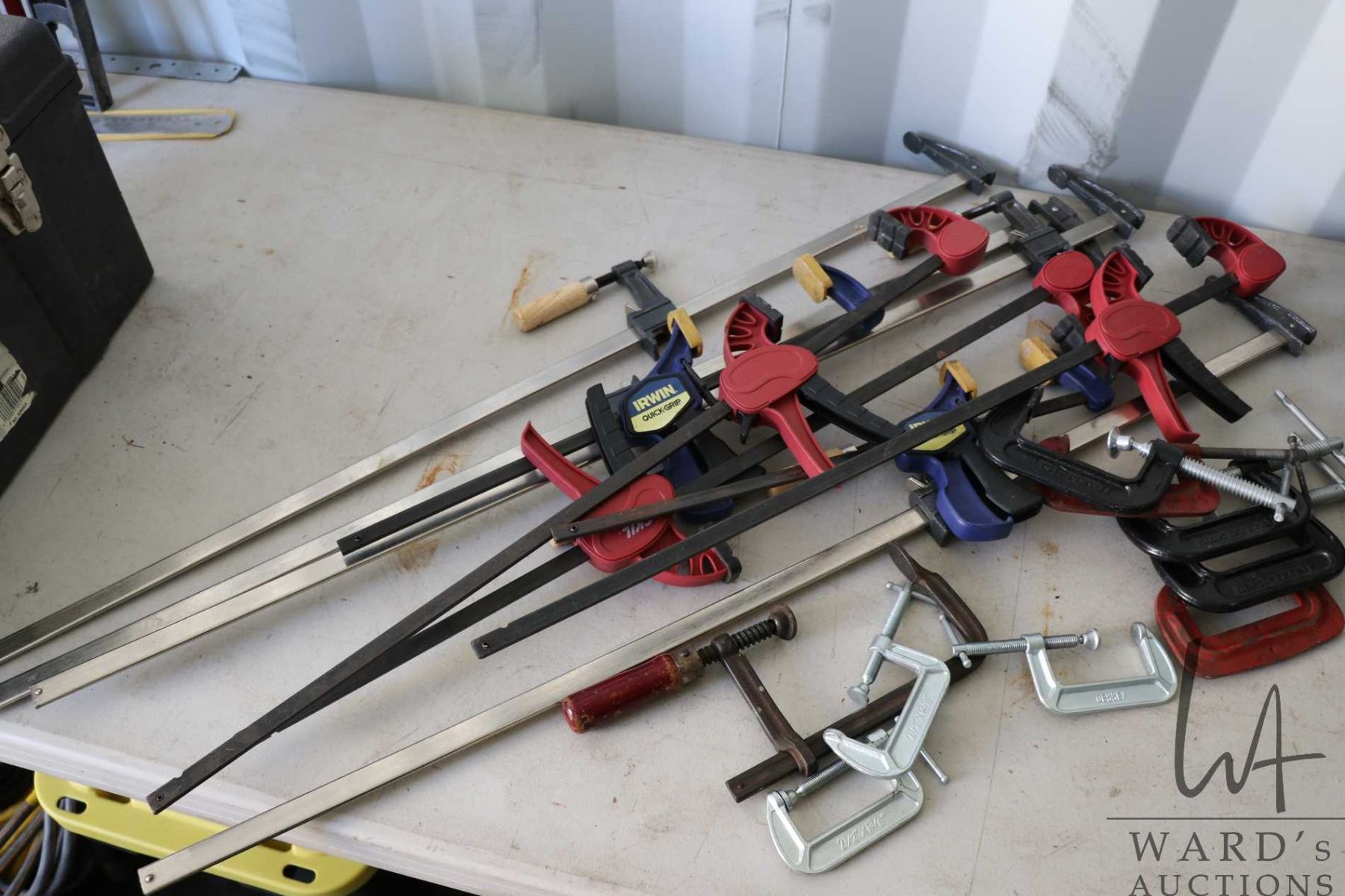 An assortment clamps including C-clamps, Irwin Quik Grip, Skill squeeze clamps etc.