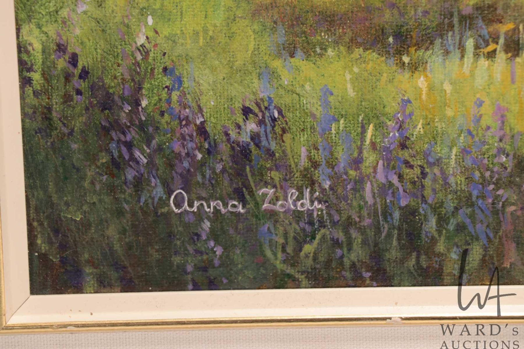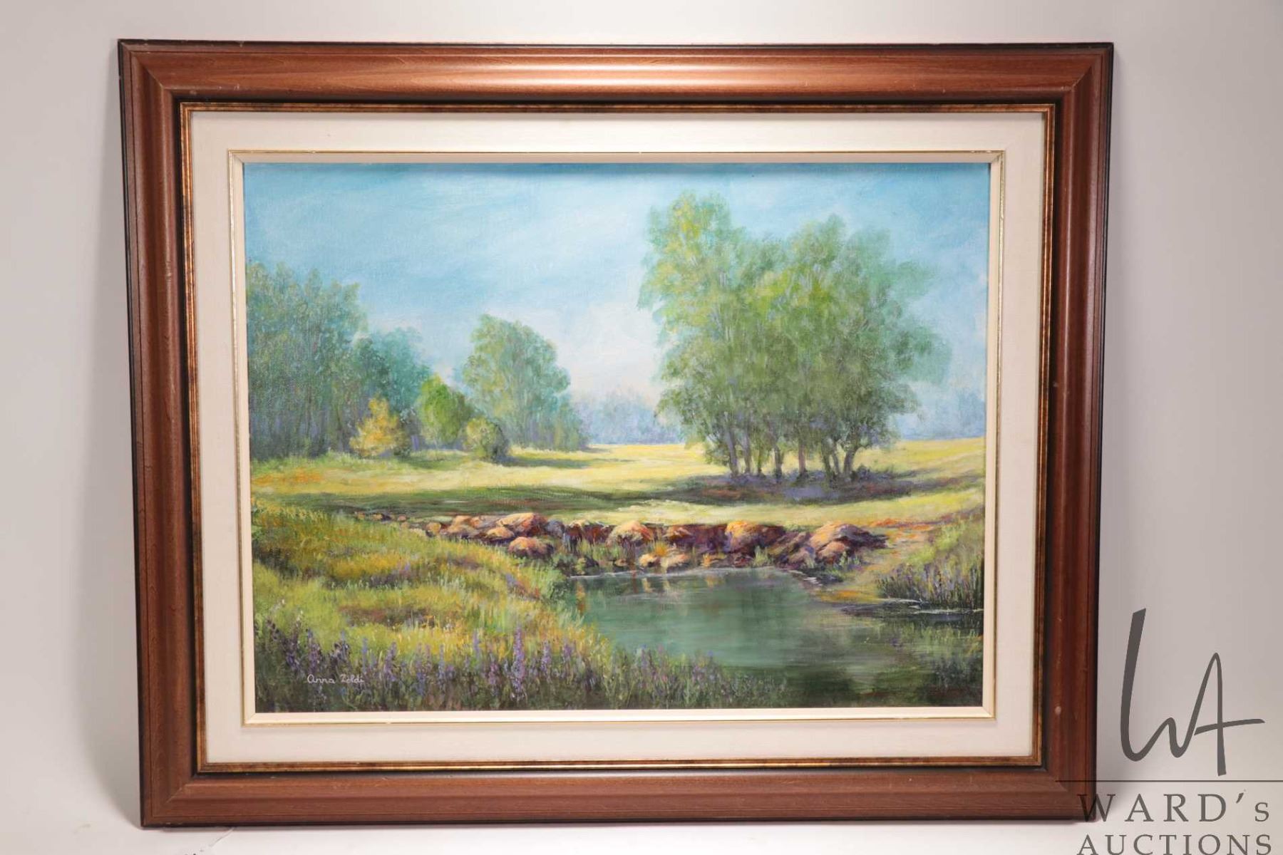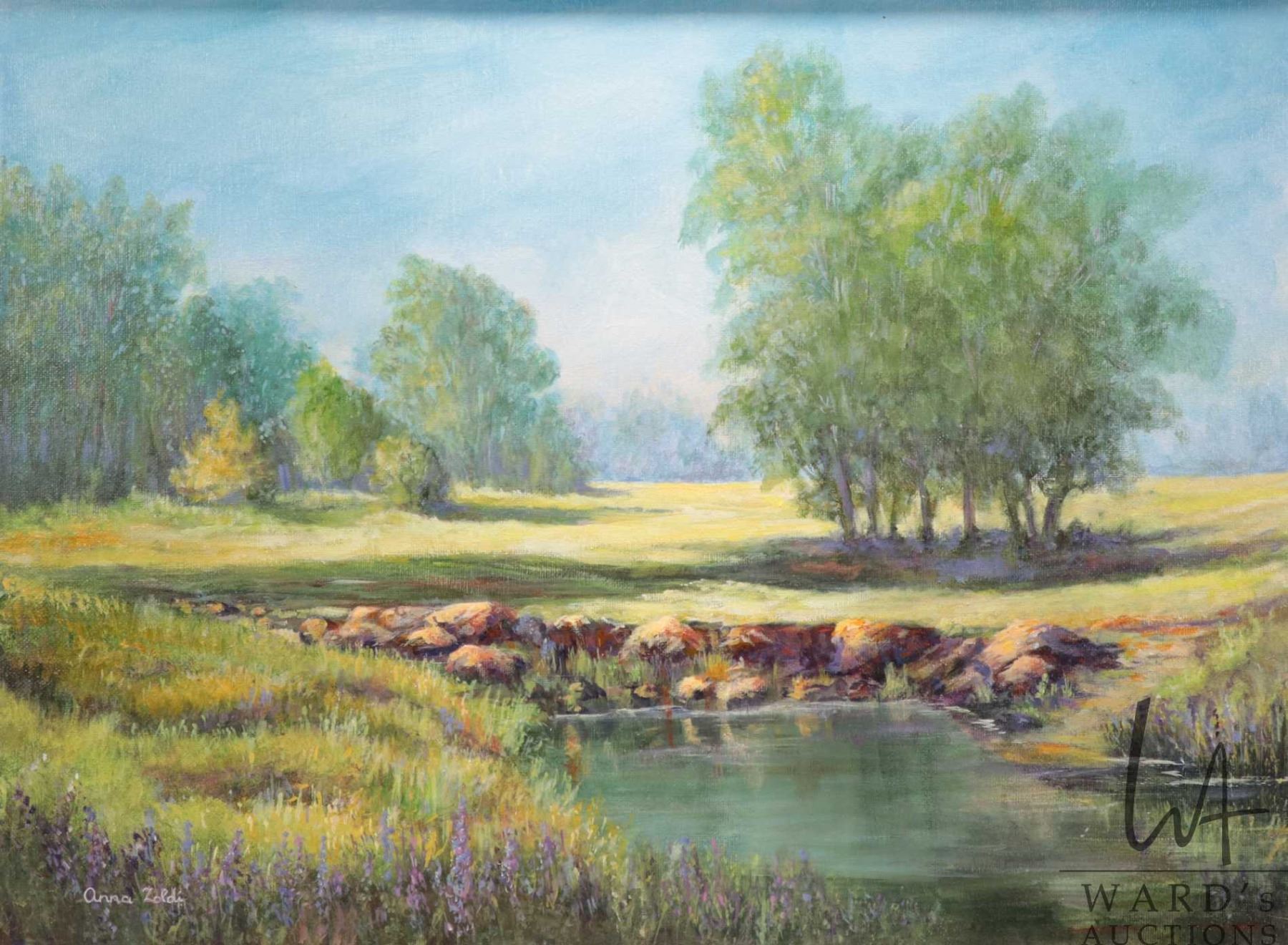 Anna Zoldi, framed acrylic on canvas painting of a spring creek and meadow scene 17-1/2" x 23-1/2"