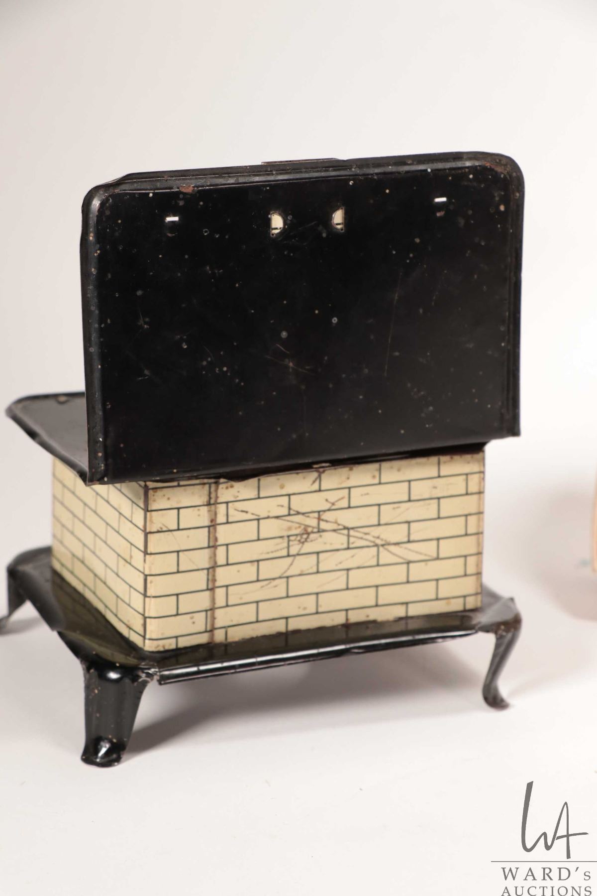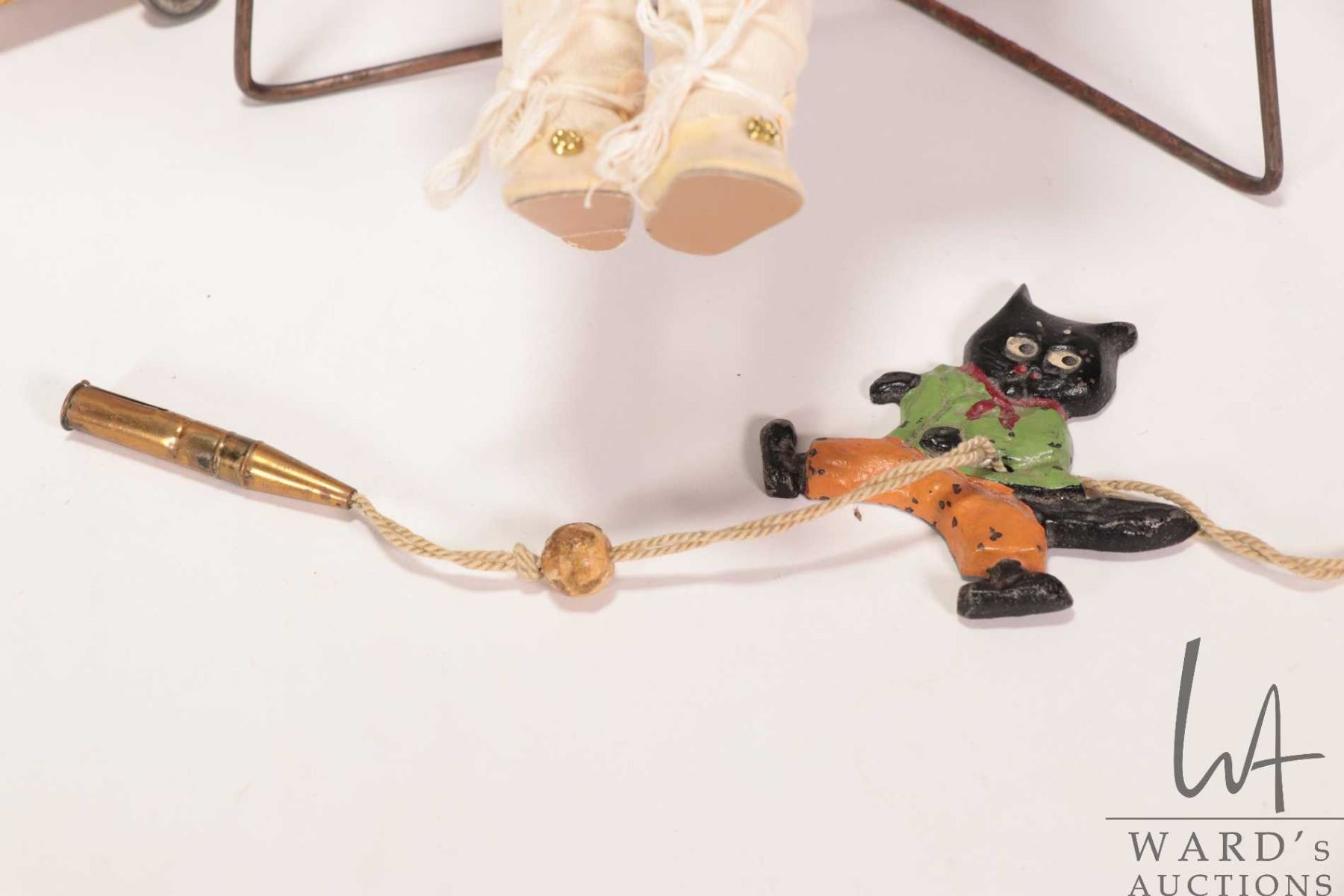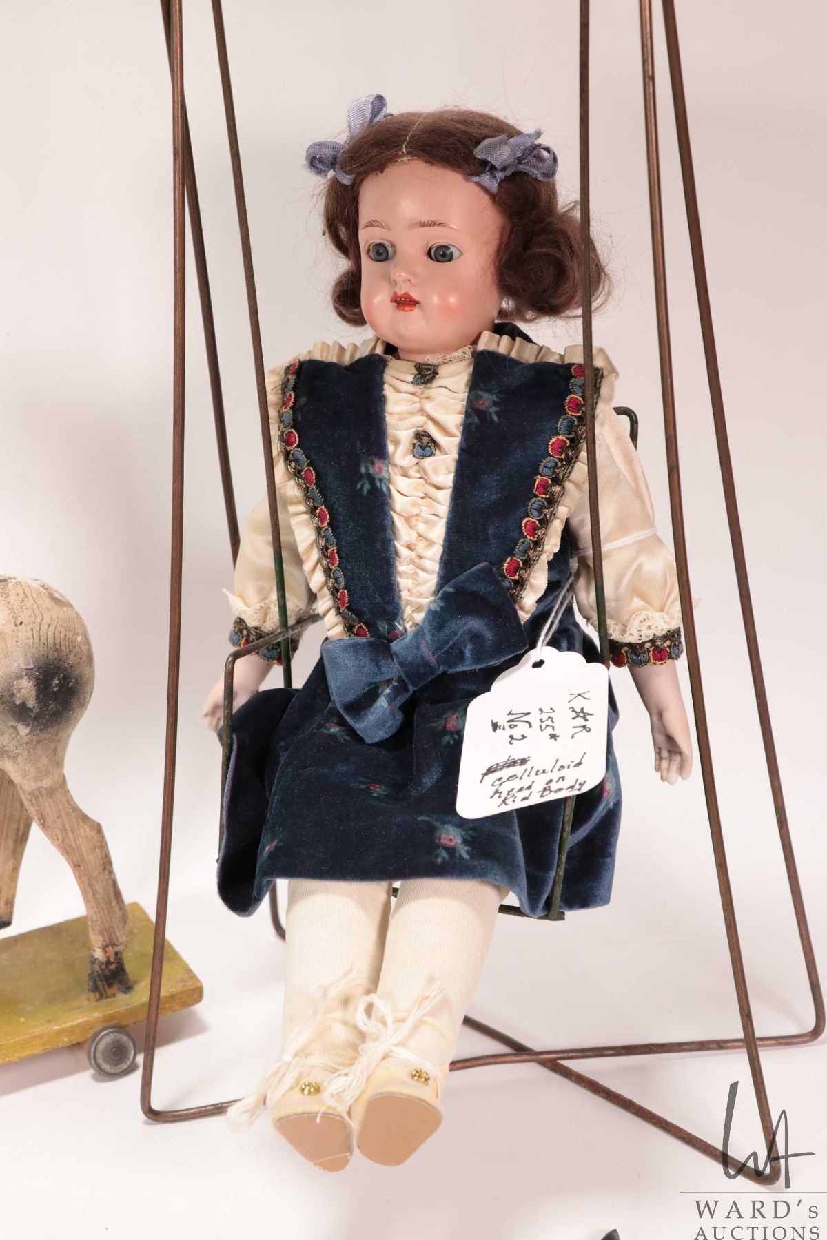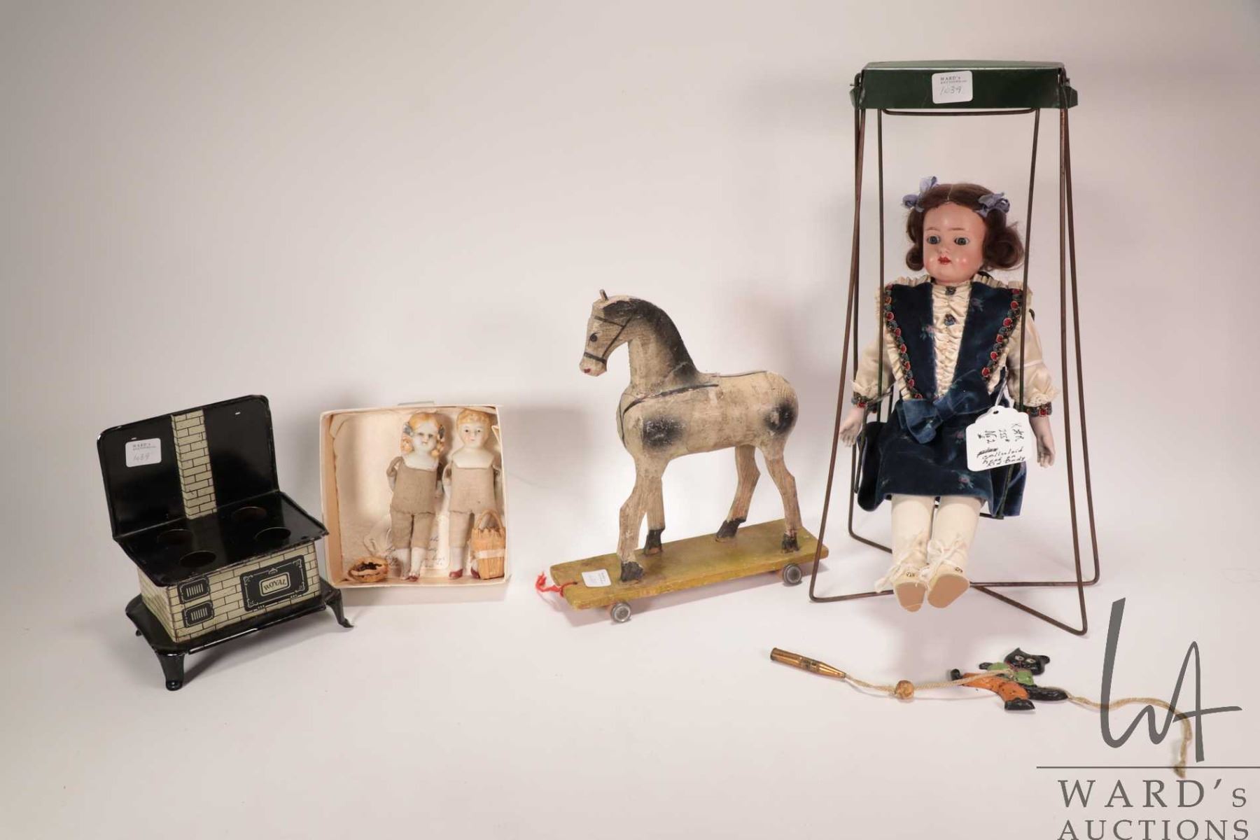 Antique 12" Kammer & Reinhardt 255 with celluloid head on kid lather body and blue sleep eyes. Antique doll's swing, wooden horse pull toy, a set of two painted bisque 5" dolls, a Royal tin plate doll's stove and a cast iron black Halloween cat
