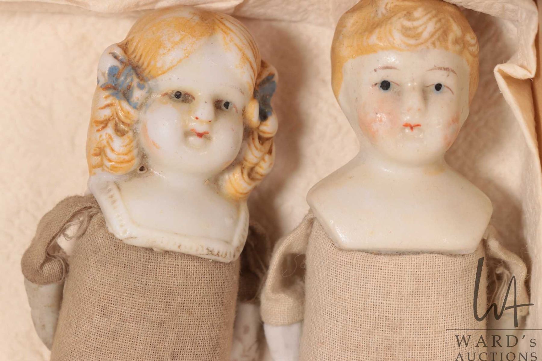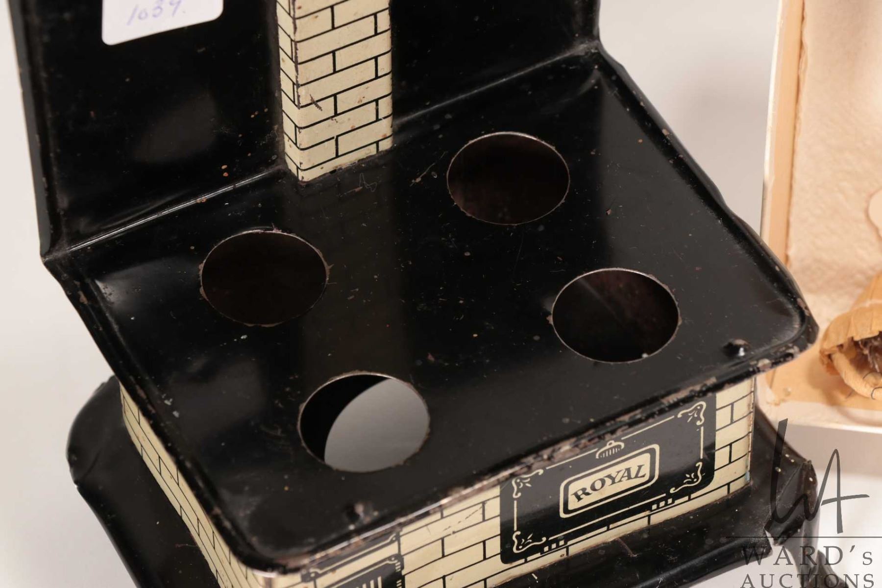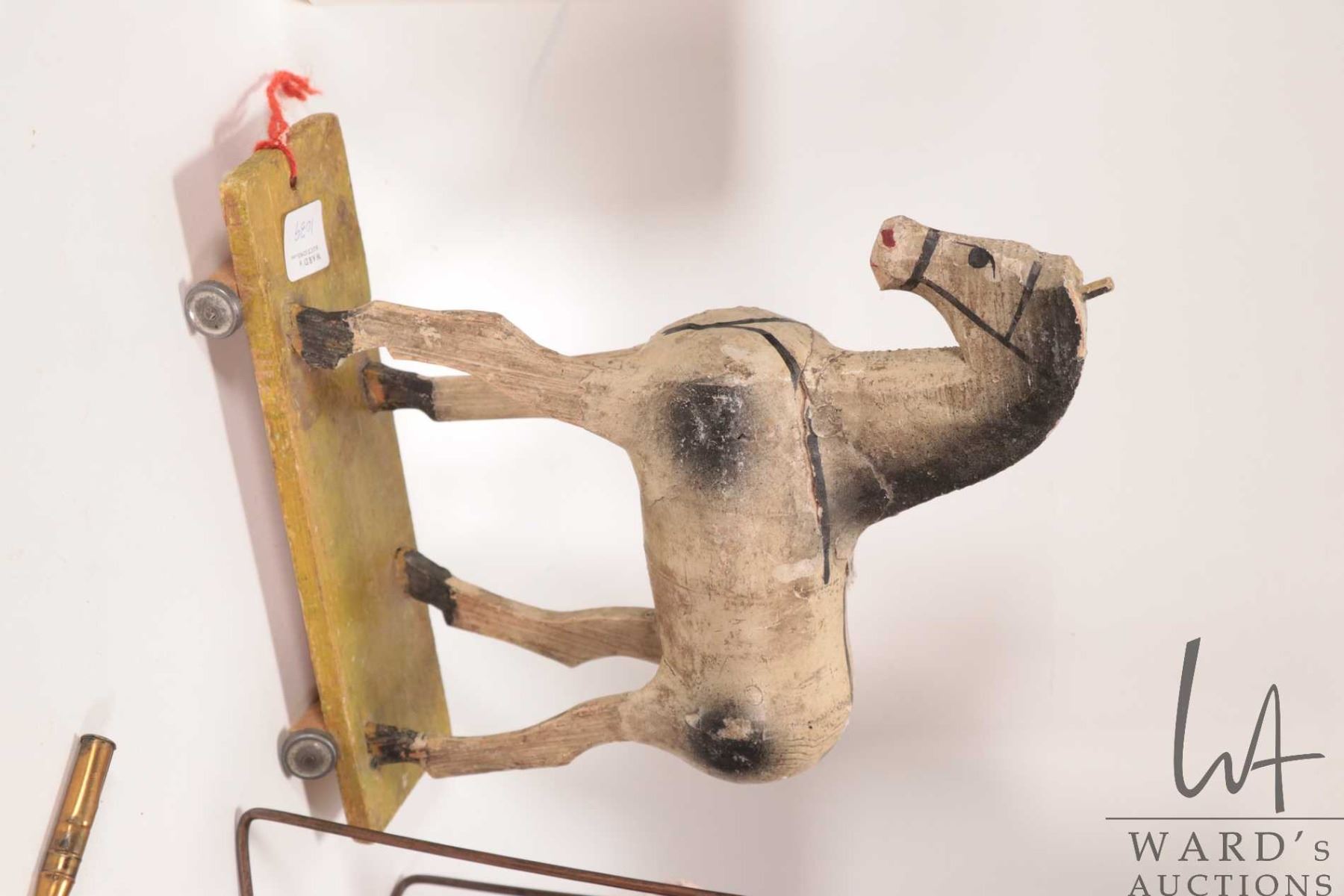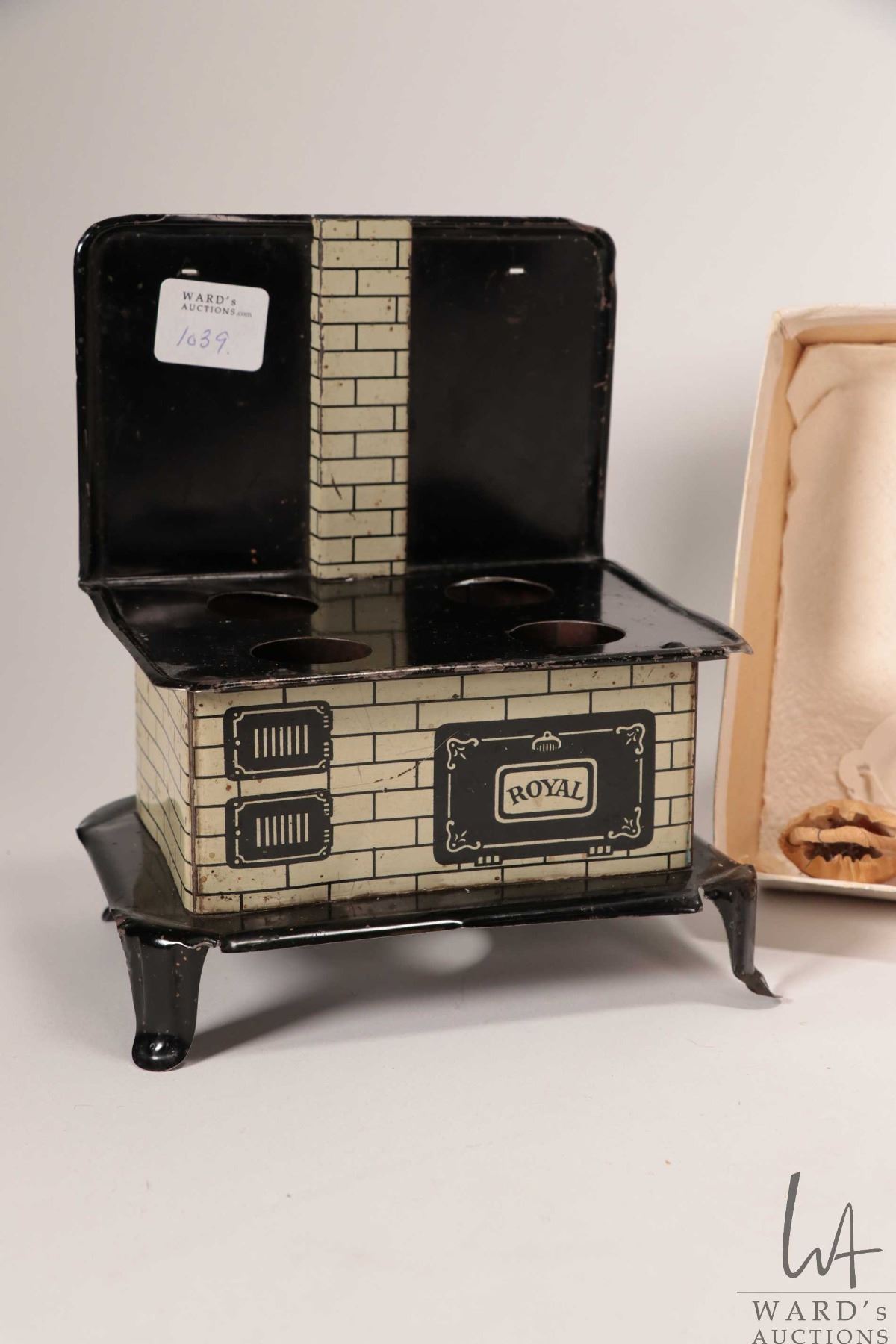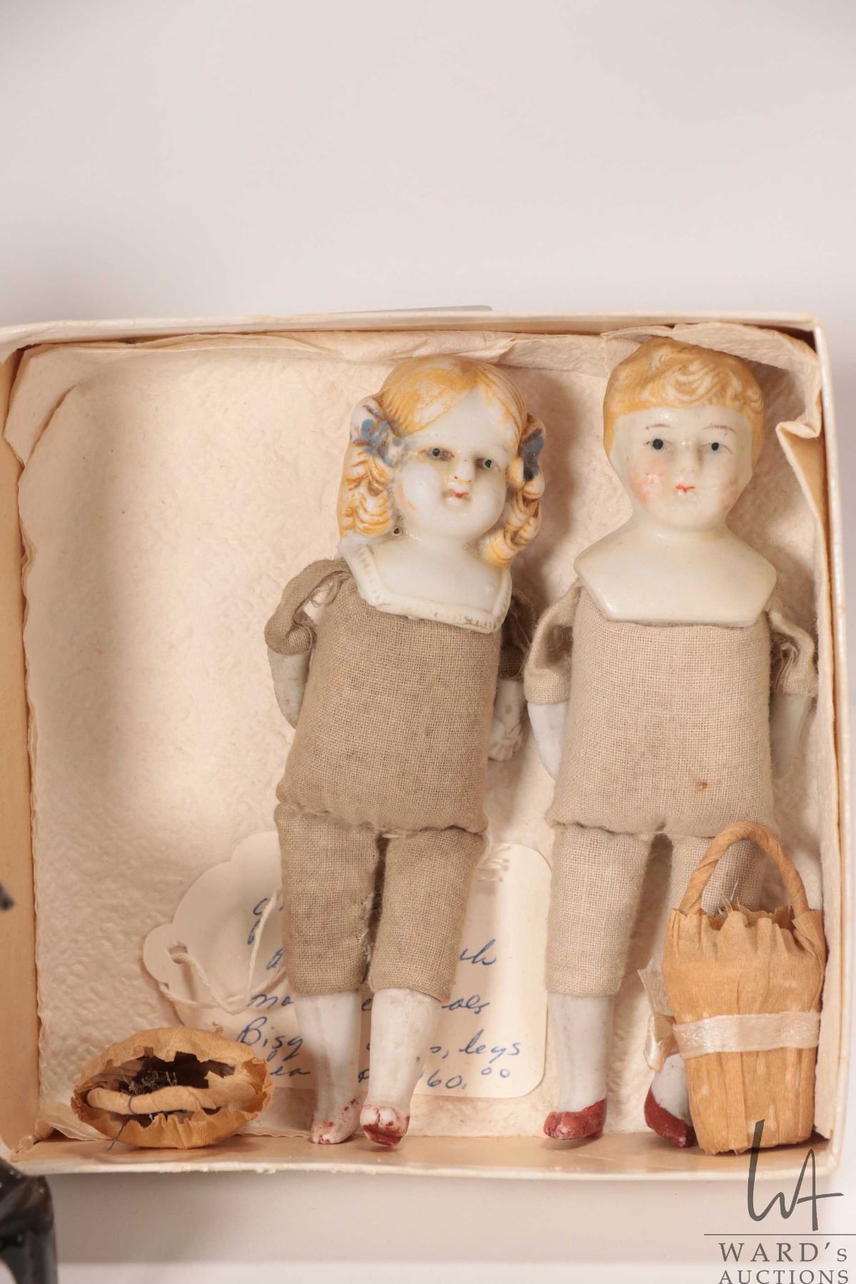 Antique 12" Kammer & Reinhardt 255 with celluloid head on kid lather body and blue sleep eyes. Antique doll's swing, wooden horse pull toy, a set of two painted bisque 5" dolls, a Royal tin plate doll's stove and a cast iron black Halloween cat