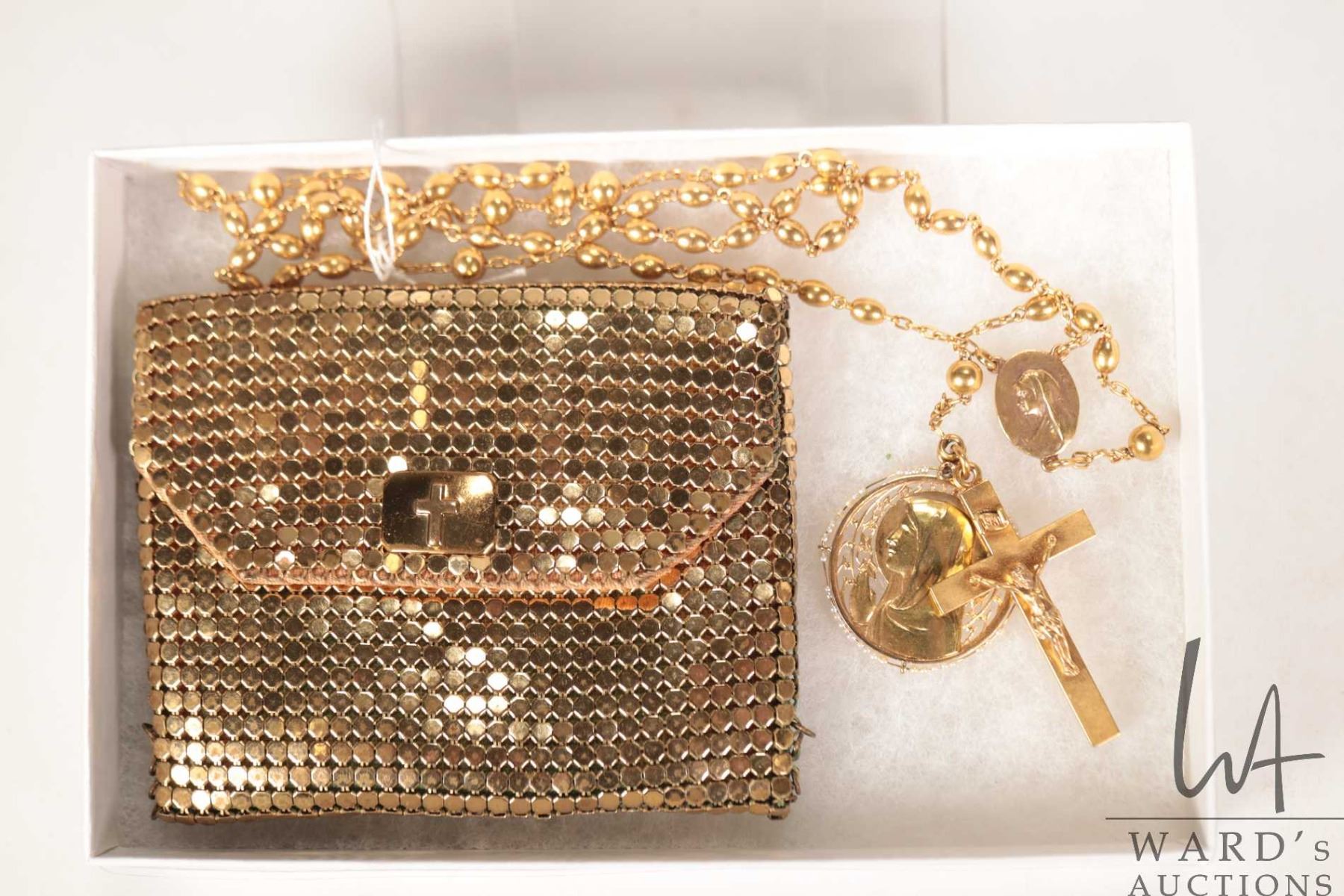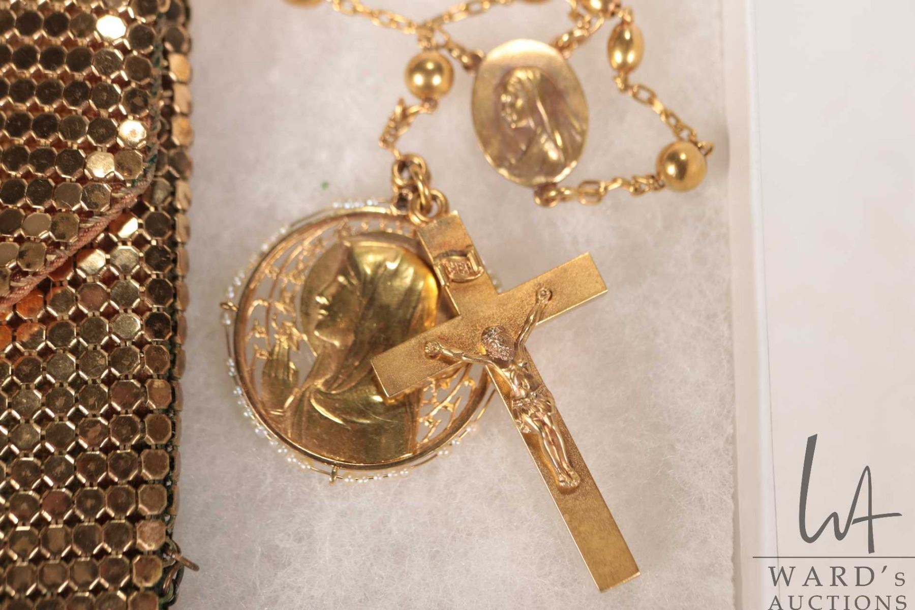 Antique 14kt yellow gold rosary with crucifix and Virgin Mary medallion surrounded by tiny seed pearls. 22.3 grams. Includes metallic purse.
