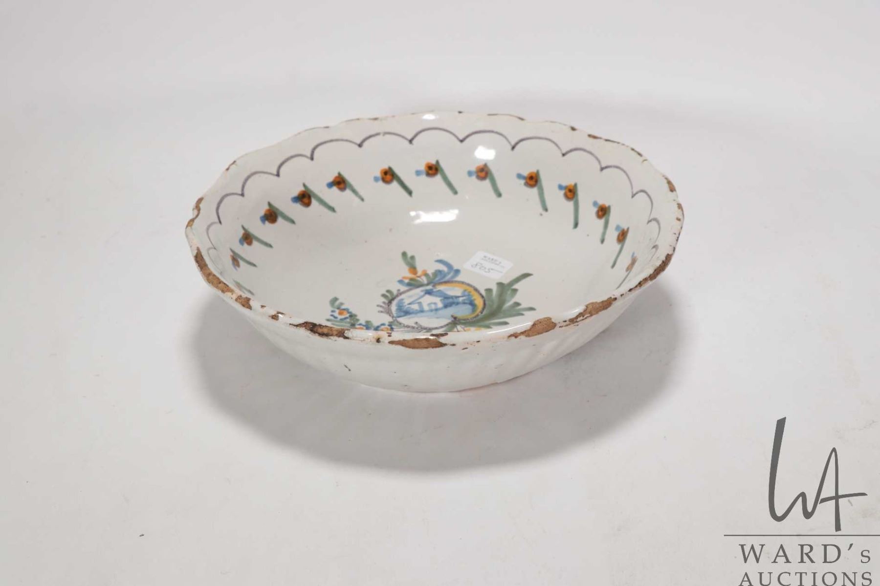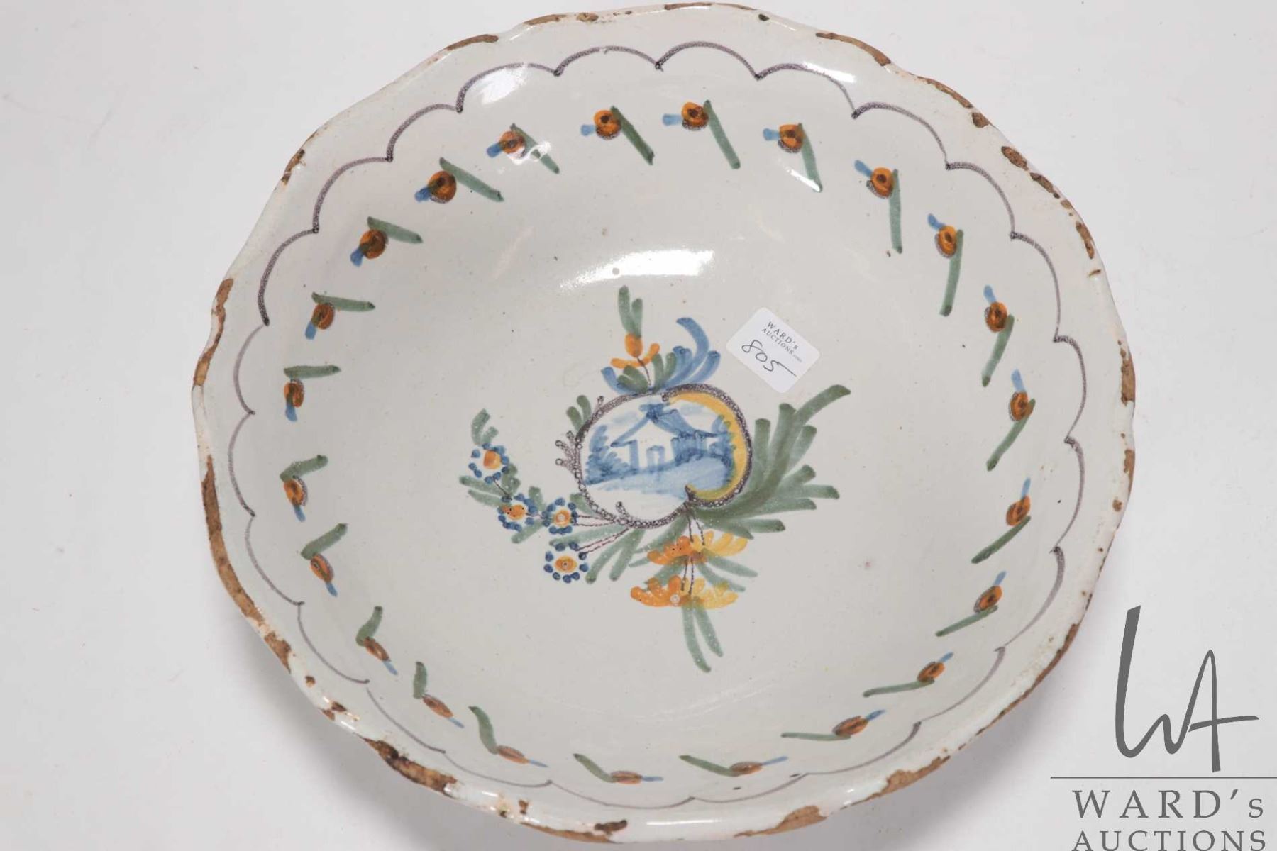 Antique 17th - 18 century hand painted possibly French faience, tin glazed bowl, 10" in diameter
