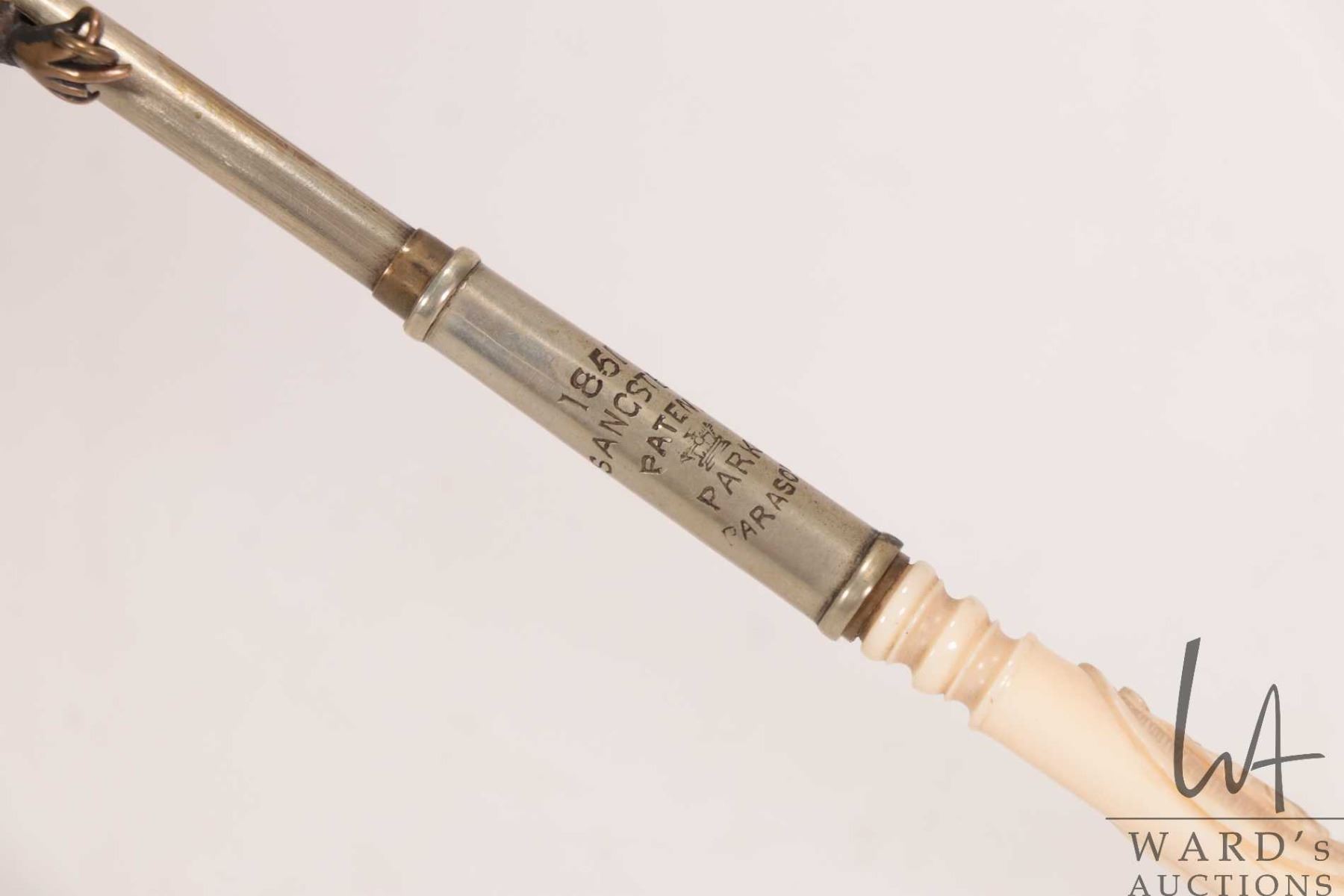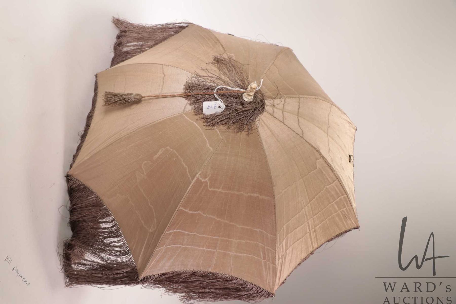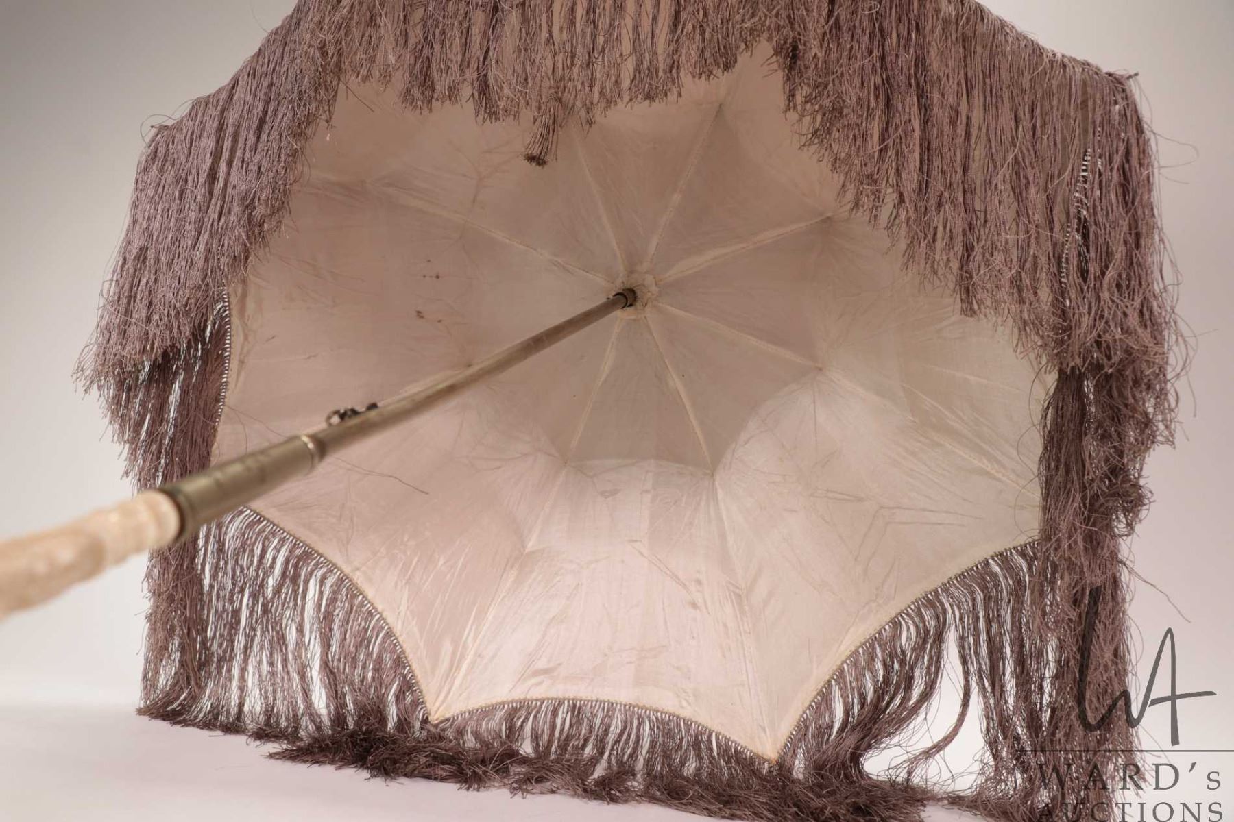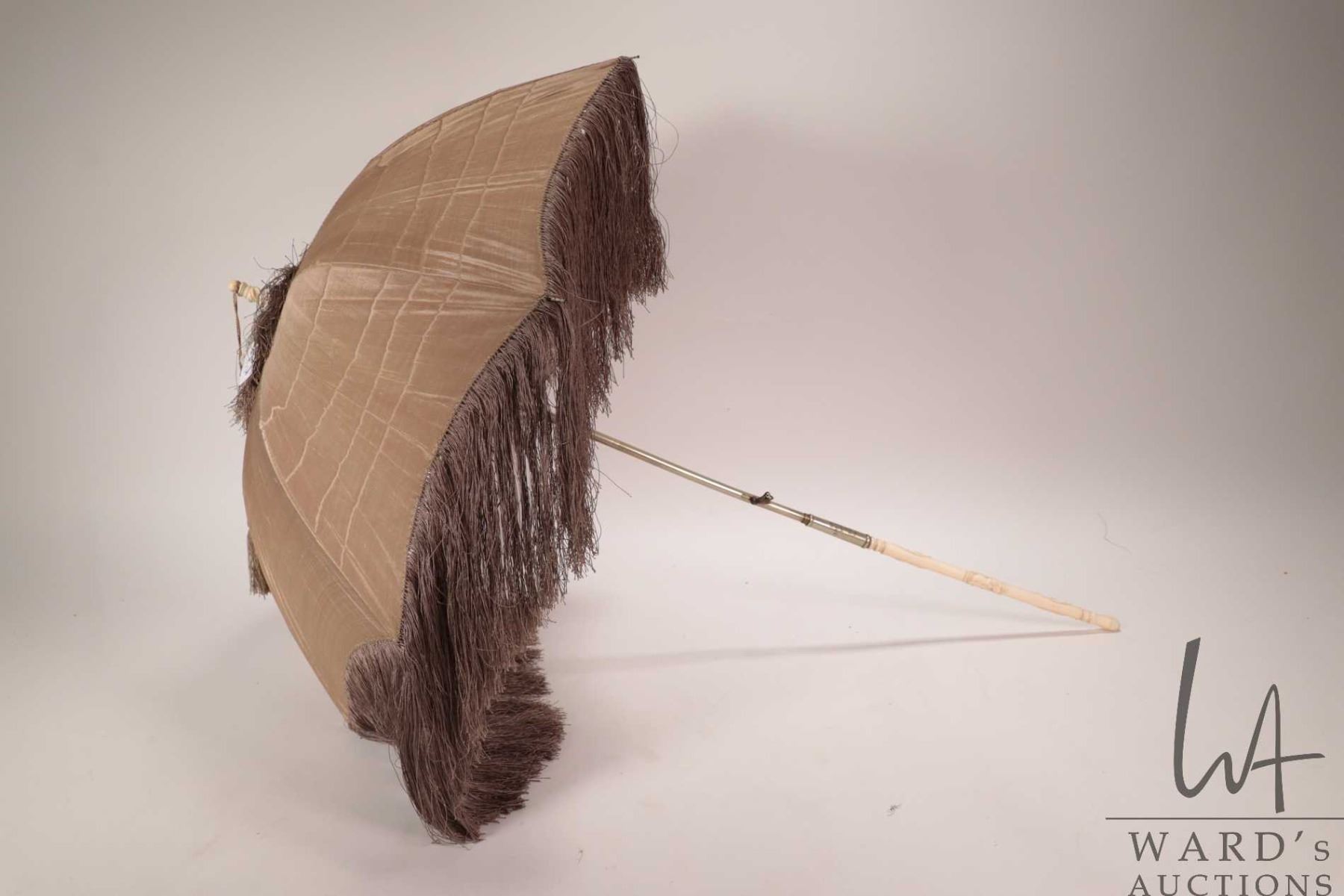 Antique 1851 Sancsters Park Parasol with silk and deep fringed cover and hand carved collapsible handle, 26" in length