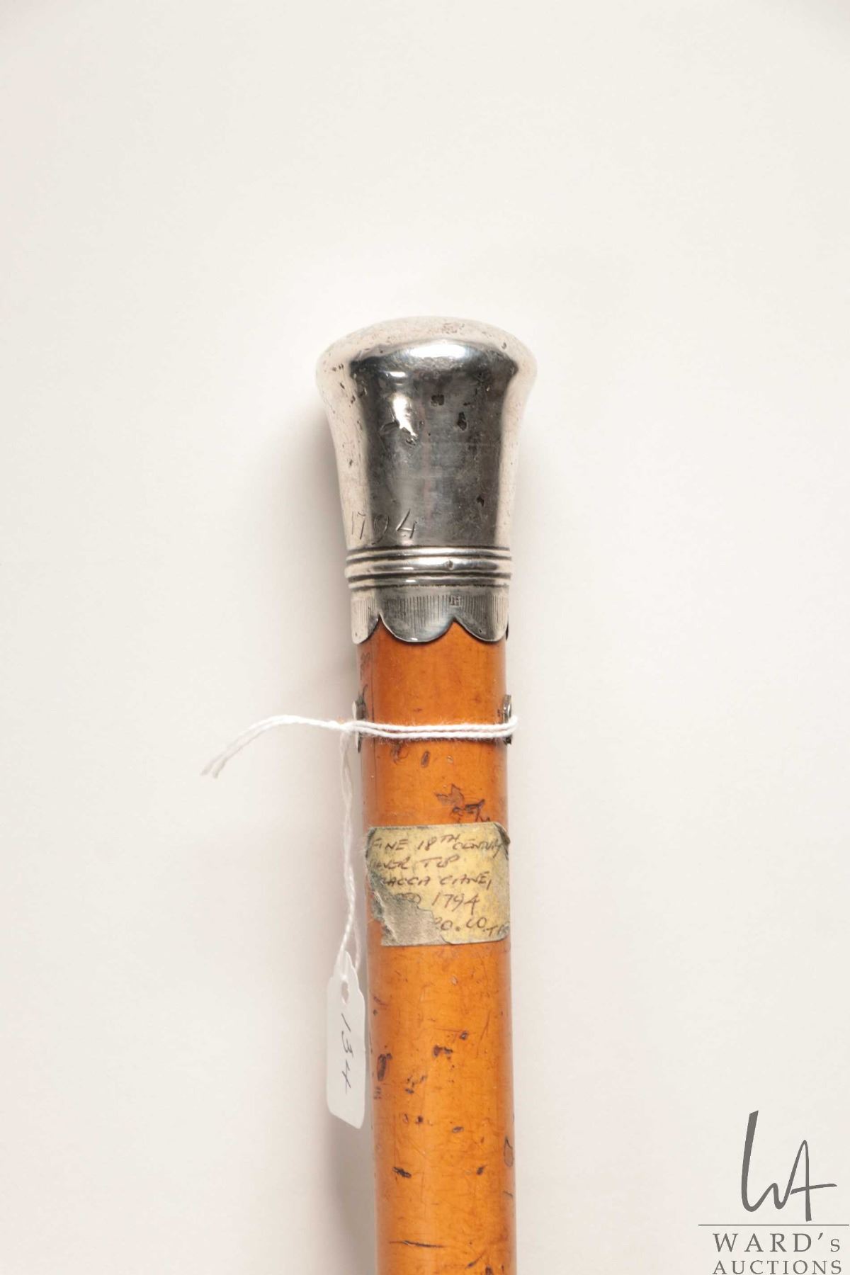 Antique 18th century Maca wood walking stick with silver top engraved "AM.MM 1794", bronze metal wrapped tip, 35 1/2" in height