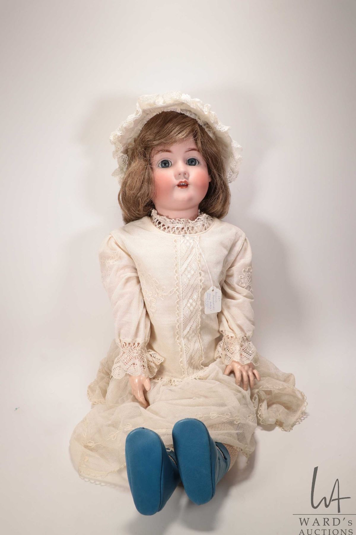 Antique 33" Heinrich Handwerck/ Simon Halbig bisque head doll. Sleep eyes, open mouth, human hair wig on a jointed composition body. No cracks seen to bisque. Note: Viewing in person recommended. Buyer must satisfy themselves as to condition