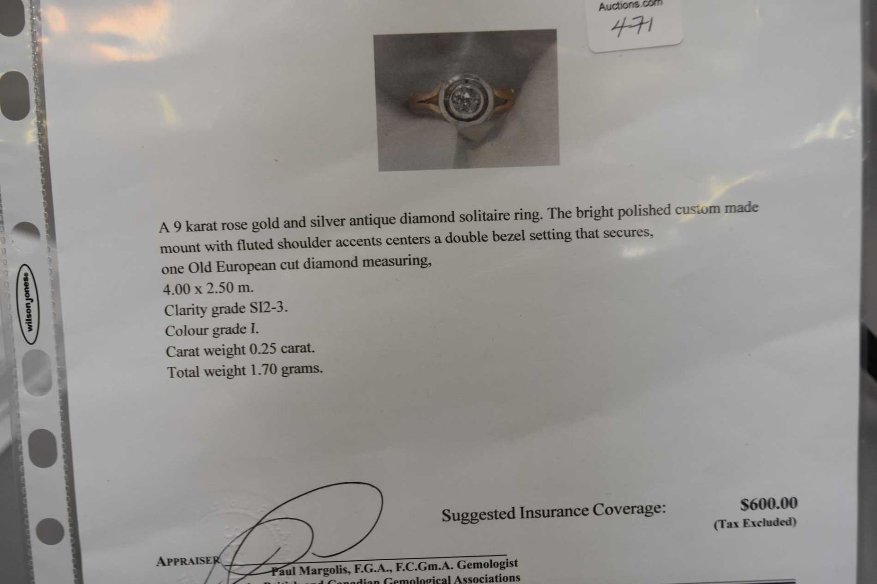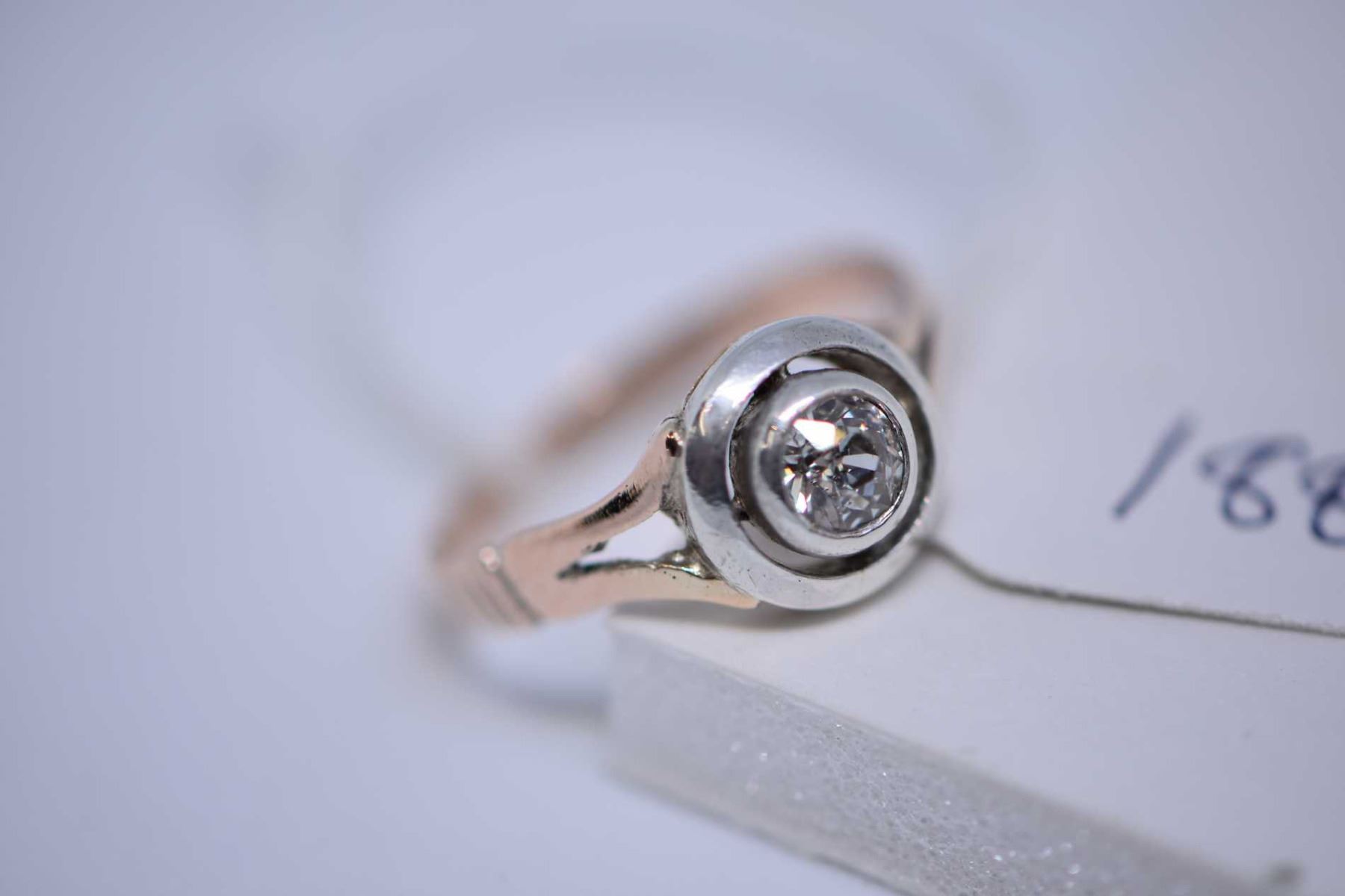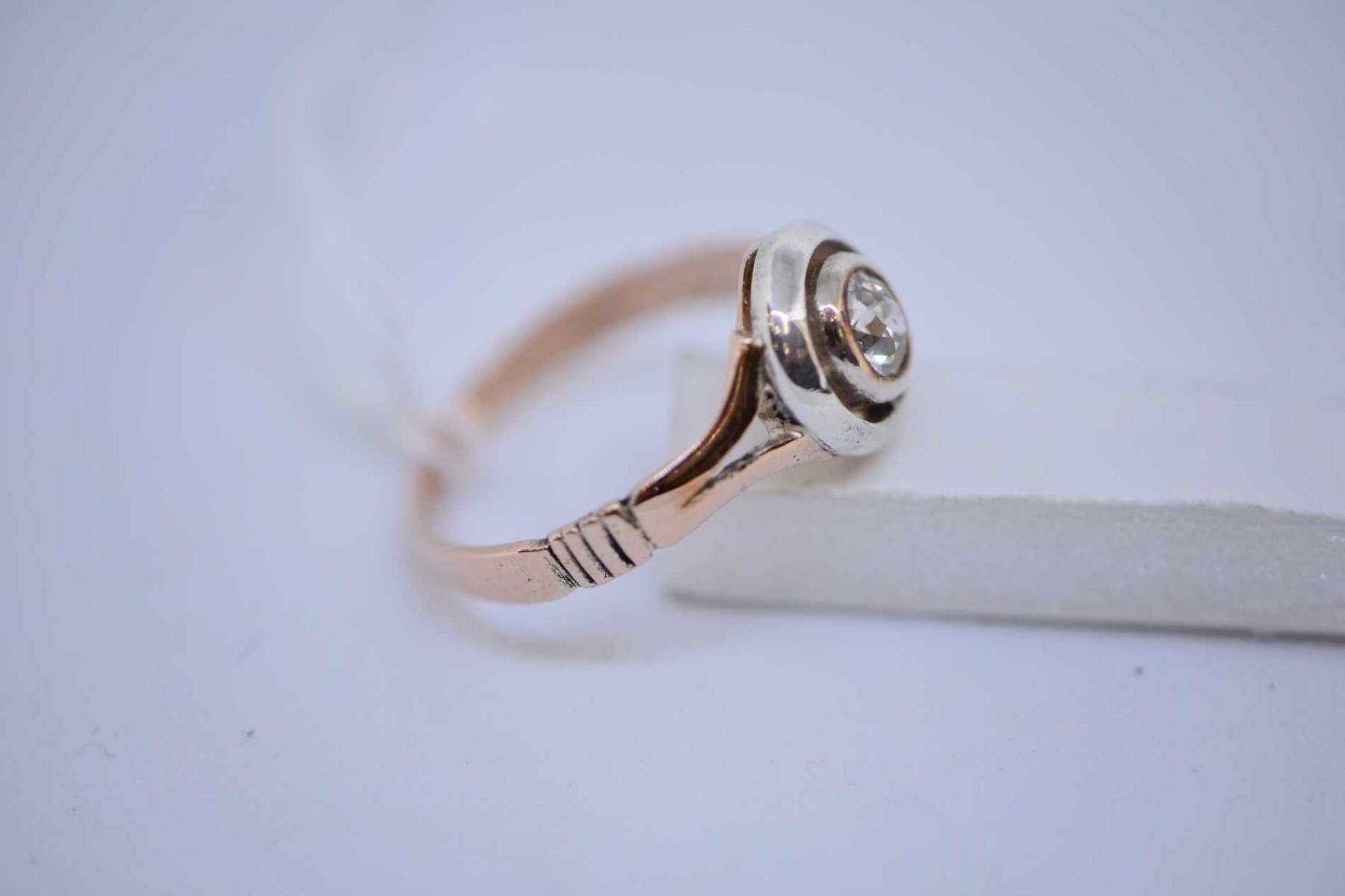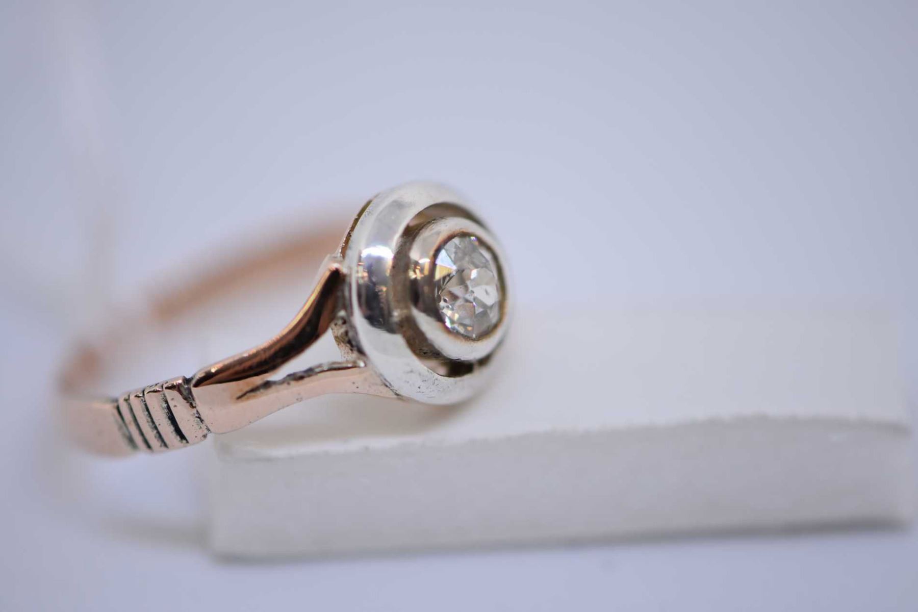 Antique 9kt rose gold and silver diamond solitaire ring set with 0.25ct Old European mine cut diamond. Retail replacement value $600.00