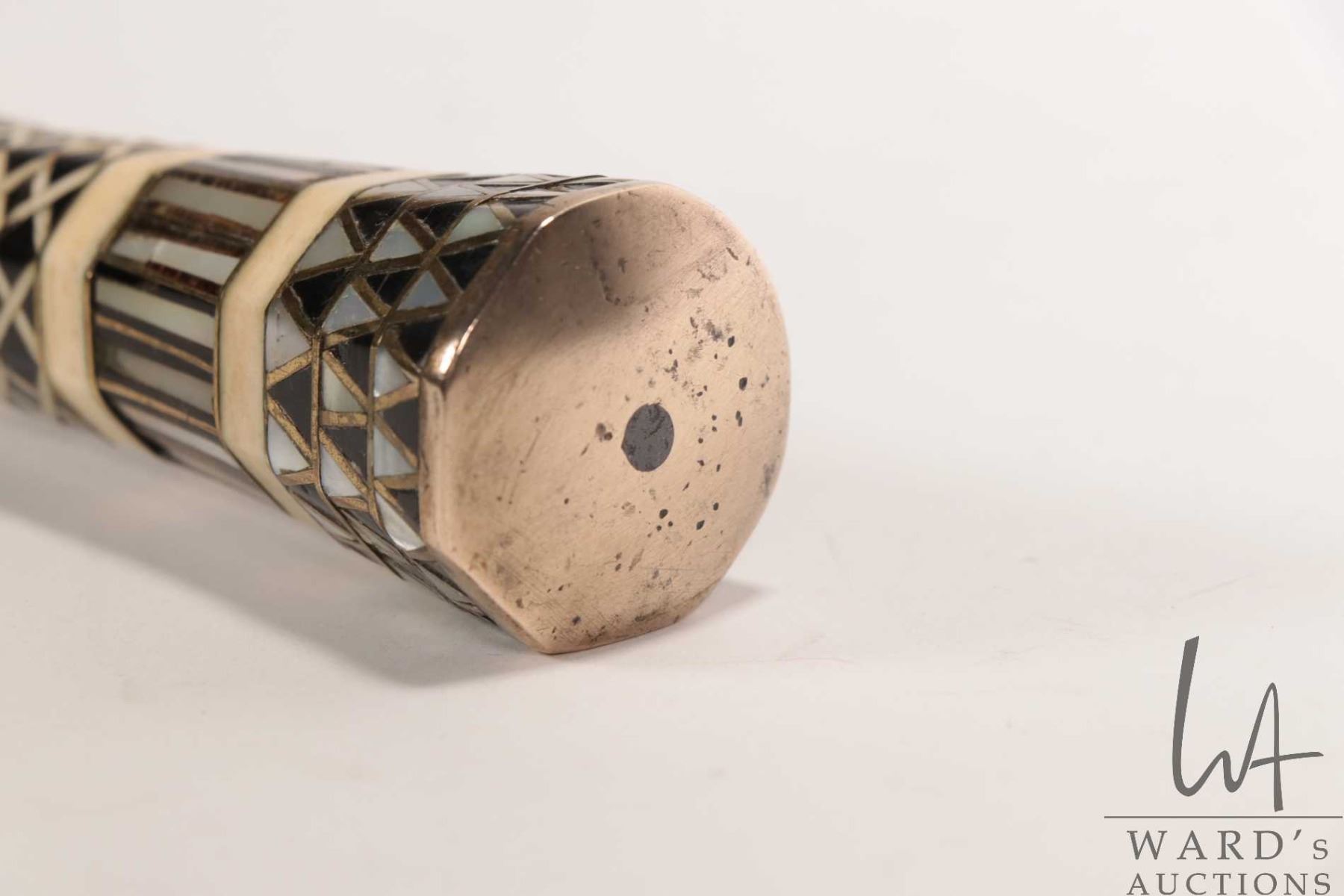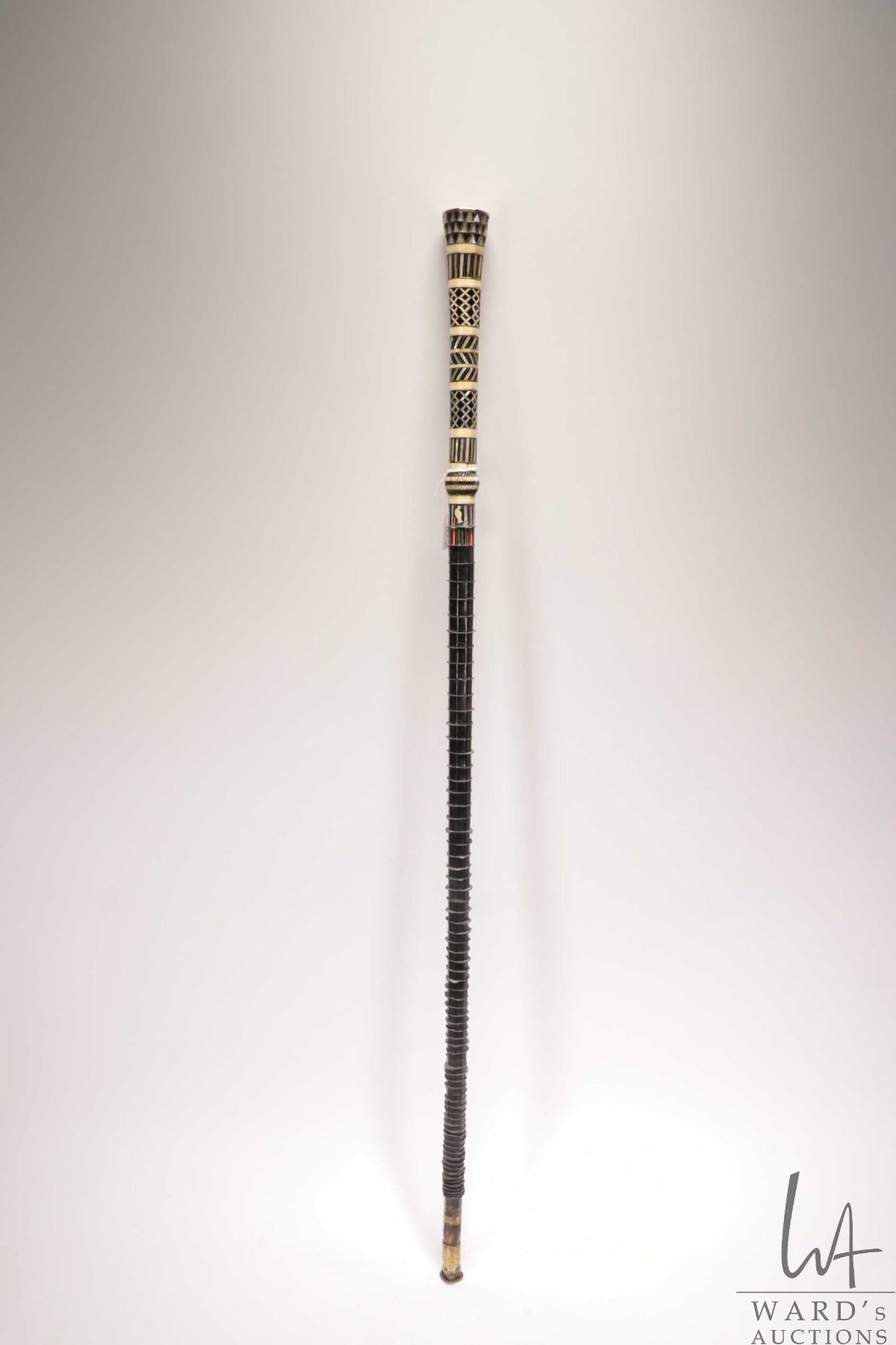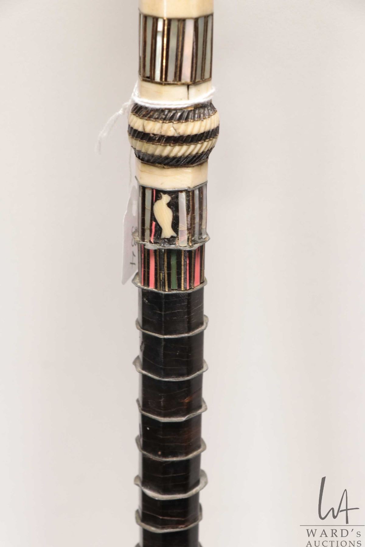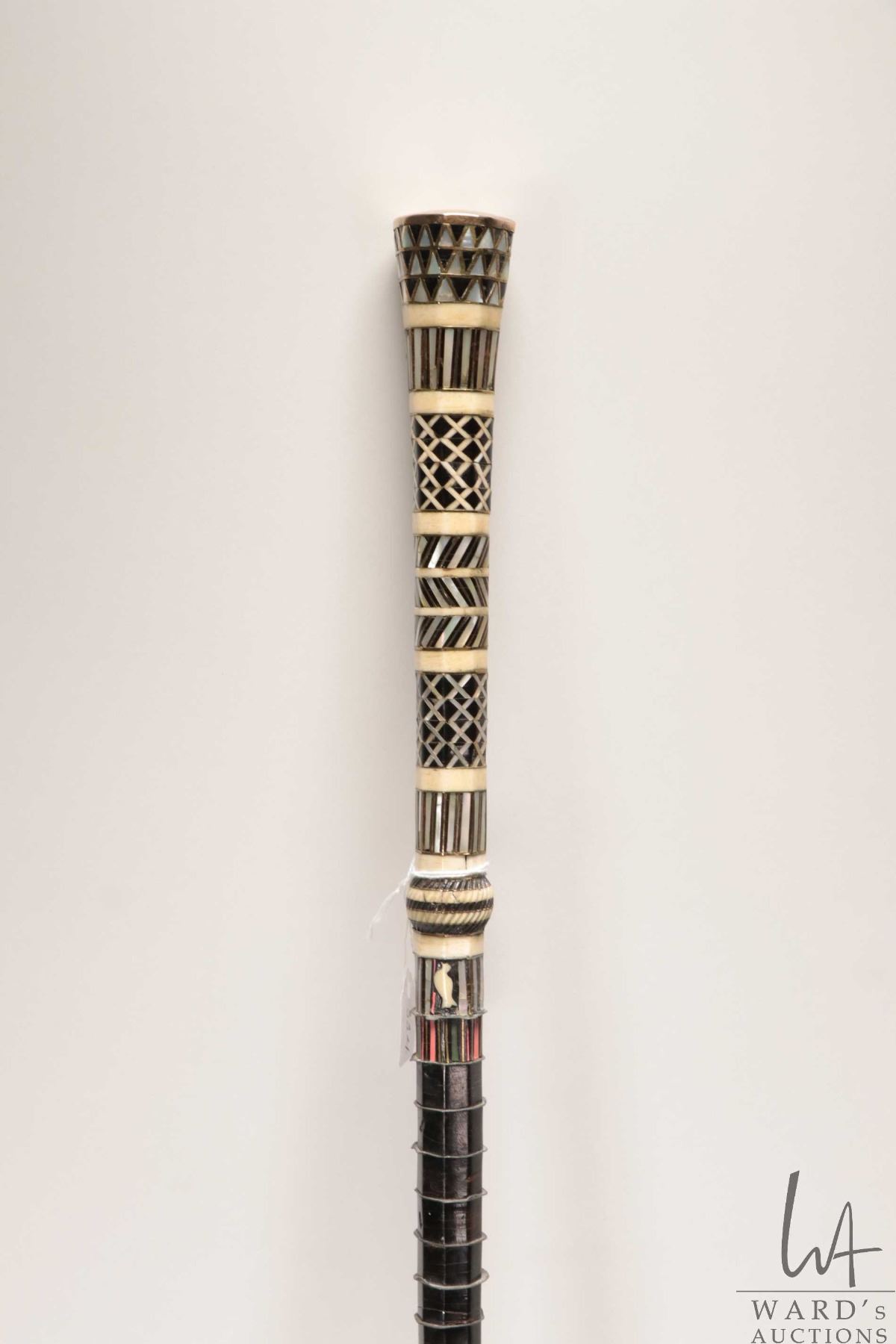 Antique African walking stick with horn and metal alternating ringed shaft and inlaid mother-of-pearl, ivory, brass and other material used on decorative top, 33" in height Note: Canadian buyers only. This item can not be shipped outside of Canada