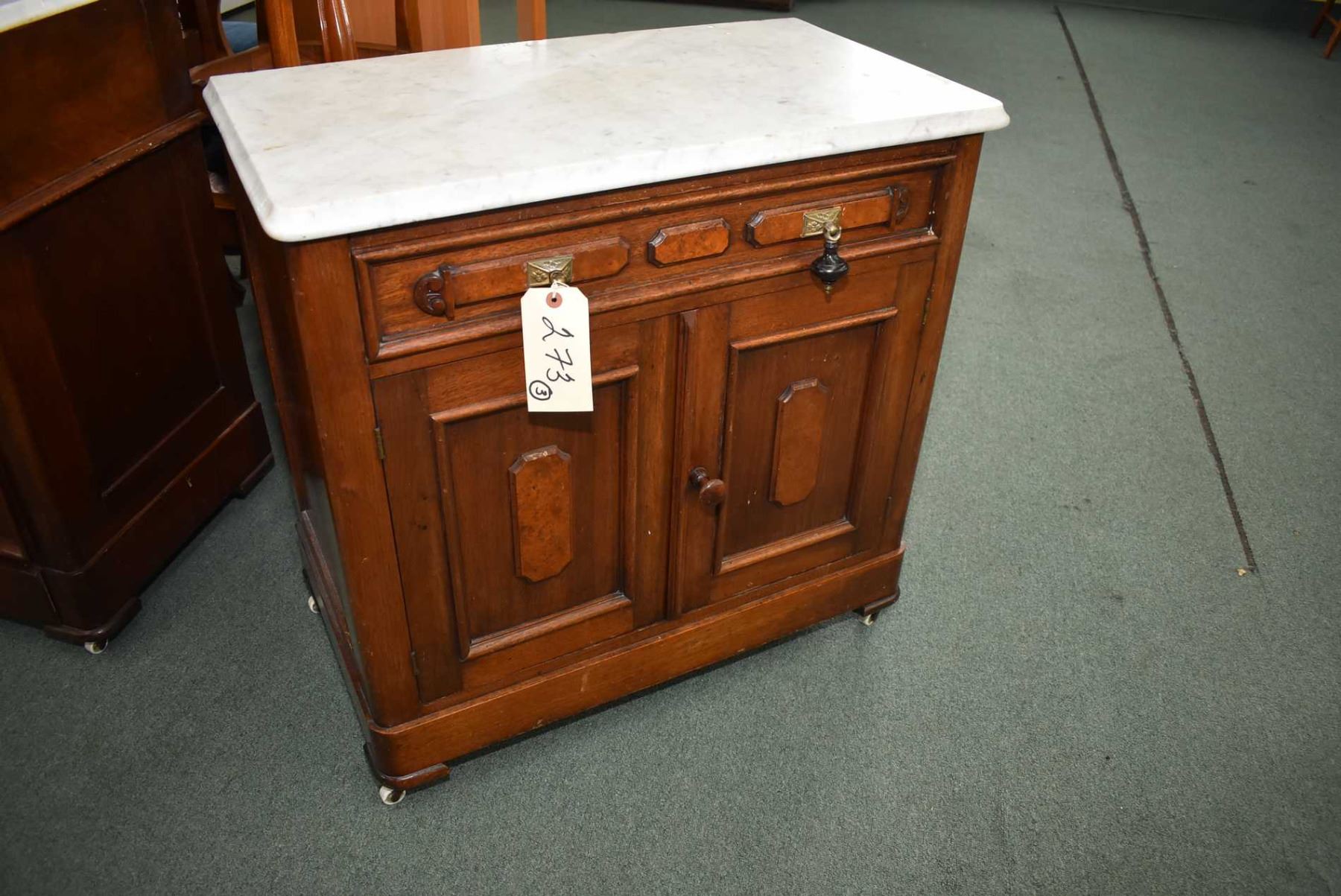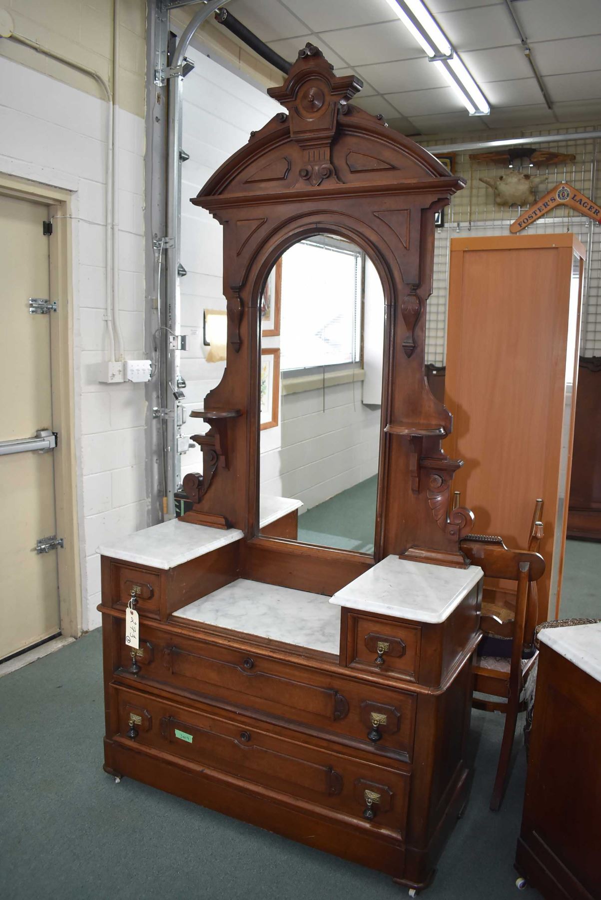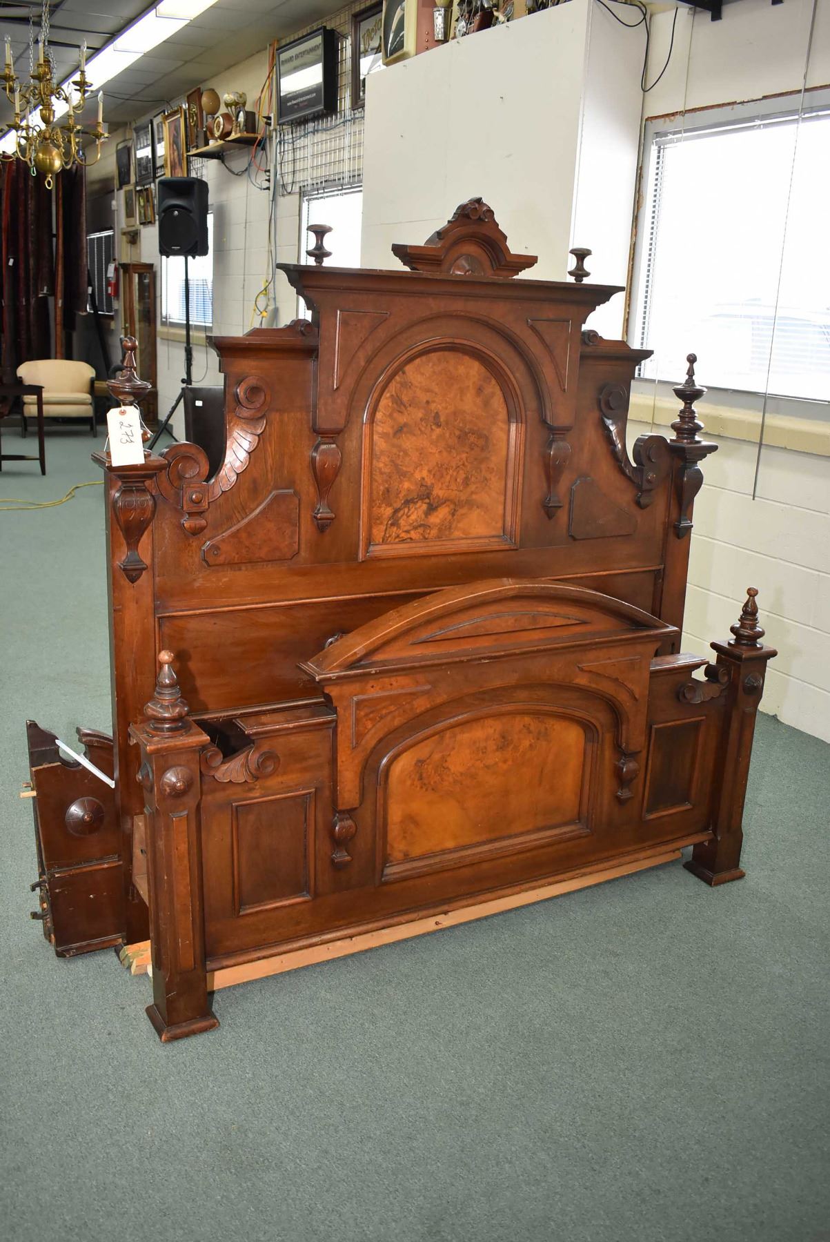 Antique American Victorian bedroom suite including 59" bed with headboard, footboard and rails with burl panel, marble top step vanity with mirror 93" in height and a marble top two door, single drawer washstand