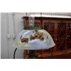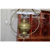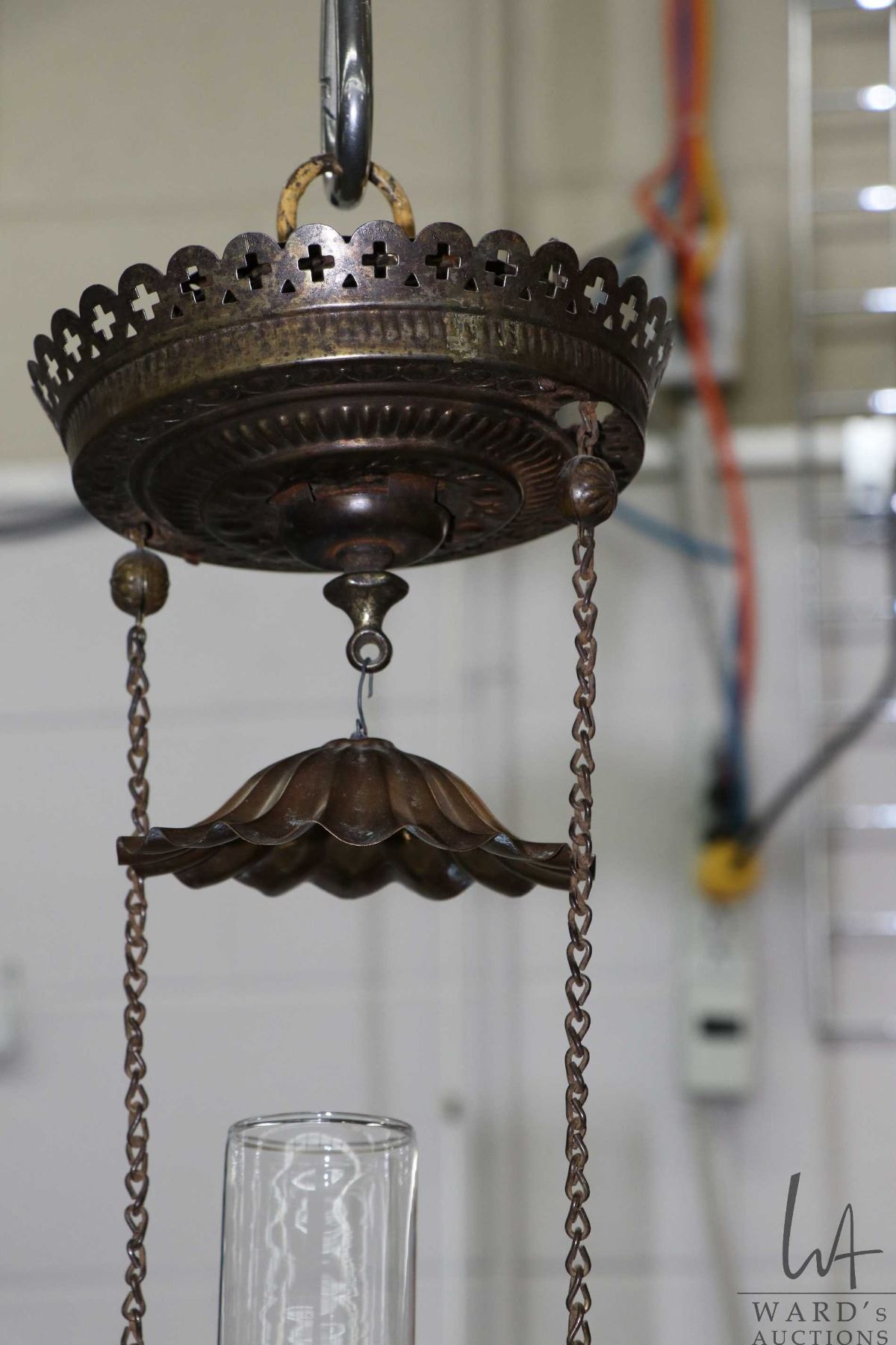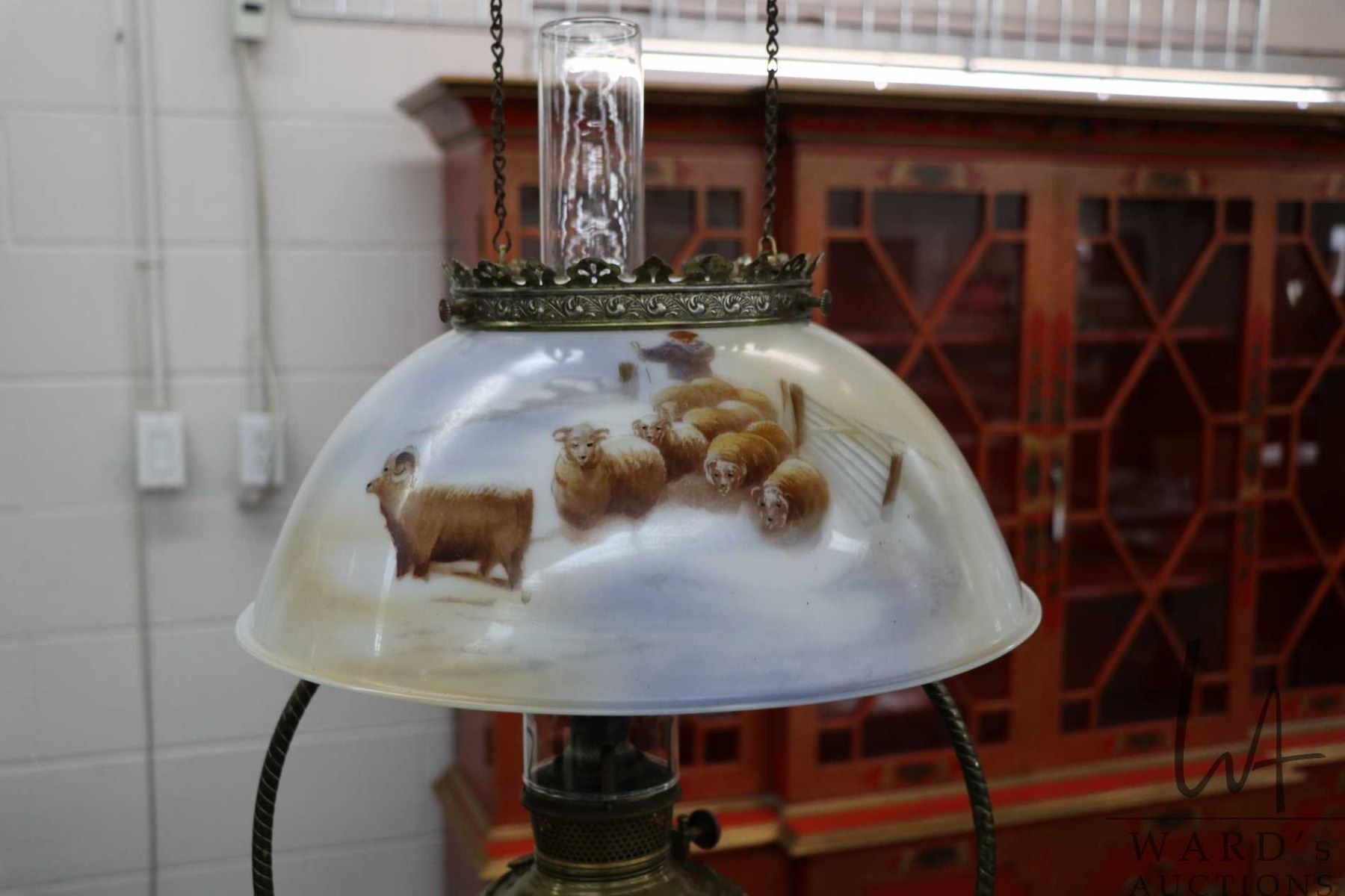 Antique American made Parker ceiling lamp oil lamp with functioning rise and fall counterweight and hand painted milk glass shade. Note: No shipping for this lot. Local pickup only
