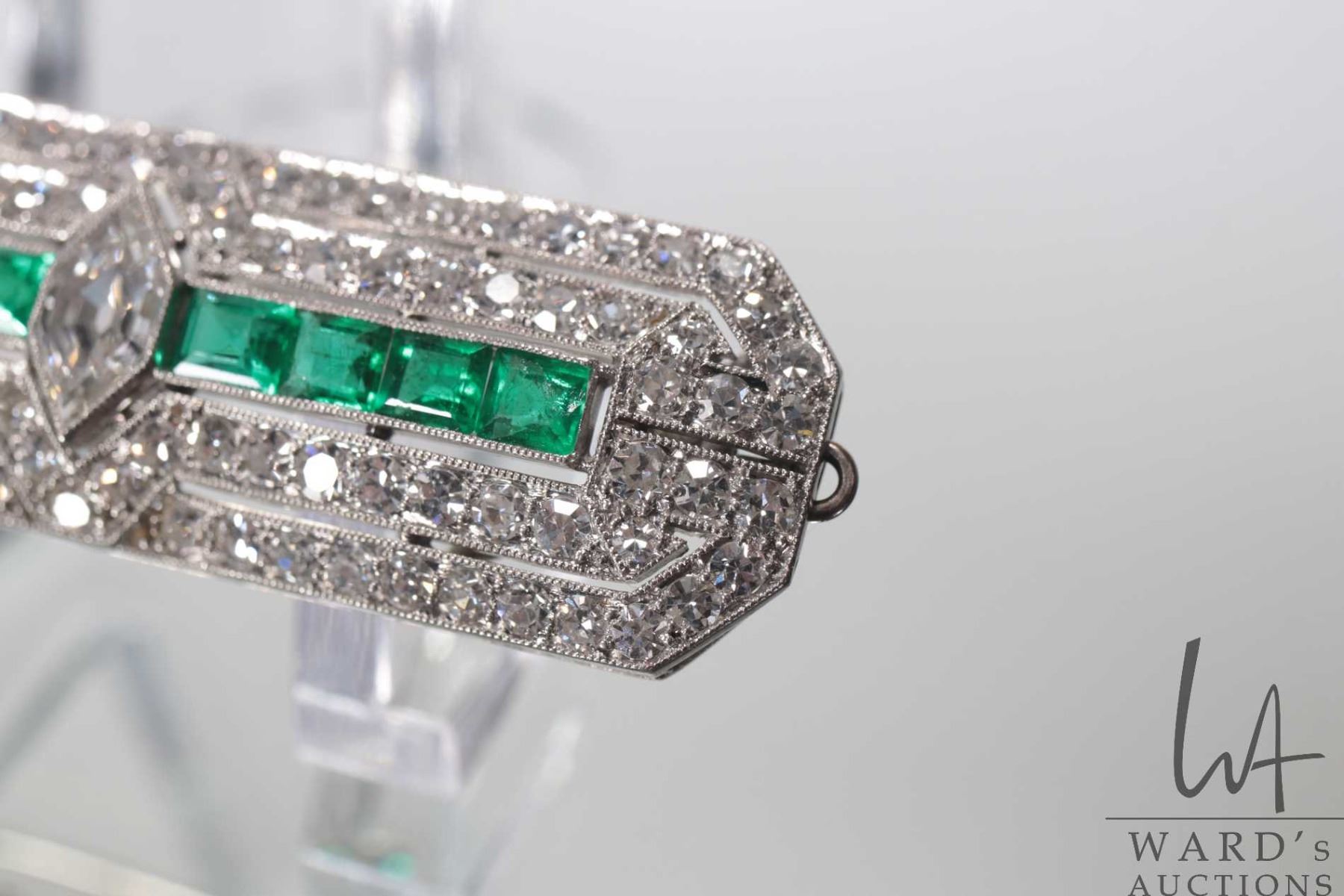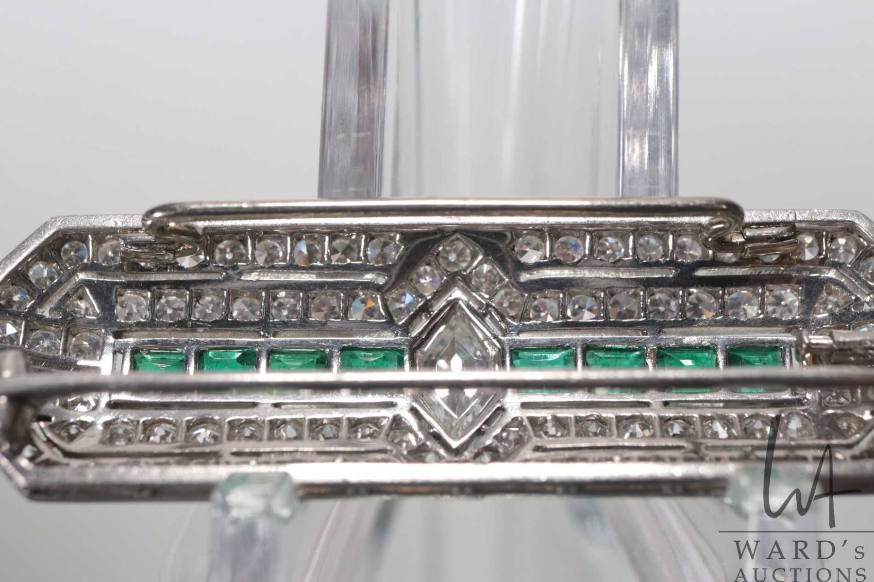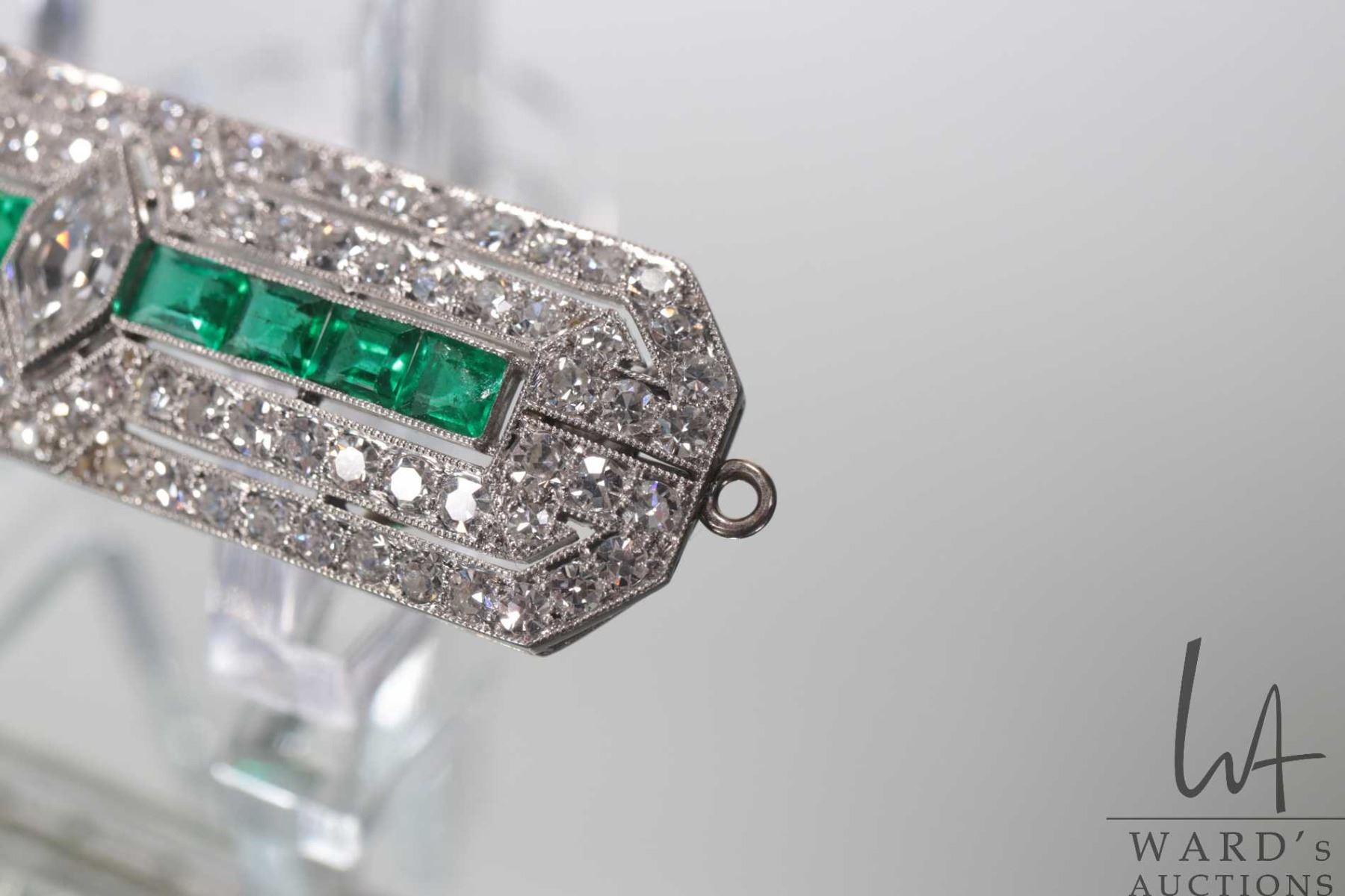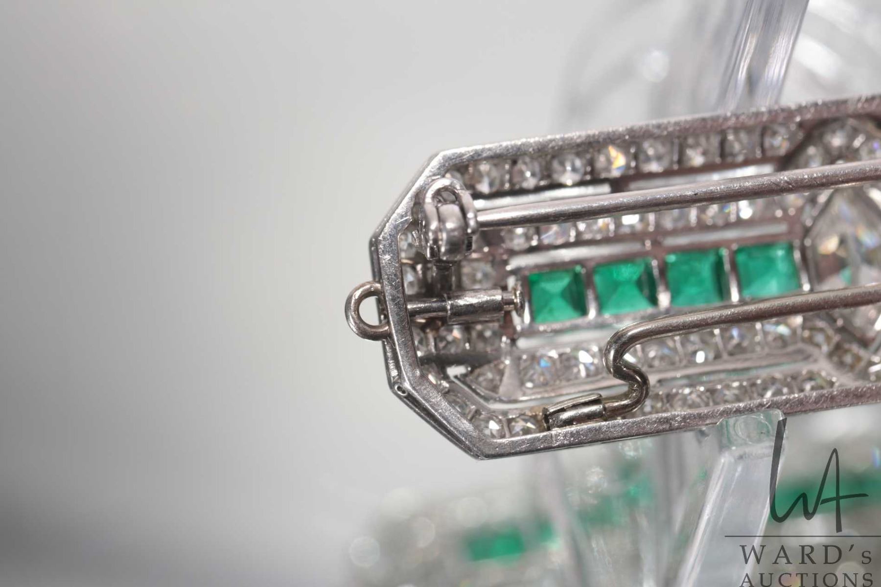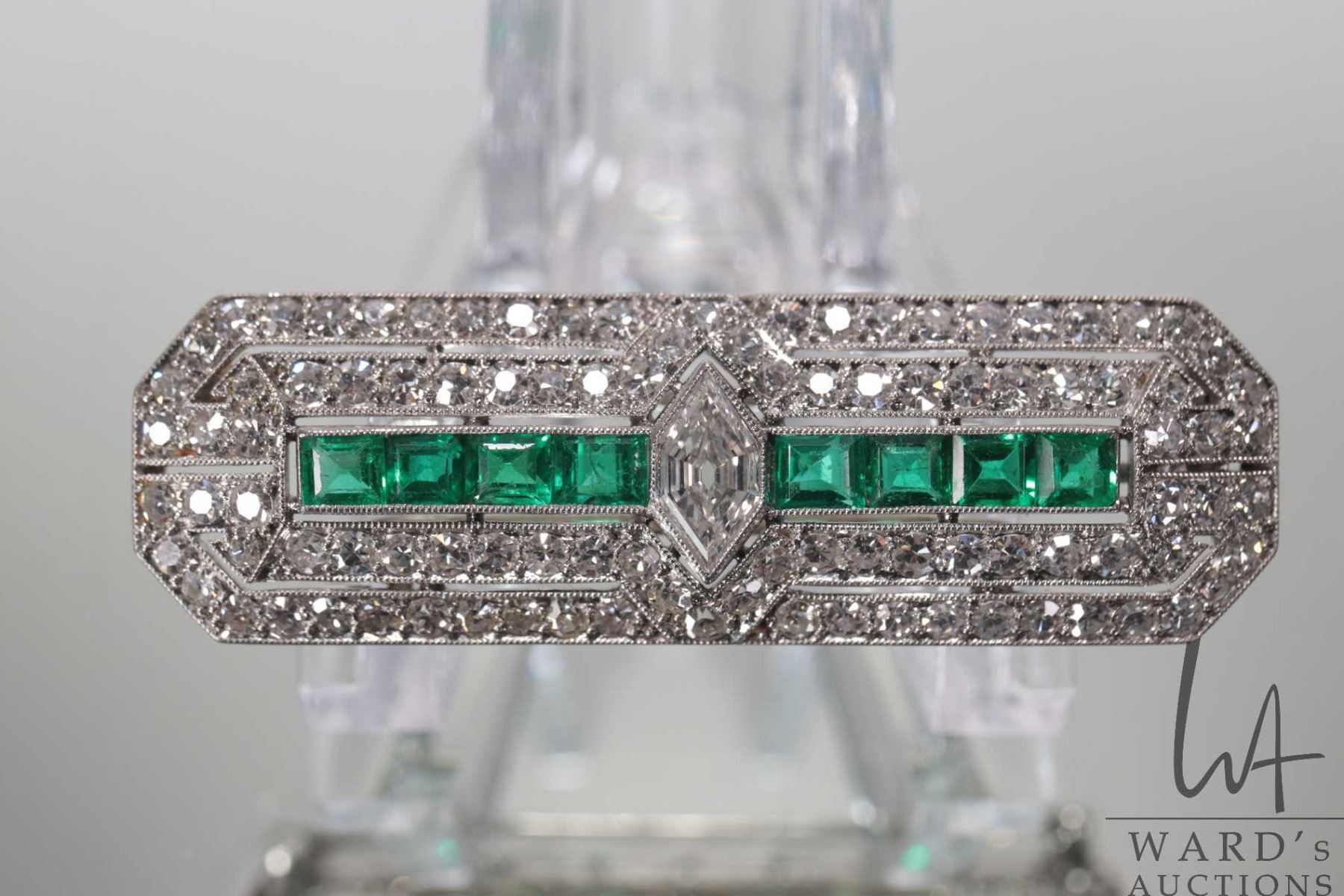 Antique Art Deco platinum emerald and diamond brooch set with center hexagonal step cut .50ct diamond, 2.41cts of round single cut diamonds and eight ( 1.25cts) of step cut emerald gemstones. Note: brooch can also be worn as a pendant as it includes a retractable bale and as a chocker as it also includes and fold down ribbon holder, see photos. Retail replacement value $ 16,700.00