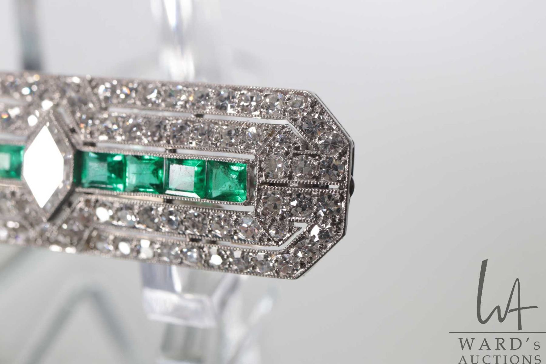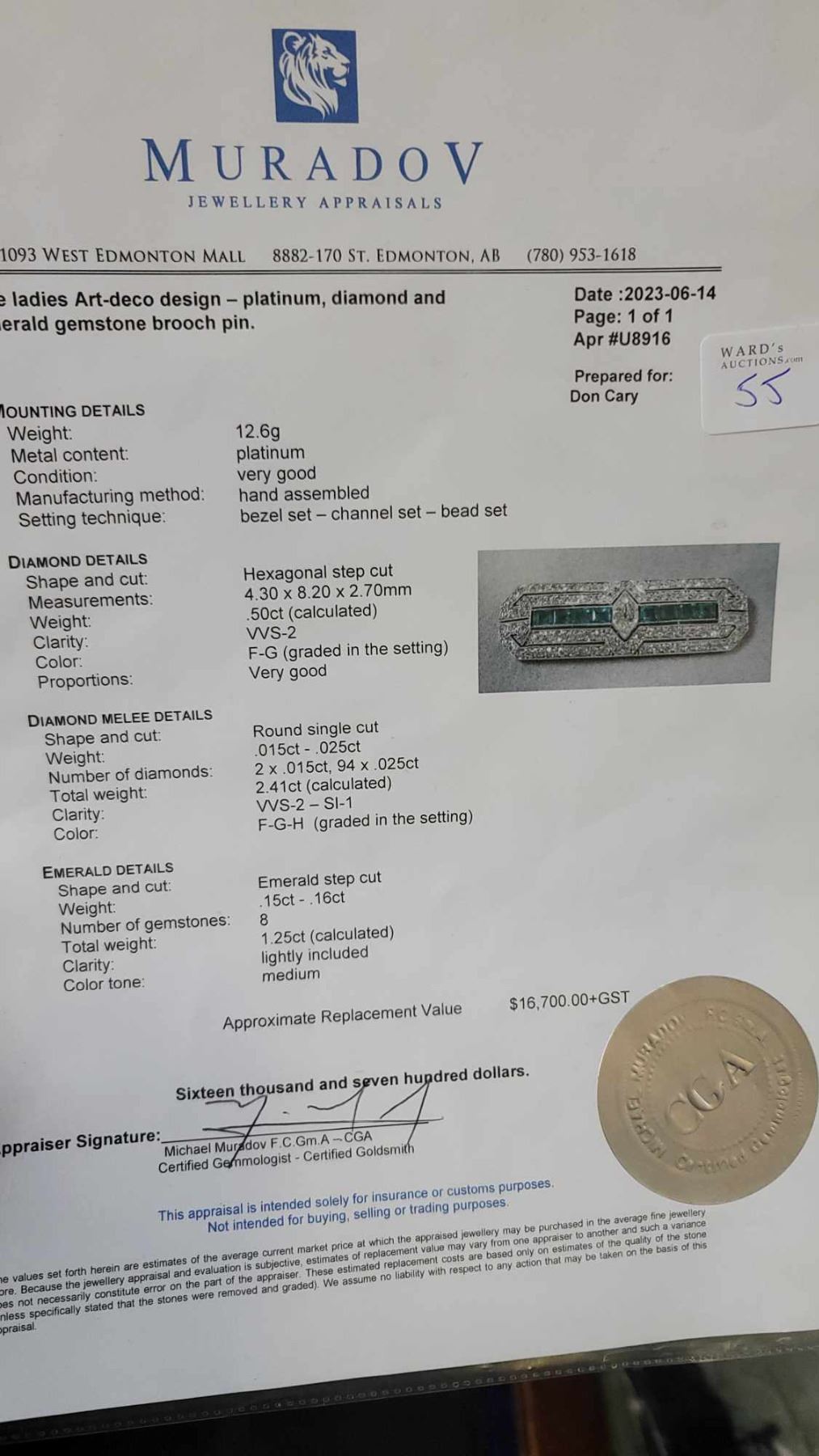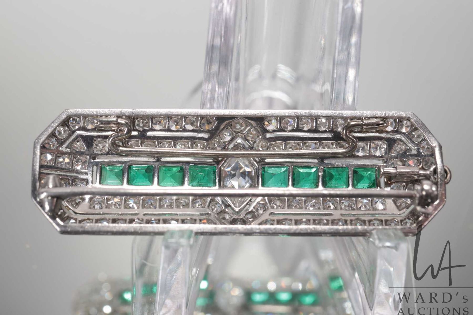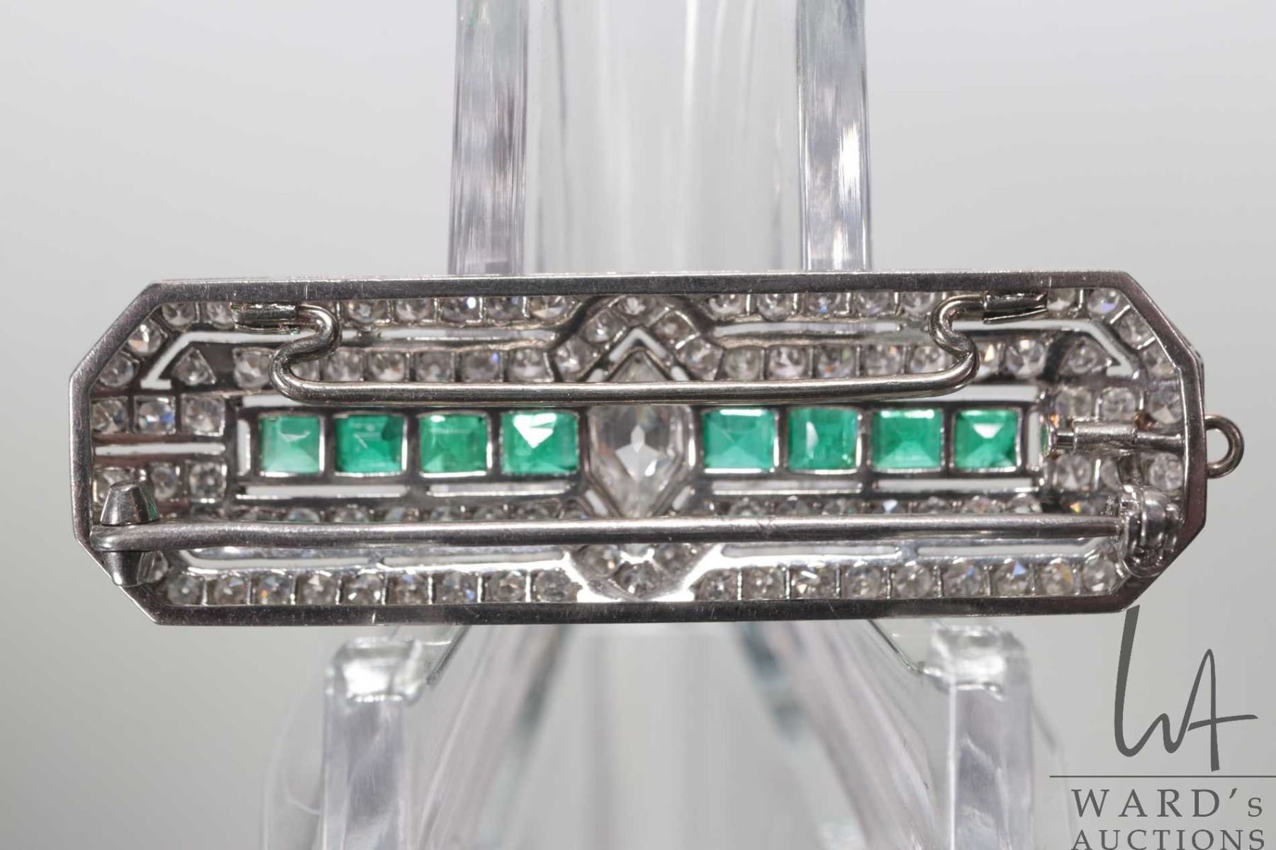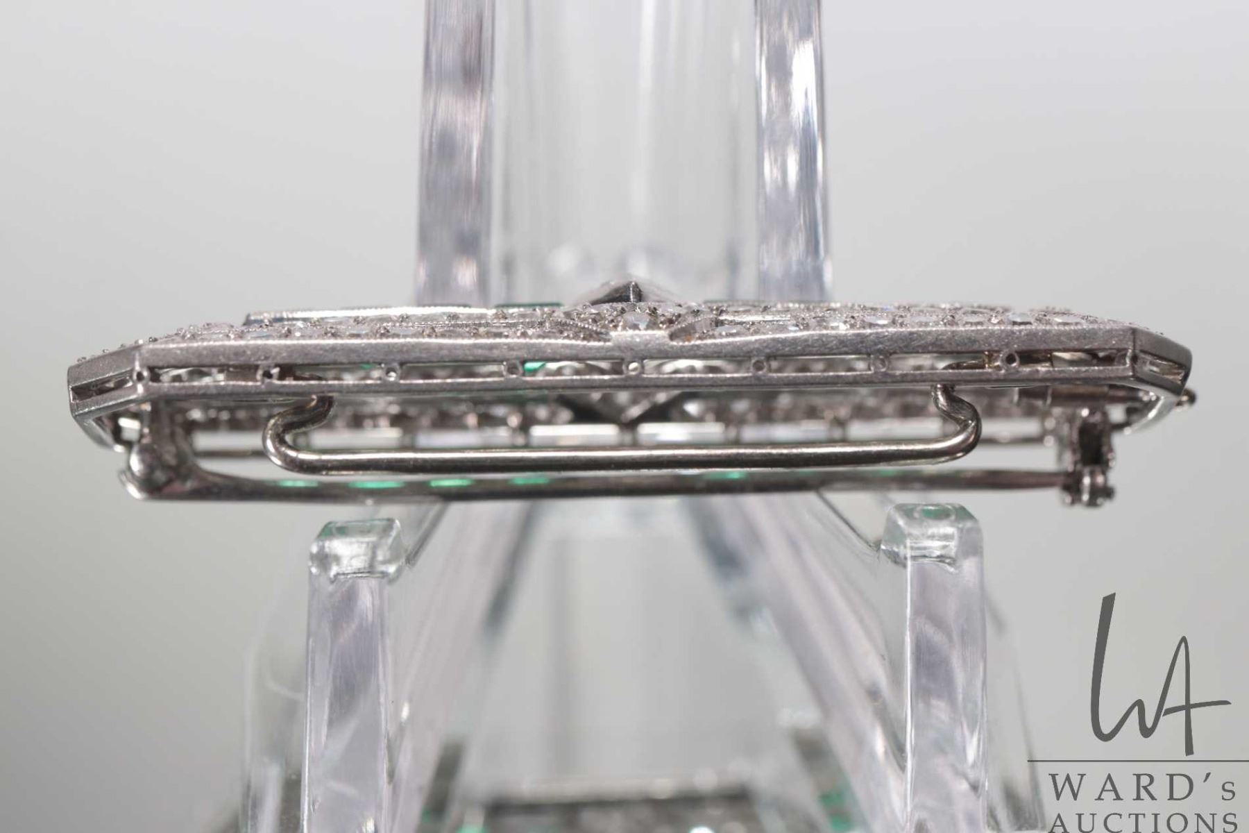 Antique Art Deco platinum emerald and diamond brooch set with center hexagonal step cut .50ct diamond, 2.41cts of round single cut diamonds and eight ( 1.25cts) of step cut emerald gemstones. Note: brooch can also be worn as a pendant as it includes a retractable bale and as a chocker as it also includes and fold down ribbon holder, see photos. Retail replacement value $ 16,700.00