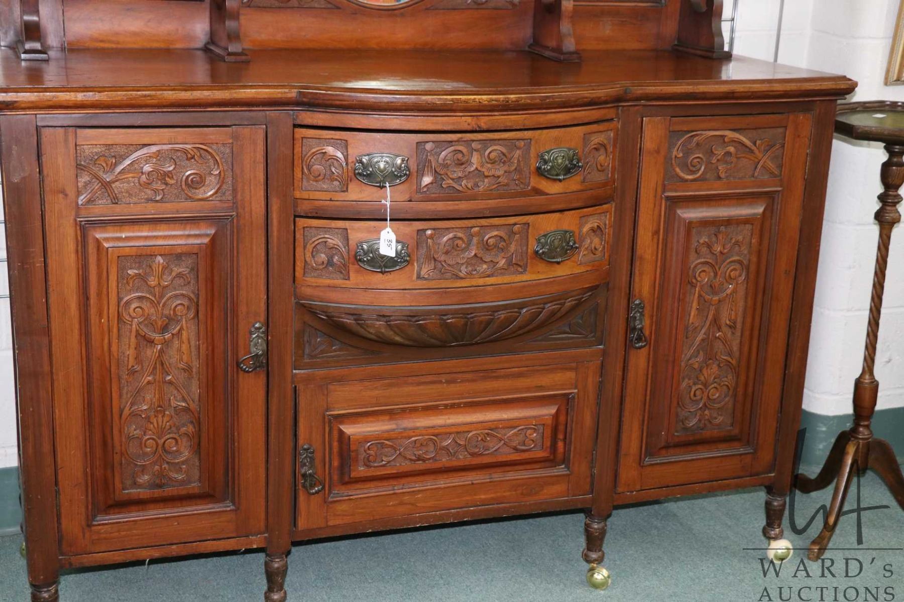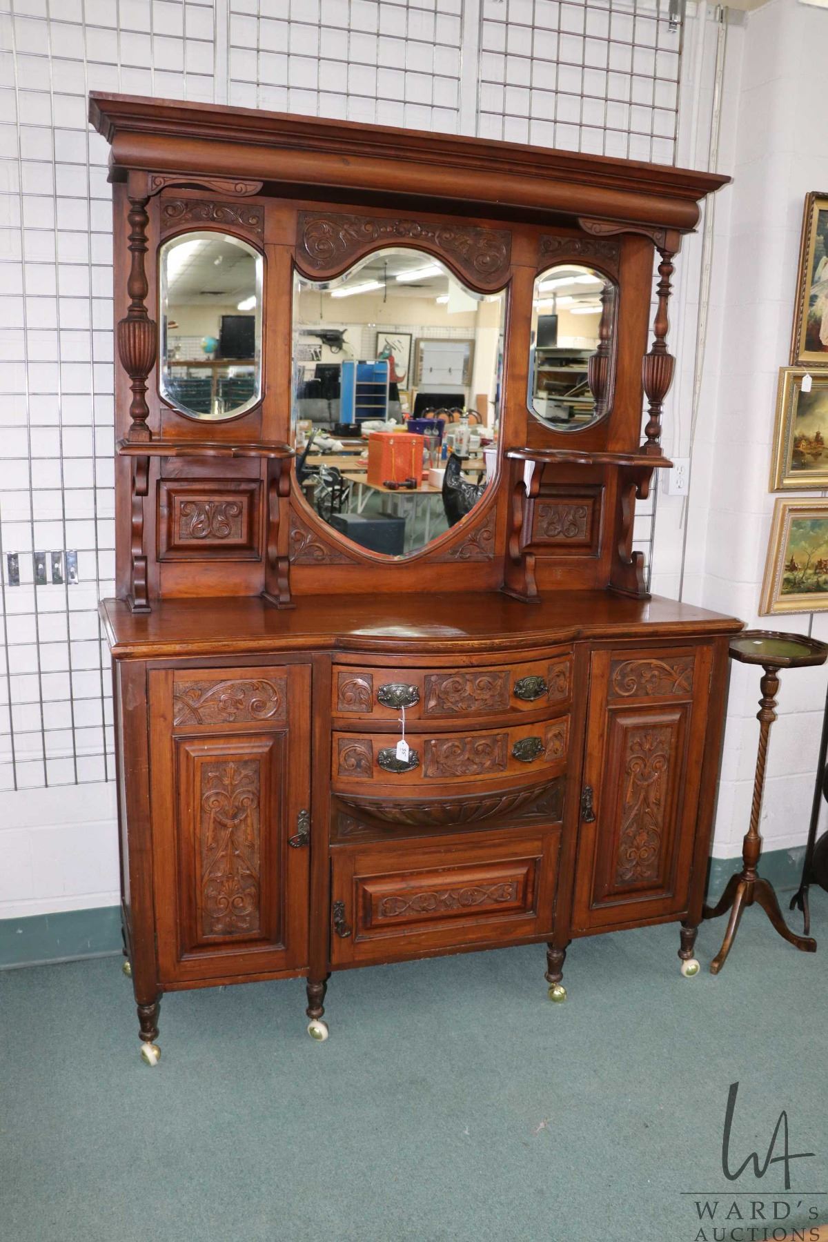 Antique Art Nouveau hand carved two piece sideboard with three beveled mirror, note: non-original ca