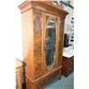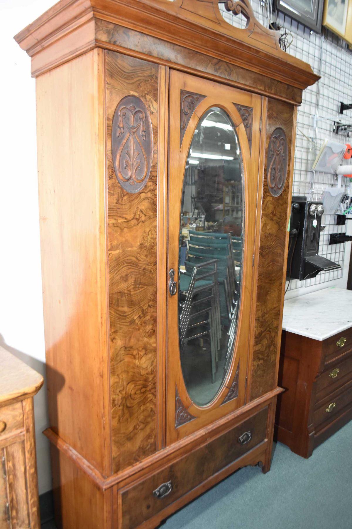 Antique Art Nouveau single door wardrobe with matched grain burl panels with hand carved cameos and corner accents plus a large oval bevelled mirror, drawer in base and original finish and hardware