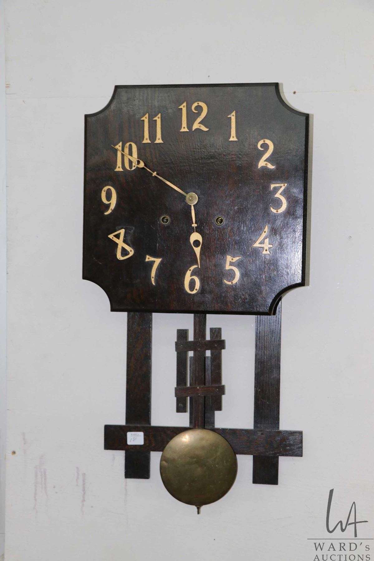 Antique Arts & Crafts style oak wall clock labeled "The National Clock & Manufacturing Company, Chicago. Ill", with brass Arabic numerals and brass and oak pendulum, working at time of cataloguing, overall dimensions 24" X 13"