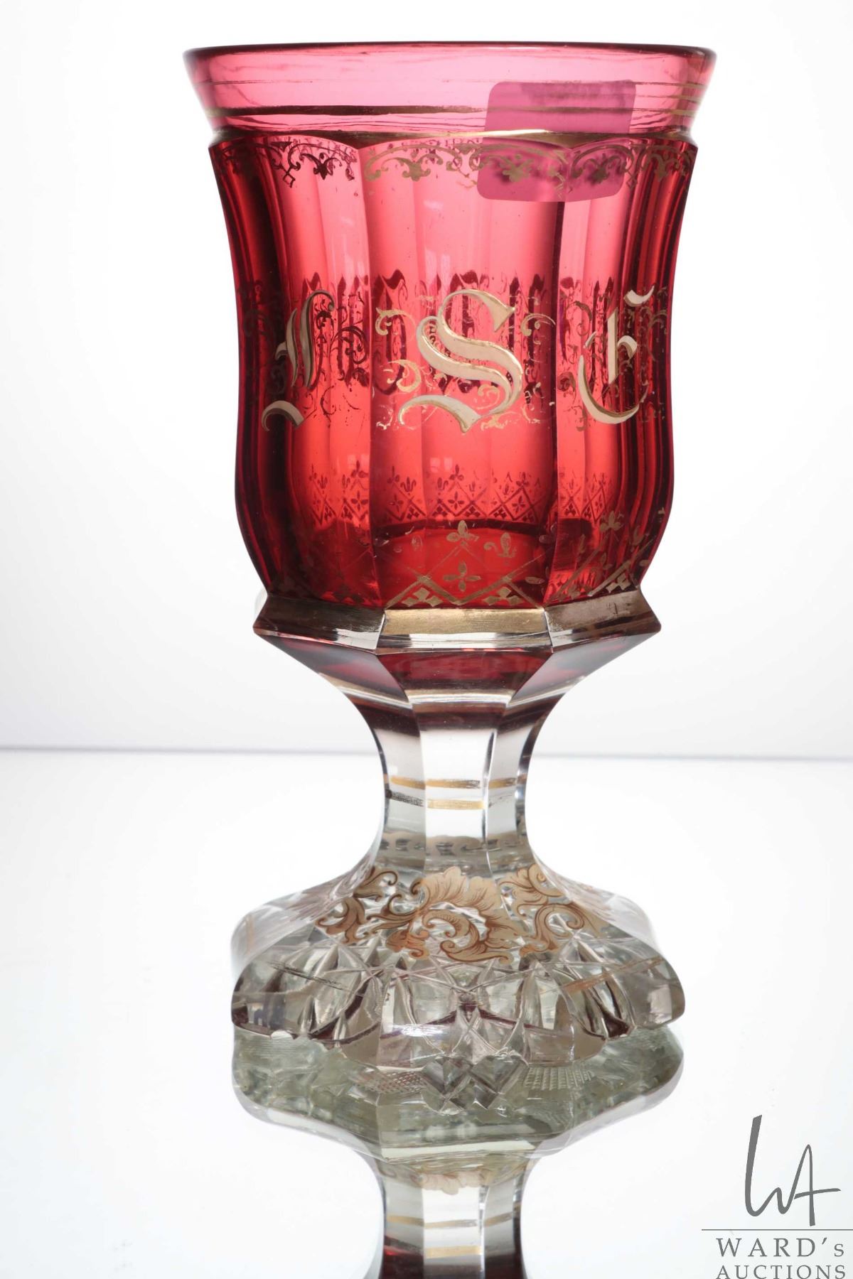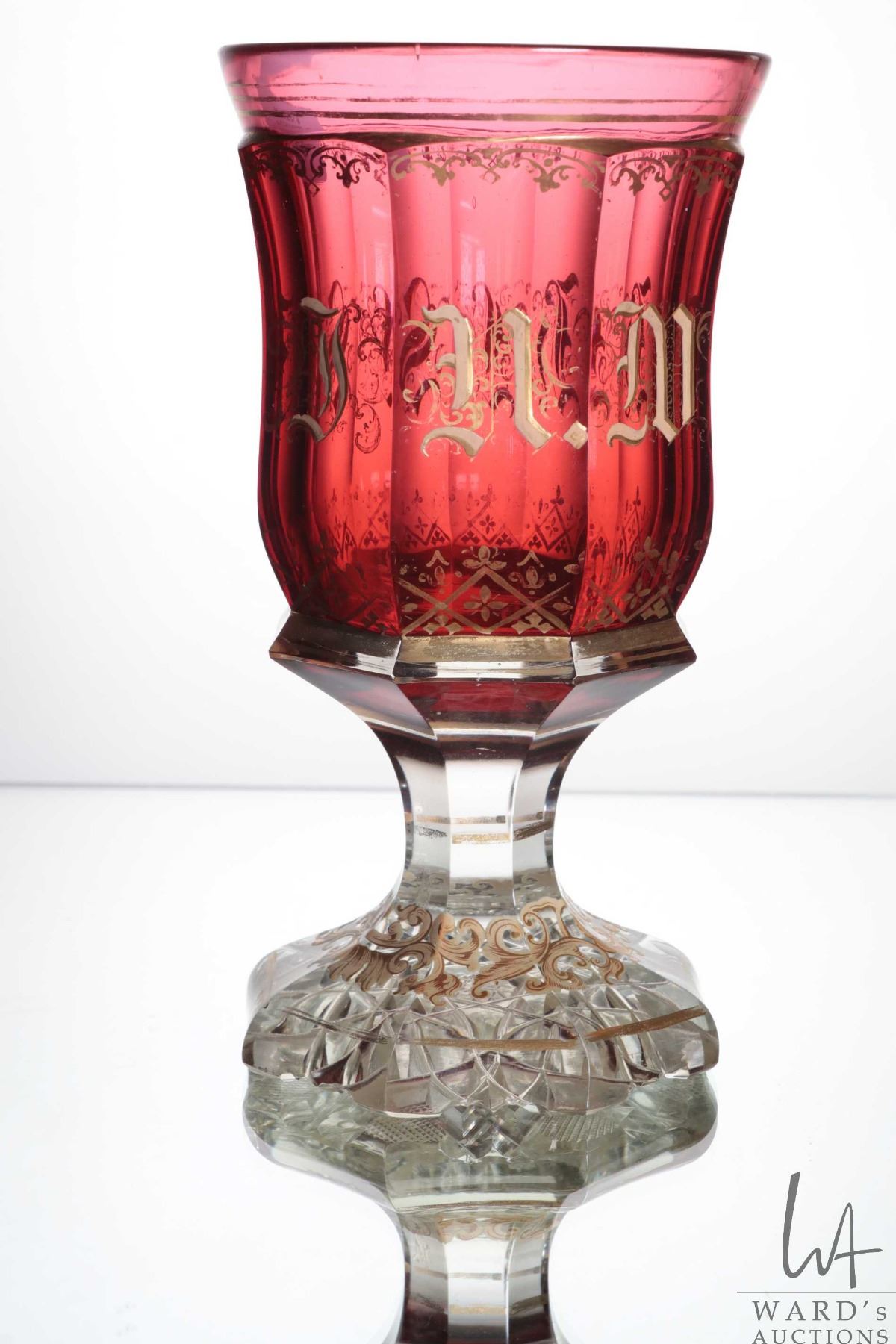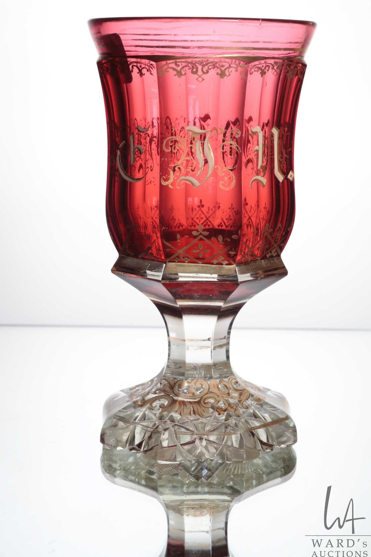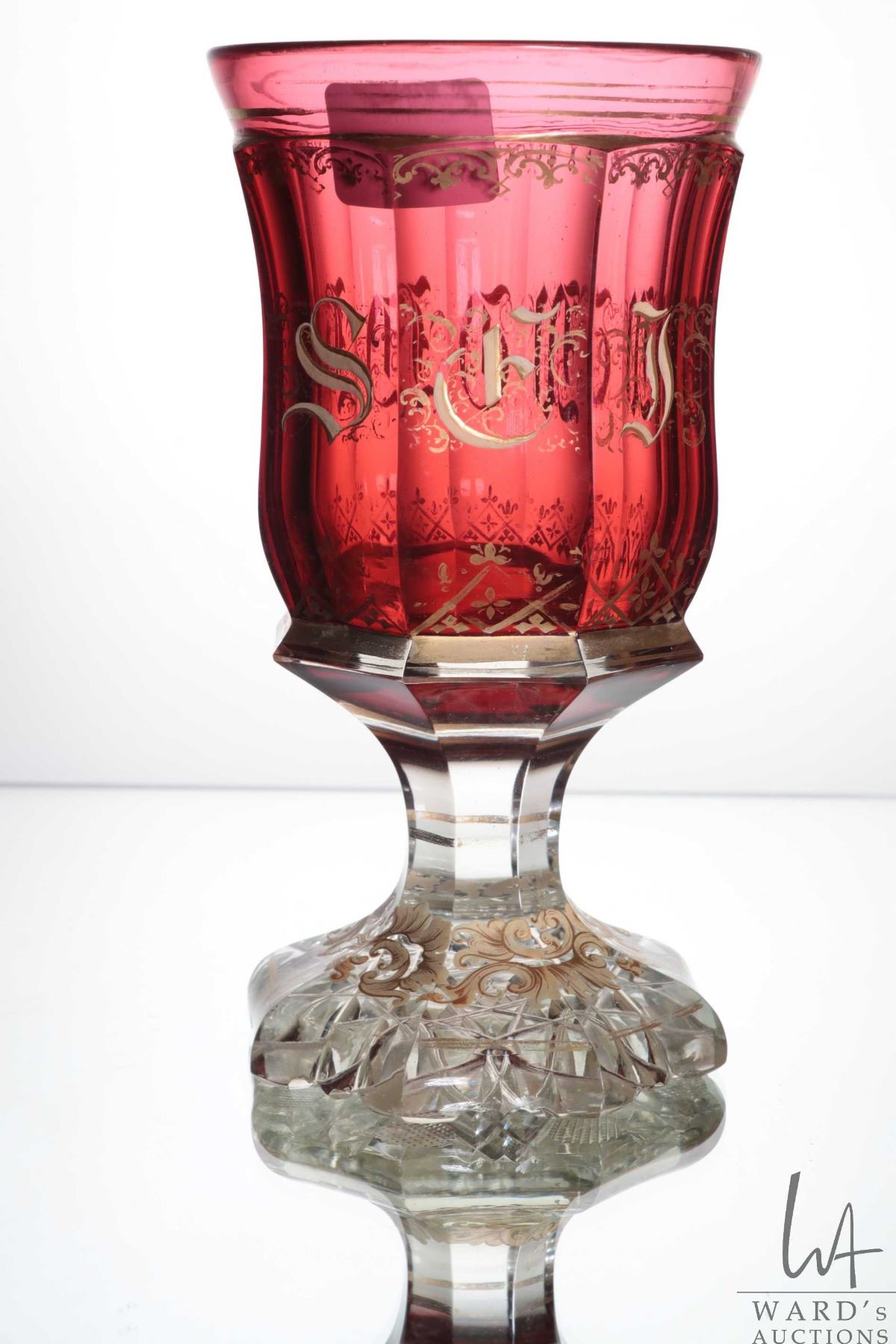 Antique Bohemian Fredreich Ergermann crystal goblet with cranberry glass bowl, clear stem and wheel carved crystal under base, hand painted gold overlay lettering and decoration, circa mid 1800's, 16.5cm in height