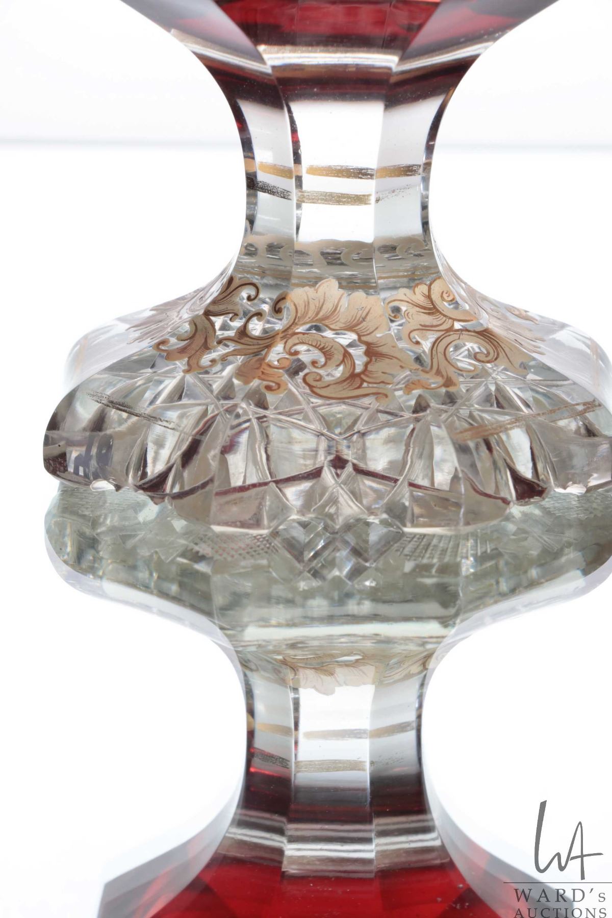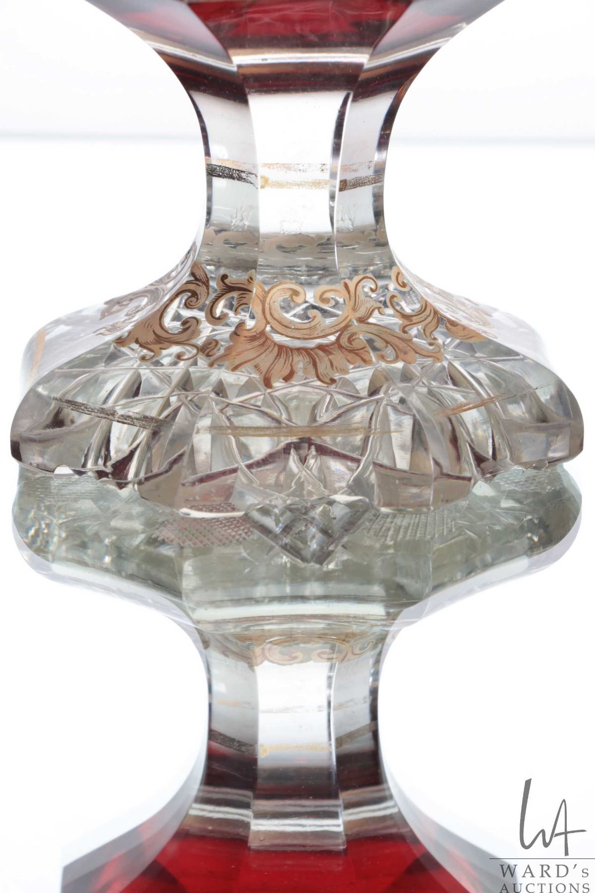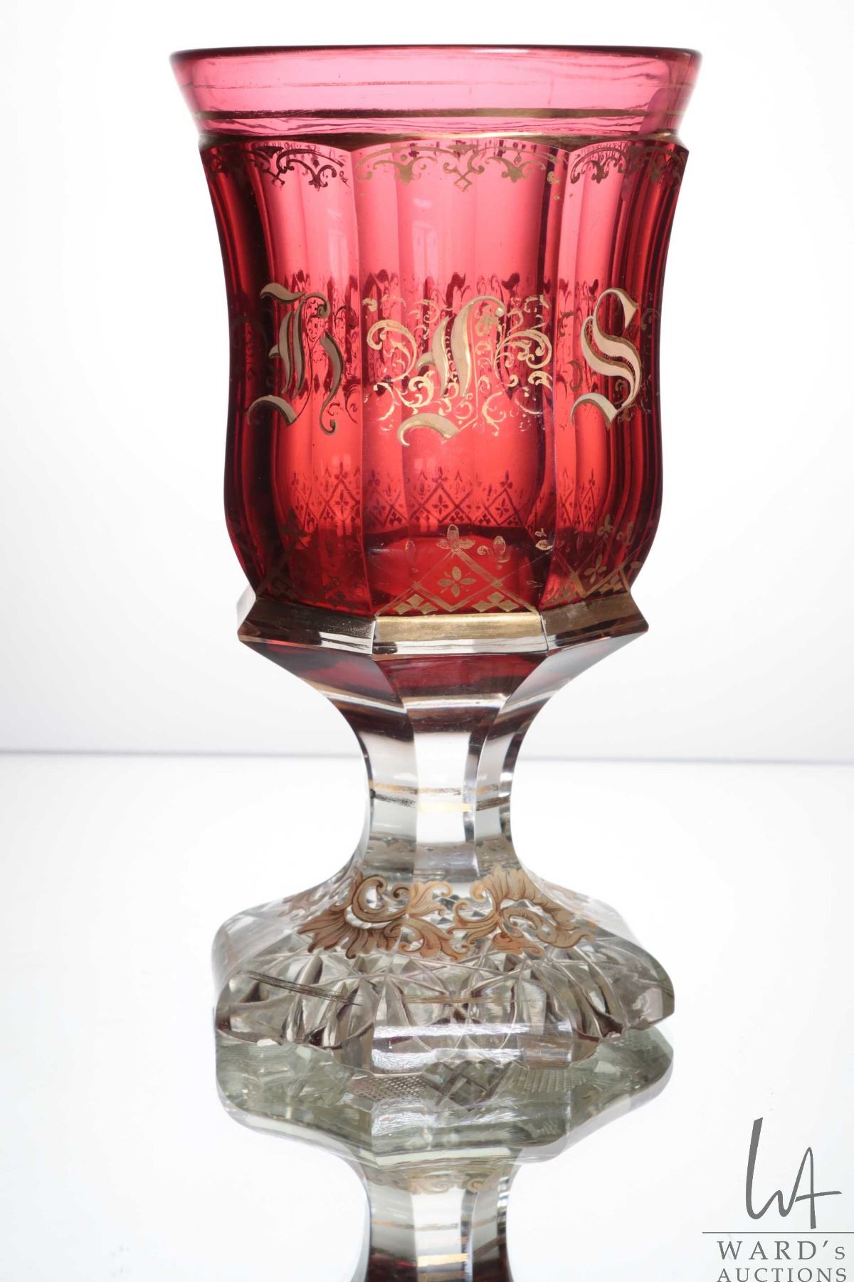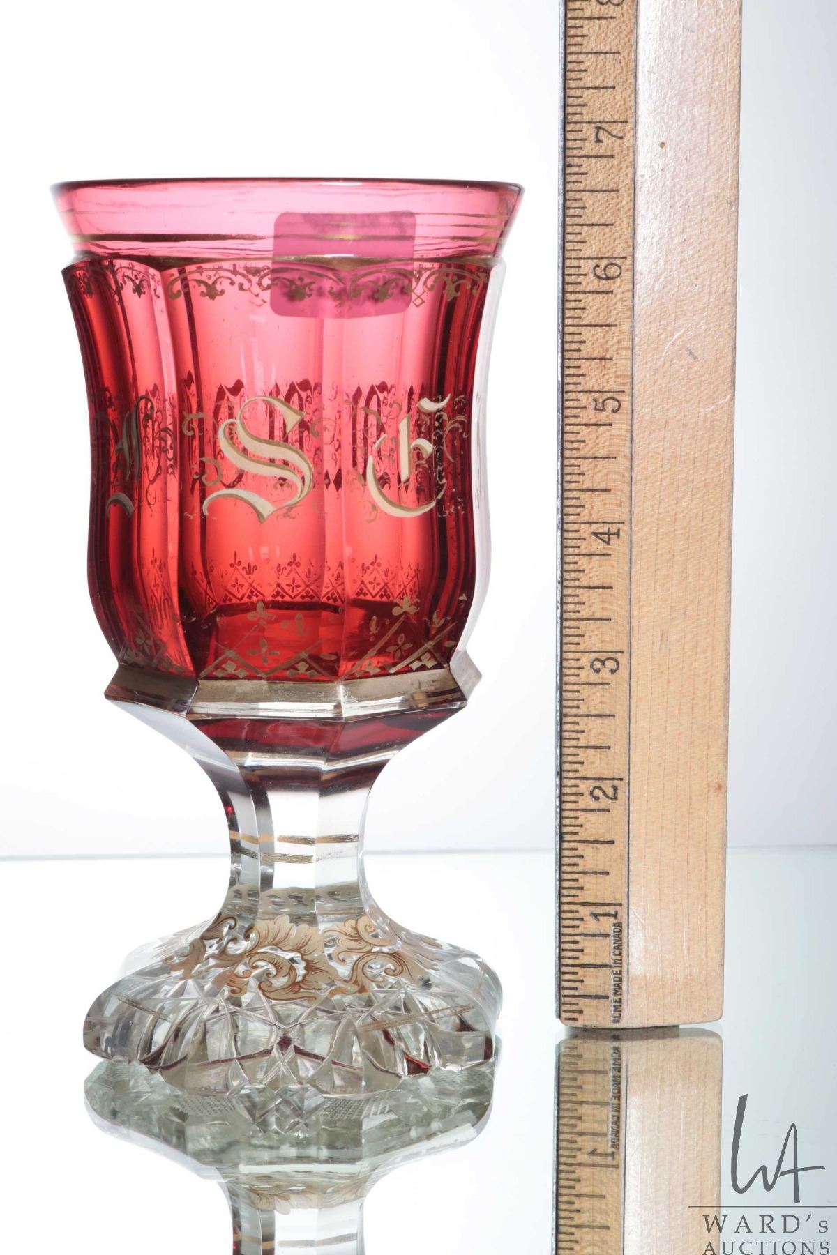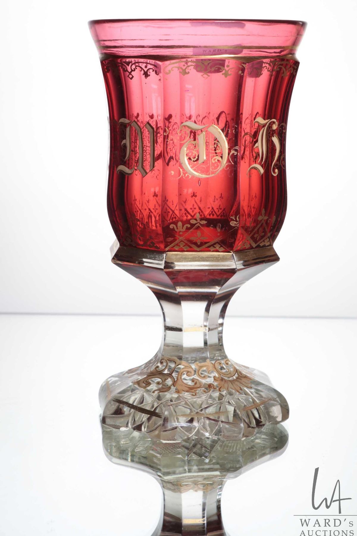 Antique Bohemian Fredreich Ergermann crystal goblet with cranberry glass bowl, clear stem and wheel carved crystal under base, hand painted gold overlay lettering and decoration, circa mid 1800's, 16.5cm in height