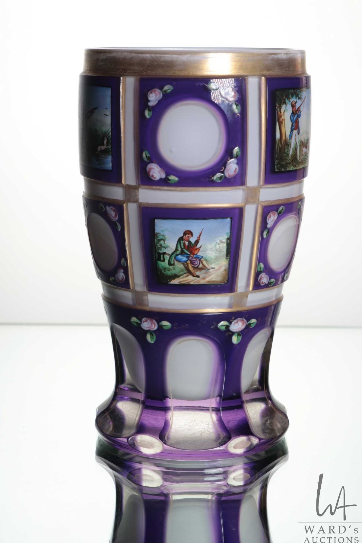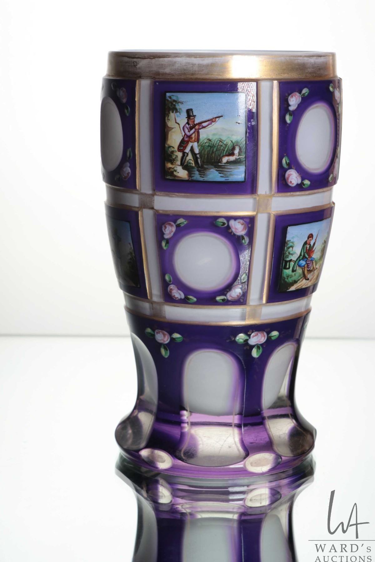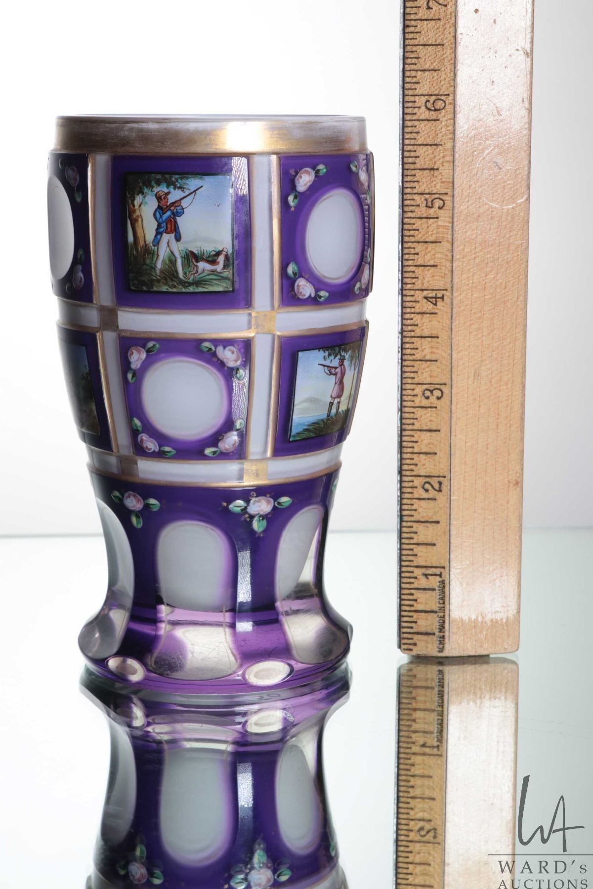 Antique Bohemian cased glass beaker with purple cut to clear panels, milk glass lining and hand painted hunt scenes and decorative roses, some gilt overlay, circa mid 1800's, 22.5cm