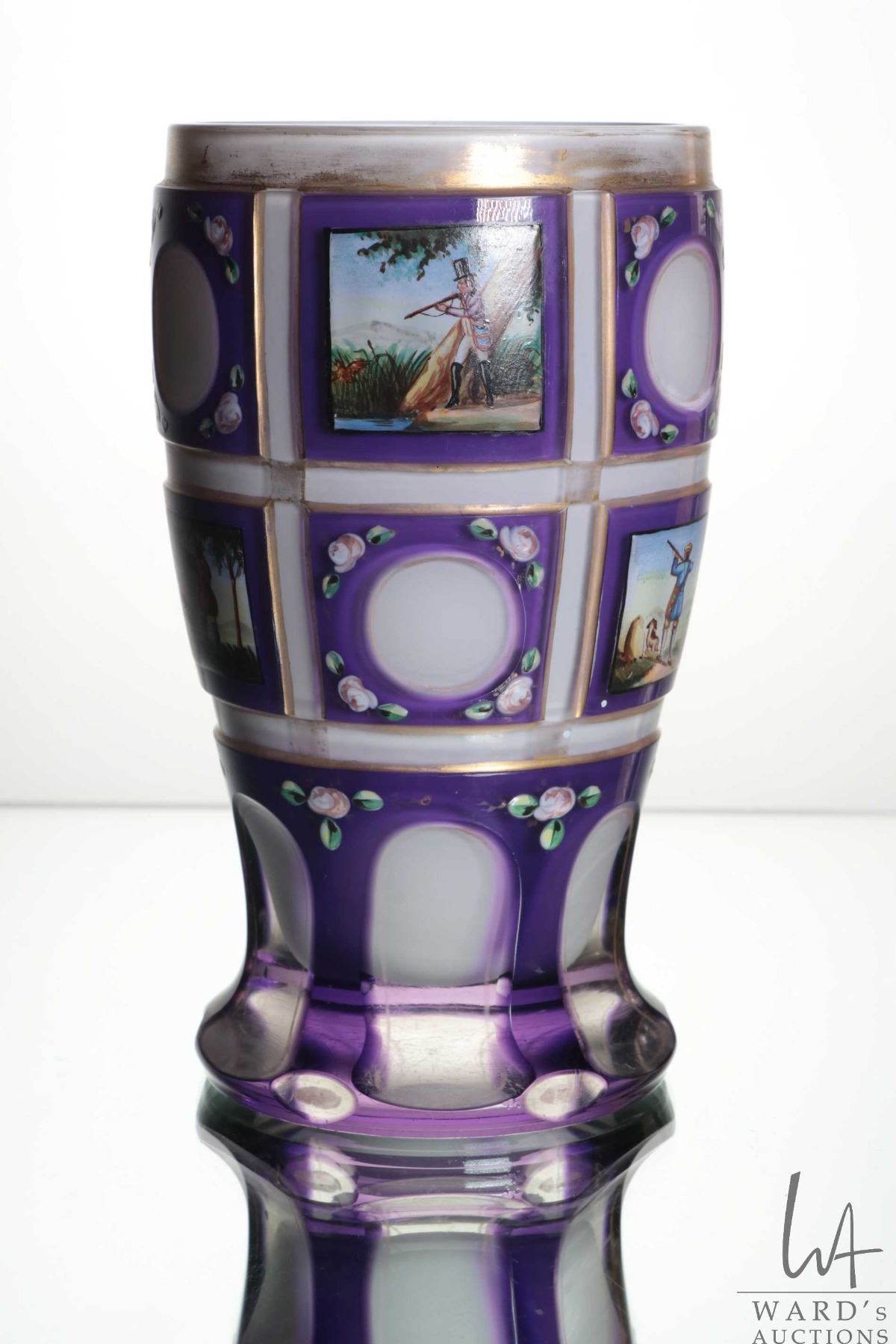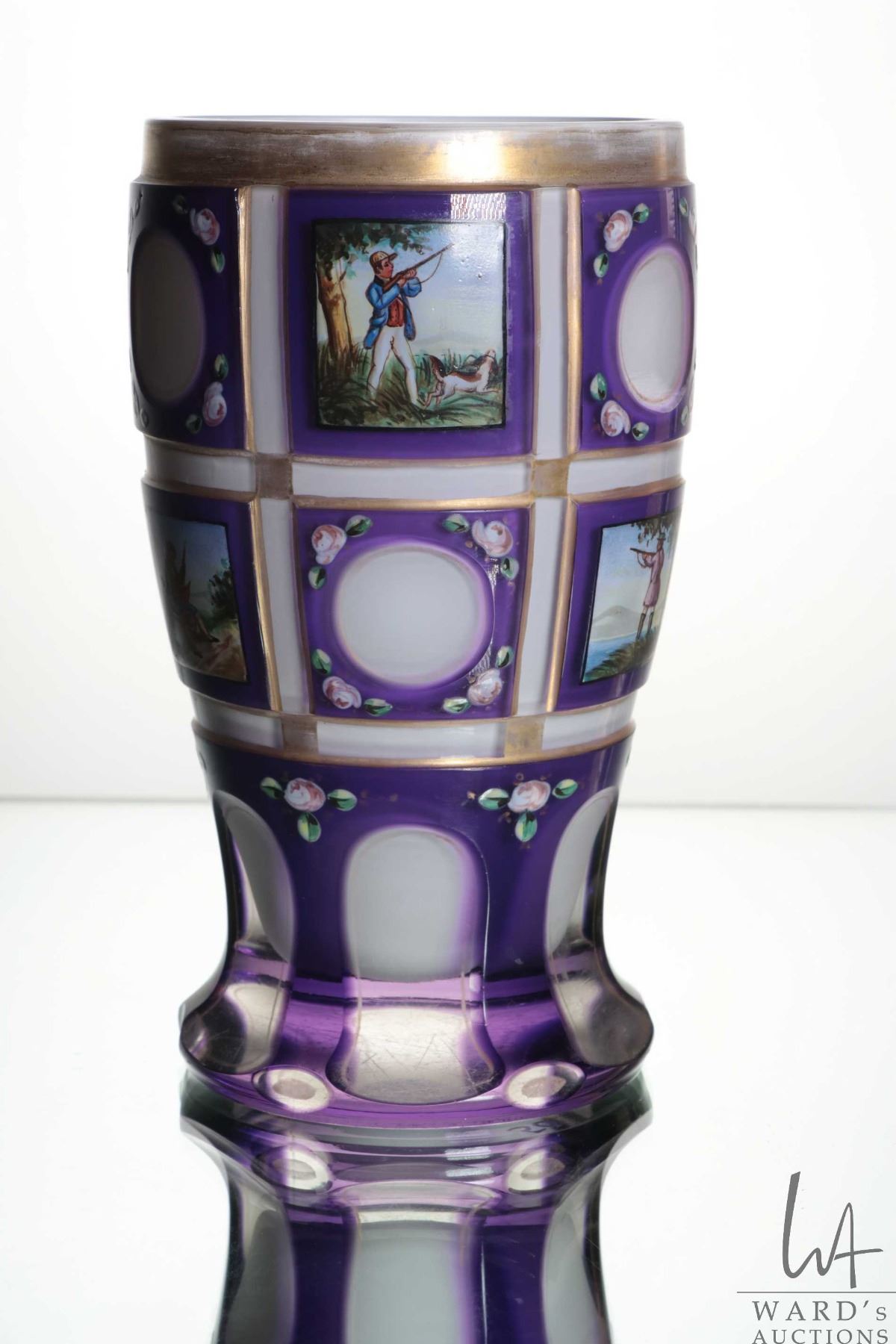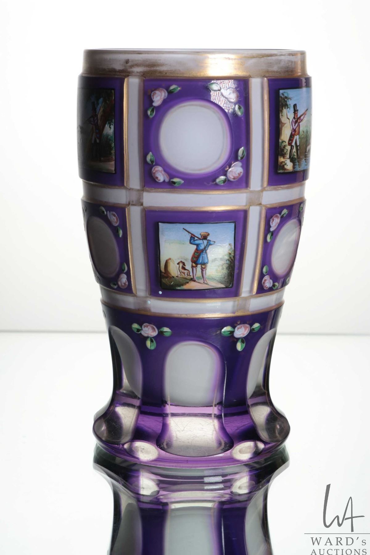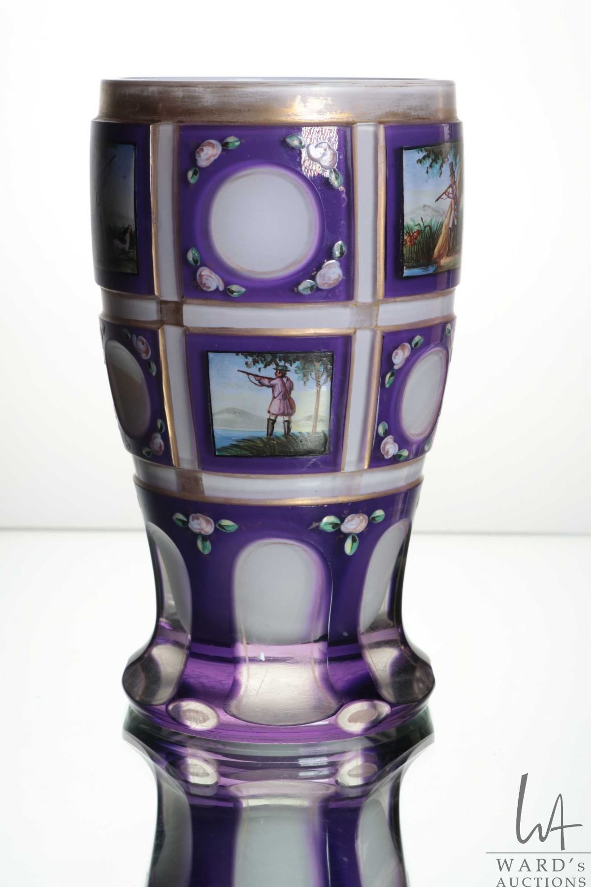Antique Bohemian cased glass beaker with purple cut to clear panels, milk glass lining and hand painted hunt scenes and decorative roses, some gilt overlay, circa mid 1800's, 22.5cm