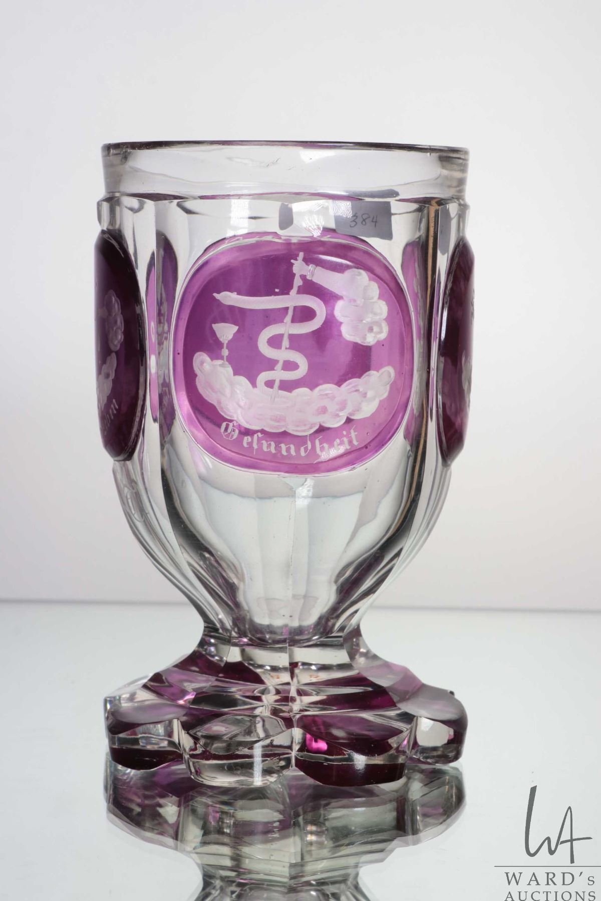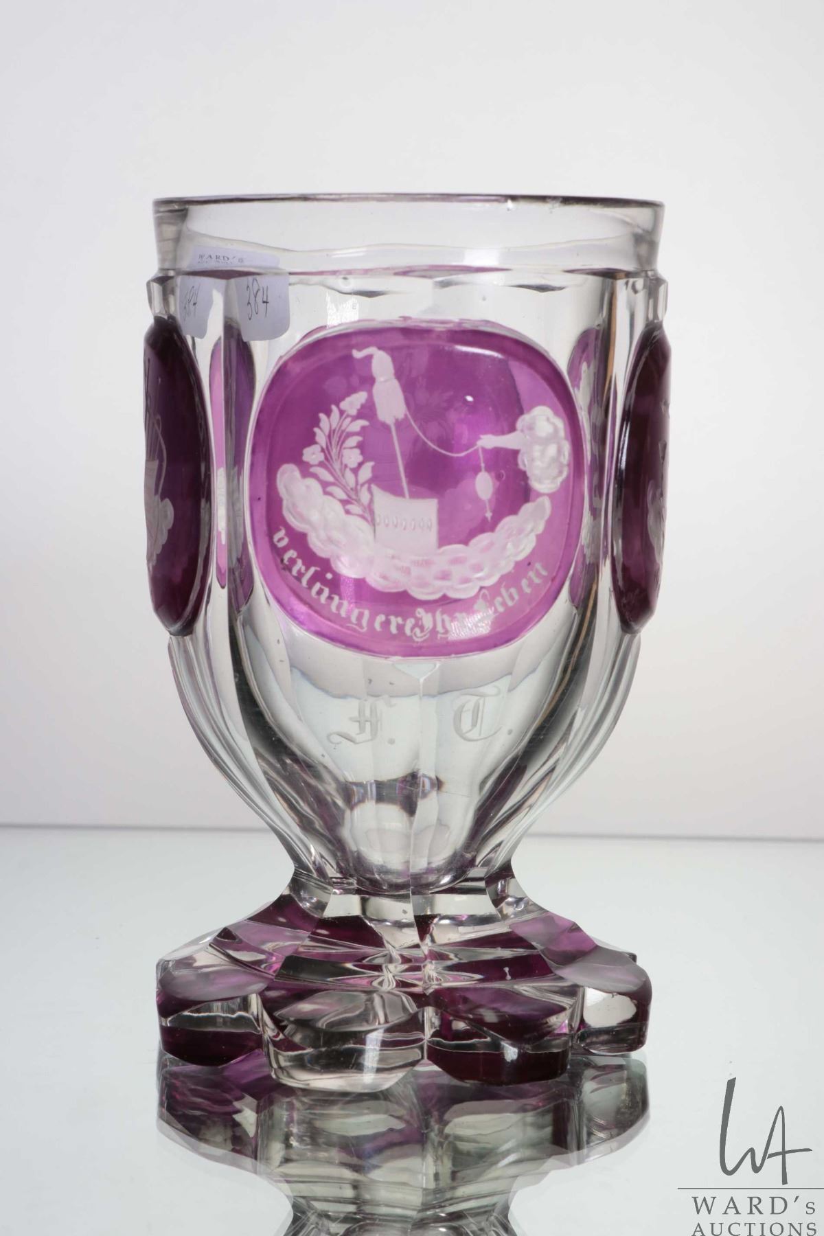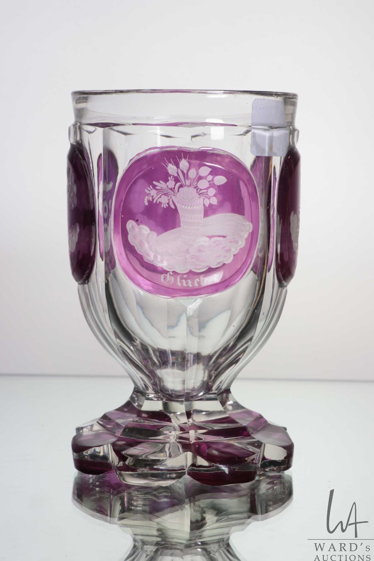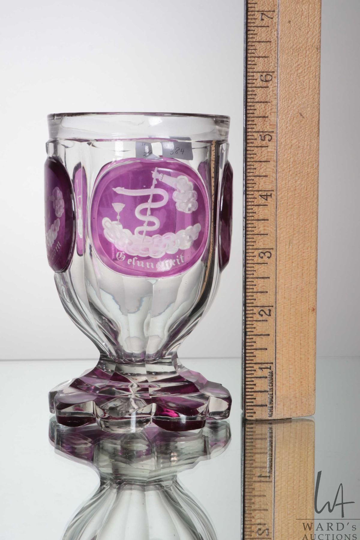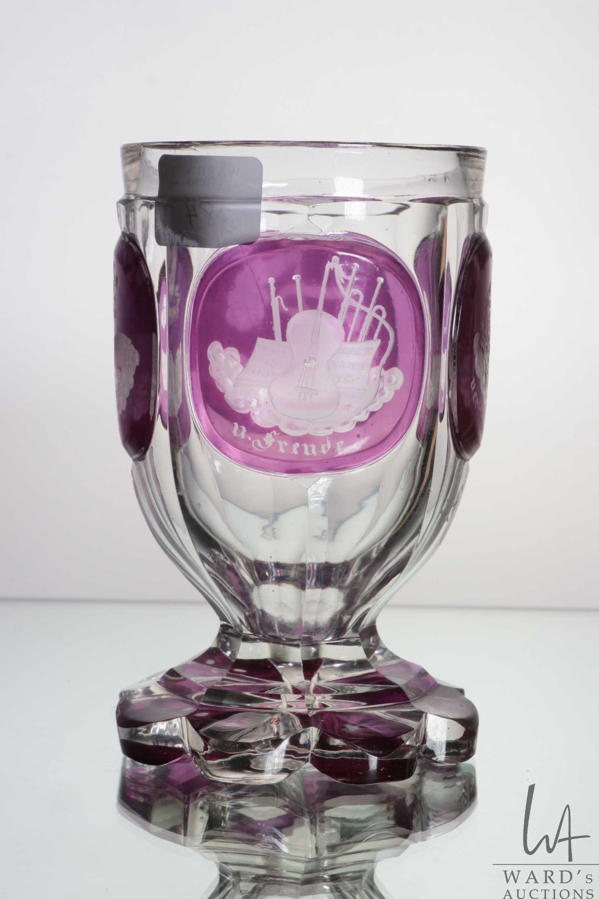 Antique Bohemian glass goblet with amethyst glass and etched pictorial panels and etched German language quotes which translate to "Prolong Life, finding happiness and joy", circa mid 1800's 13.5cm in height