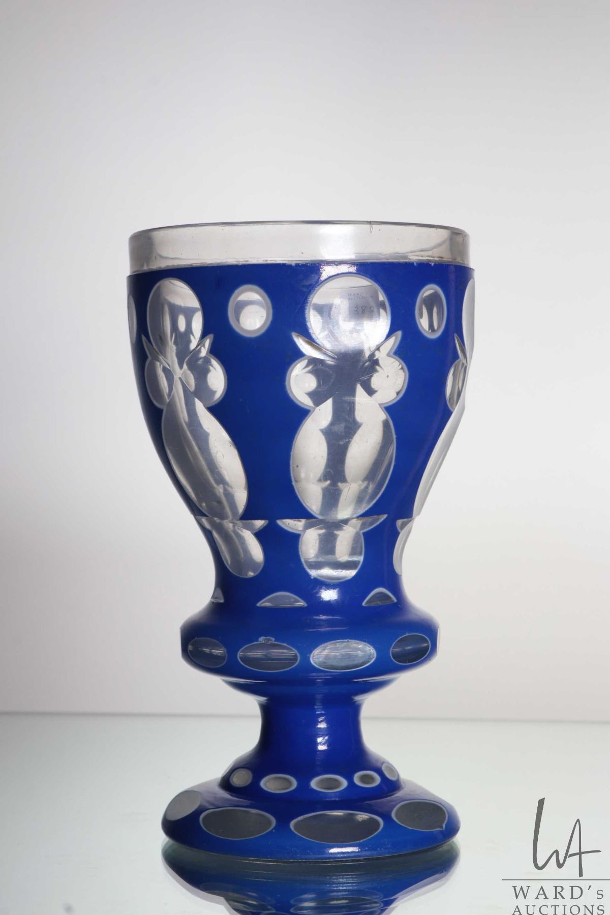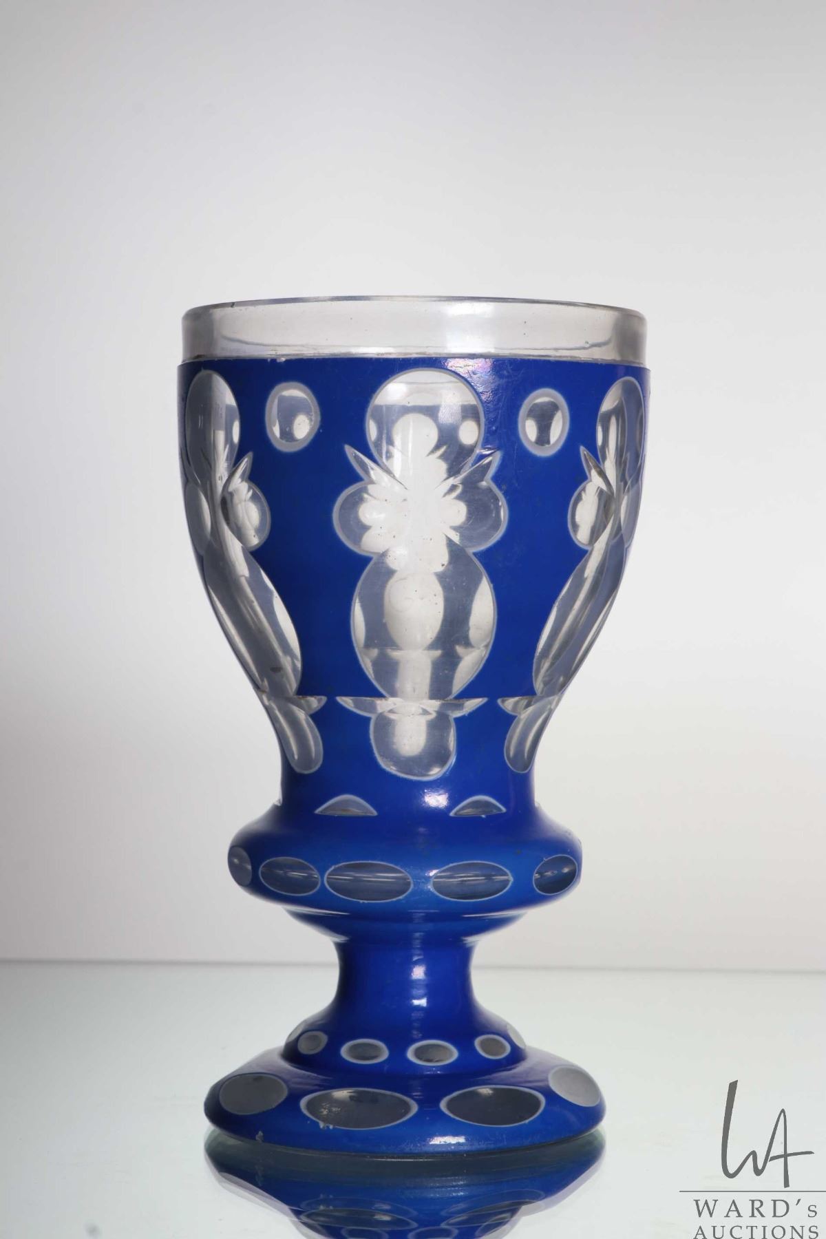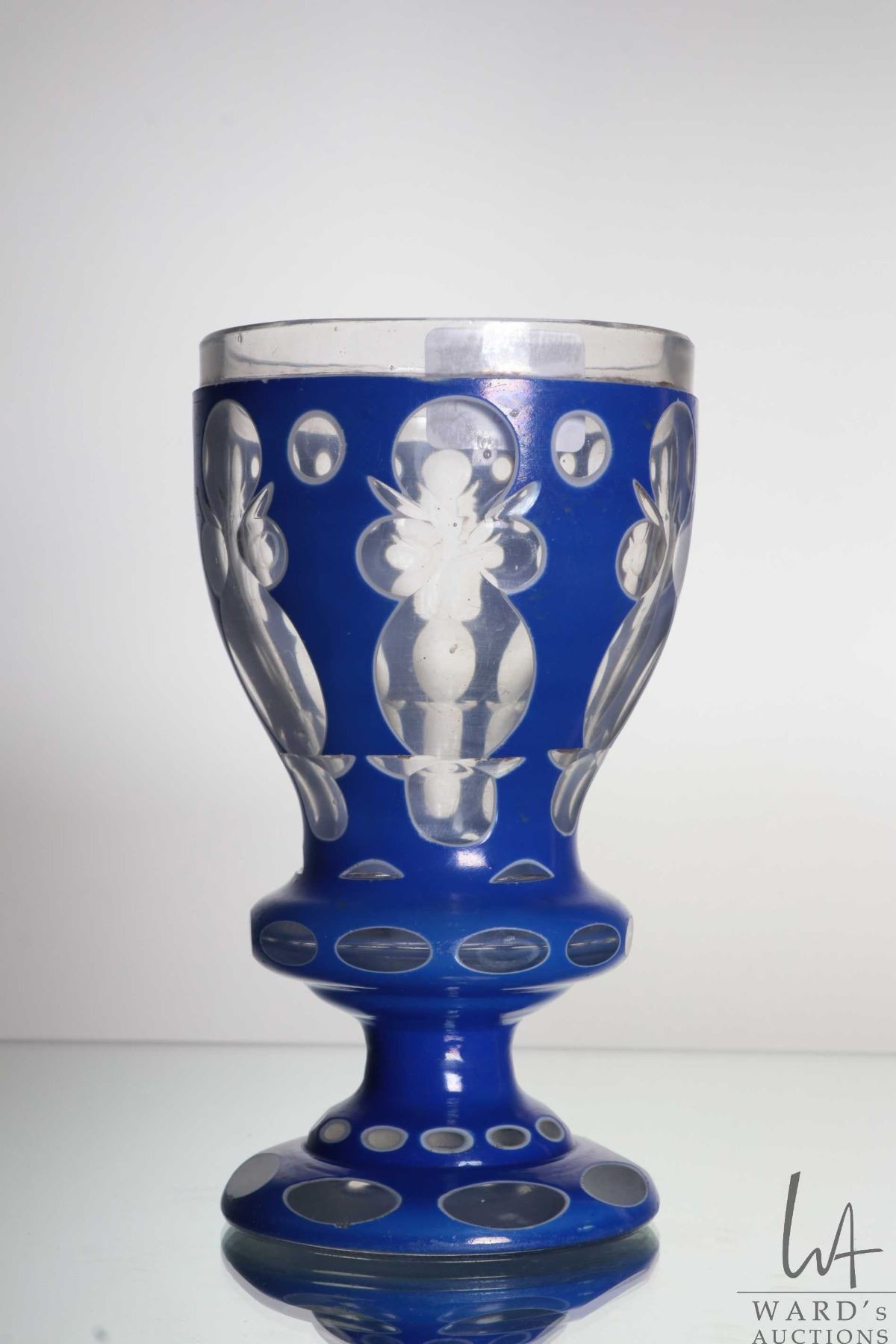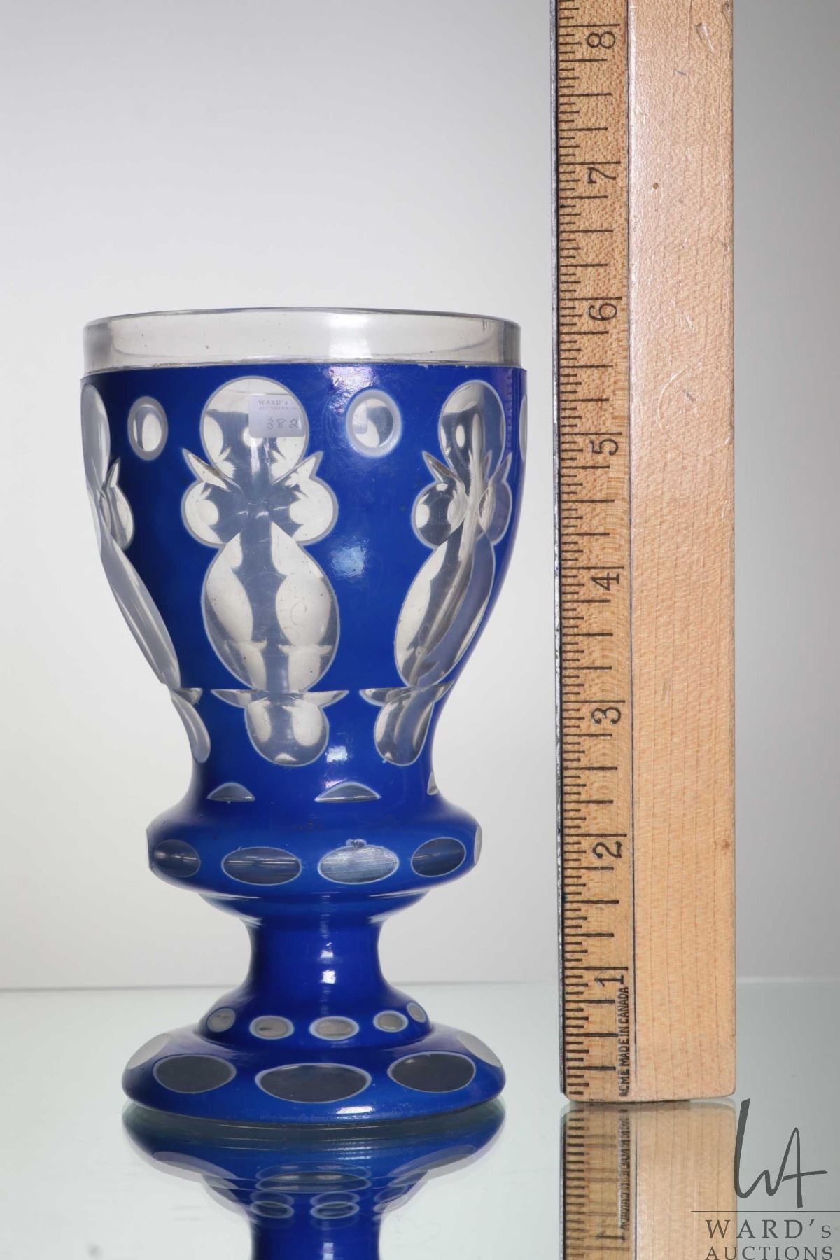 Antique Bohemian overlay cased glass beaker, with cobalt cut to clear wheel cut designs circa 1880. Note: once had hand painted gilt overlay, only faint traces remain, 15cm in height